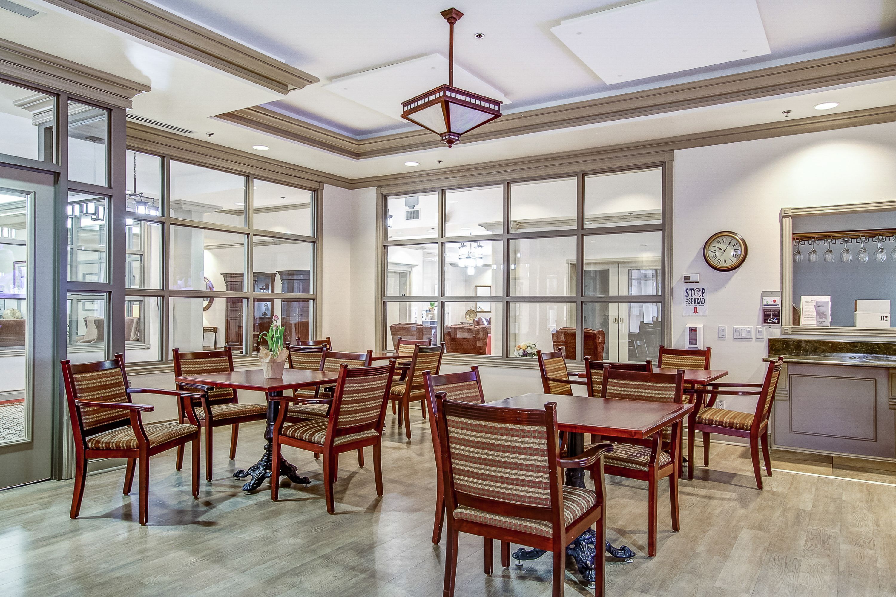 • Resort-like amenities including dining, library, wellness center, and indoor pool.