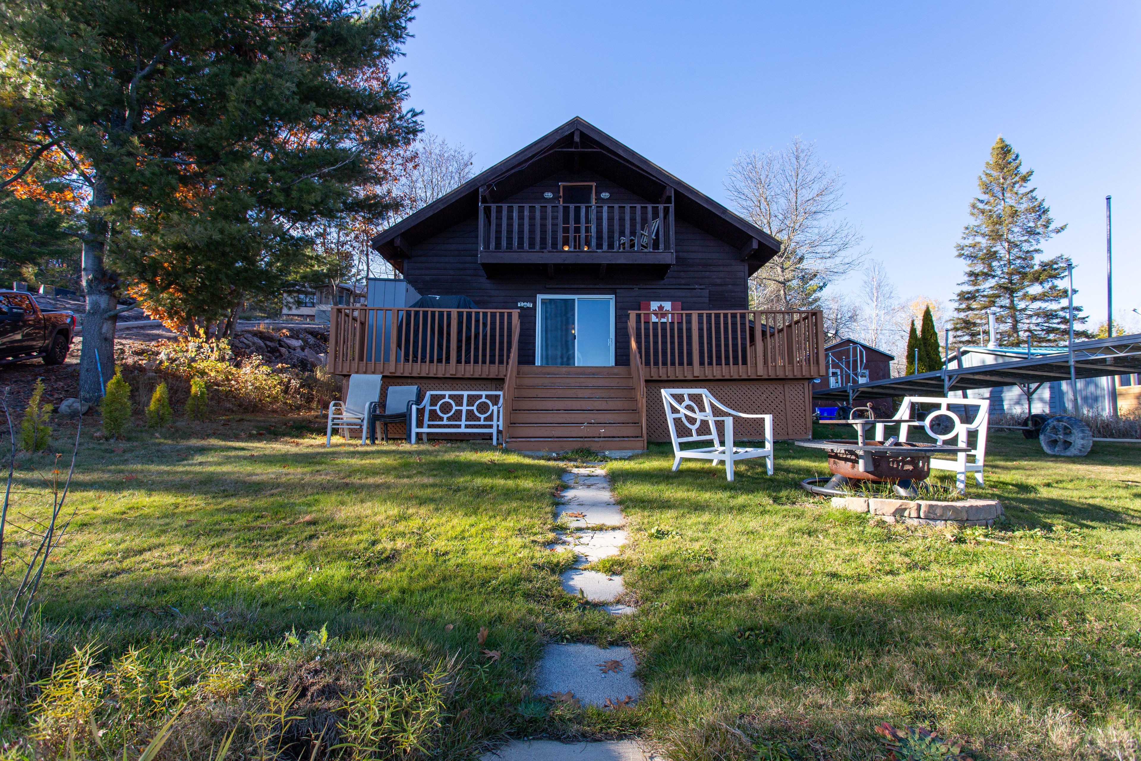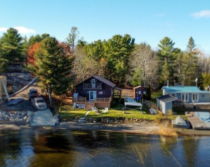 Live & love life on the river! Where? On the most exclusive waterway- in my french riviera! This location is steeped in history! Whether it's year-round living, a weekend cottage, or an investment property... This is it... And you deserve it! Our unique setting provides you with the most stunning views of 18 mile island and the blue, sparkling french river. Our a frame is steeped in rustic, cottage charm! The exterior and the interior features wood appointments throughout! As you enter the 1000+ sqft open concept living space, you are greeted by high ceilings, and patio doors that show off the waterfront view and leads out to the sprawling deck that stretches the entire length of the cabin. Here, everything is located on the main level and great for everyone of all ages! The second level has our second bedroom that is set up like a loft with 4 beds! There is a hallway that leads out to the top deck that is perfect for a morning coffee or an evening star gaze! Our cottages components are comprised of a septic system, lake water intake and heated with baseboards. The site comes fully conveyed, fully furnished and with a newer automatic generator system for back up! What more could you need? Perhaps a guest bunkie? Yes, we have that and it has hydro and its own deck space. We have 70ft of waterfrontage on an acre of land and a highly desirable, sandy beach! Yes, a rare feature! There is also a solid aluminum dock that easy rolls in and out providing a space for your boat to tie up to or a set of chairs to enjoy your view! Retirement or recreation - come, and we will embrace you with open arms! More info? Our lot is accessed by a shared laneway with the neighbor to the property. The fishing is outstanding, muskie, bass, drum, and walleye abound! You will have to look hard to find a site like this... At this price! It's not enough to have the dream... Ultimately you must live it!! *see my website for further information*