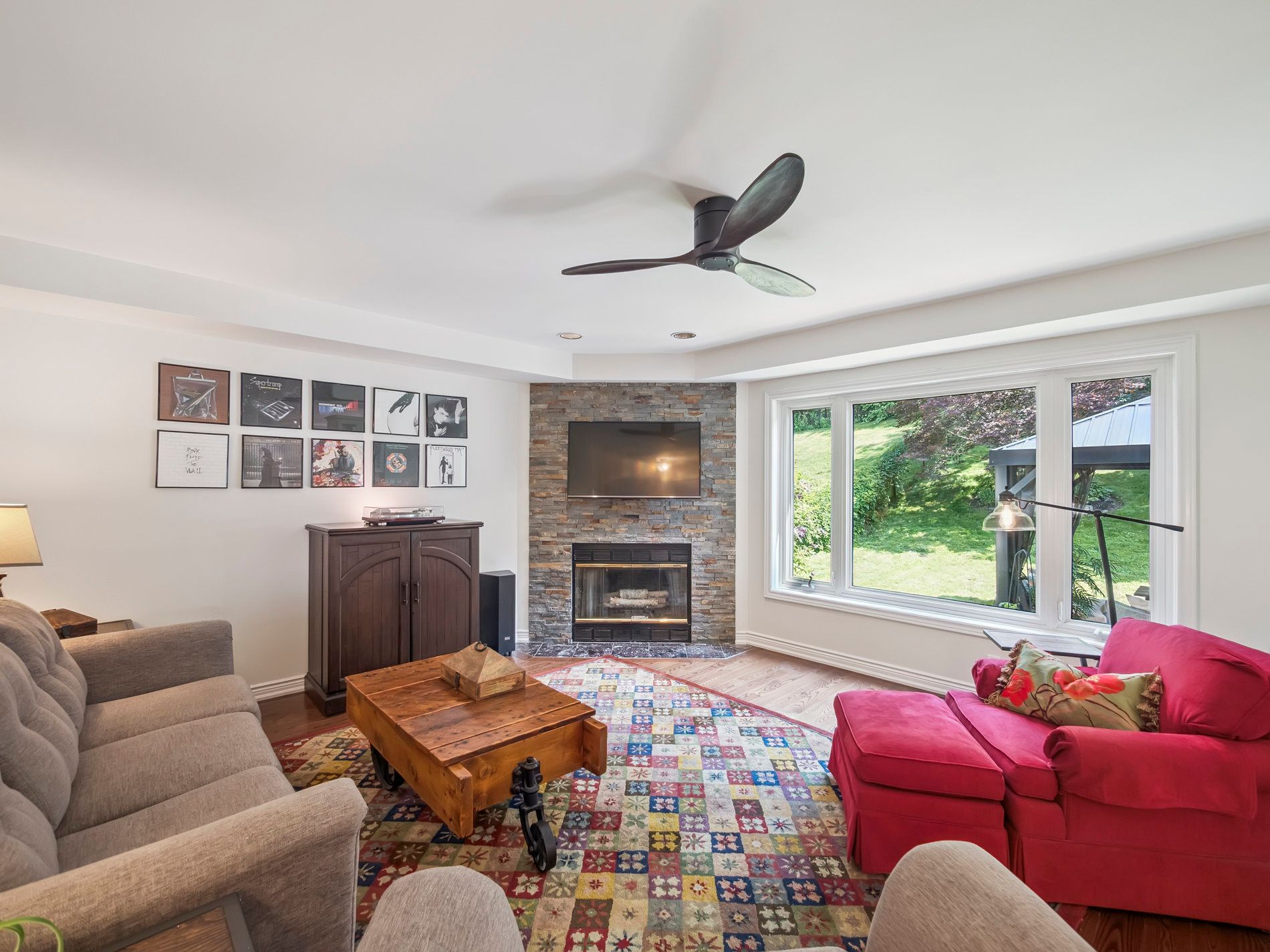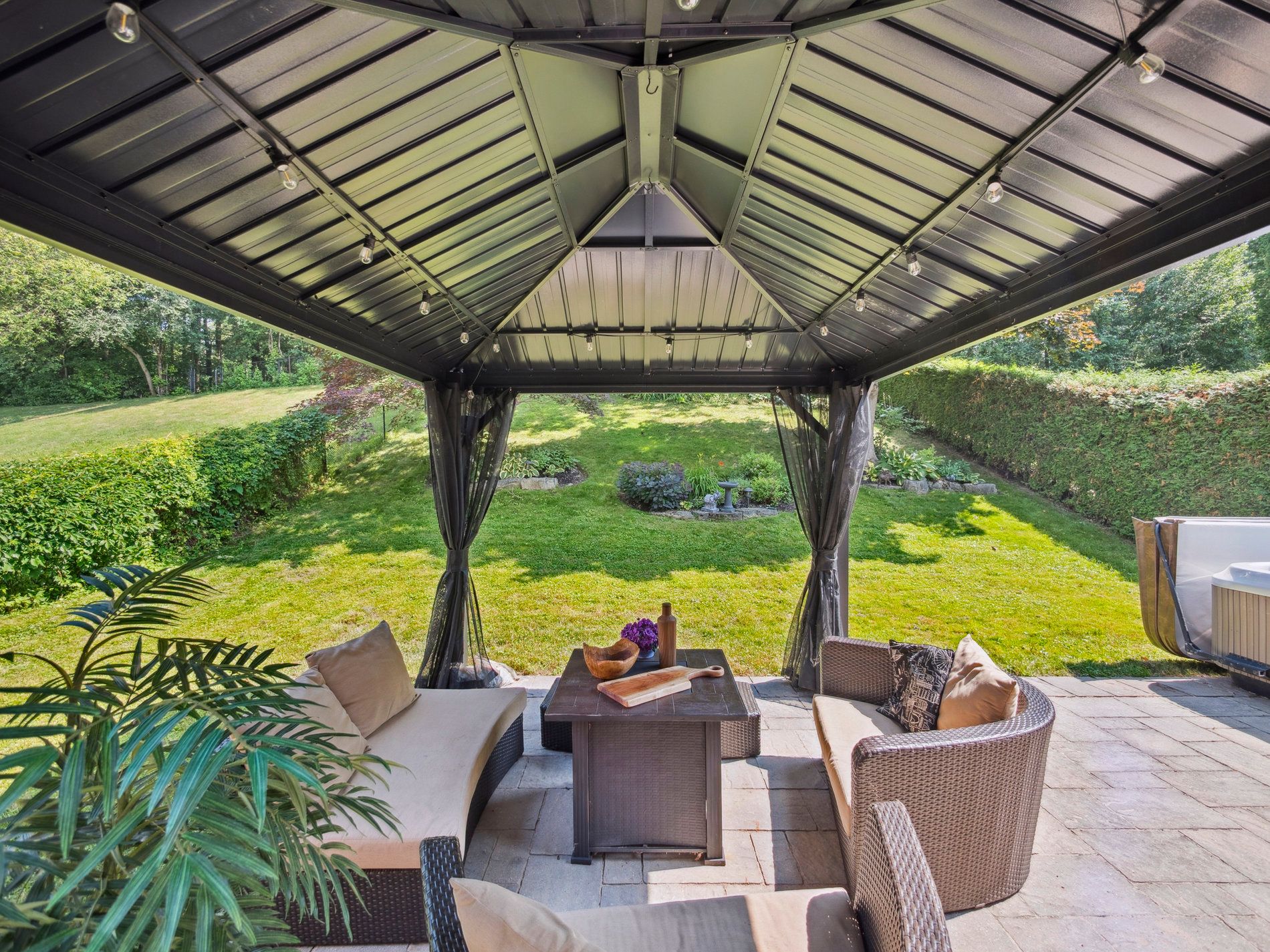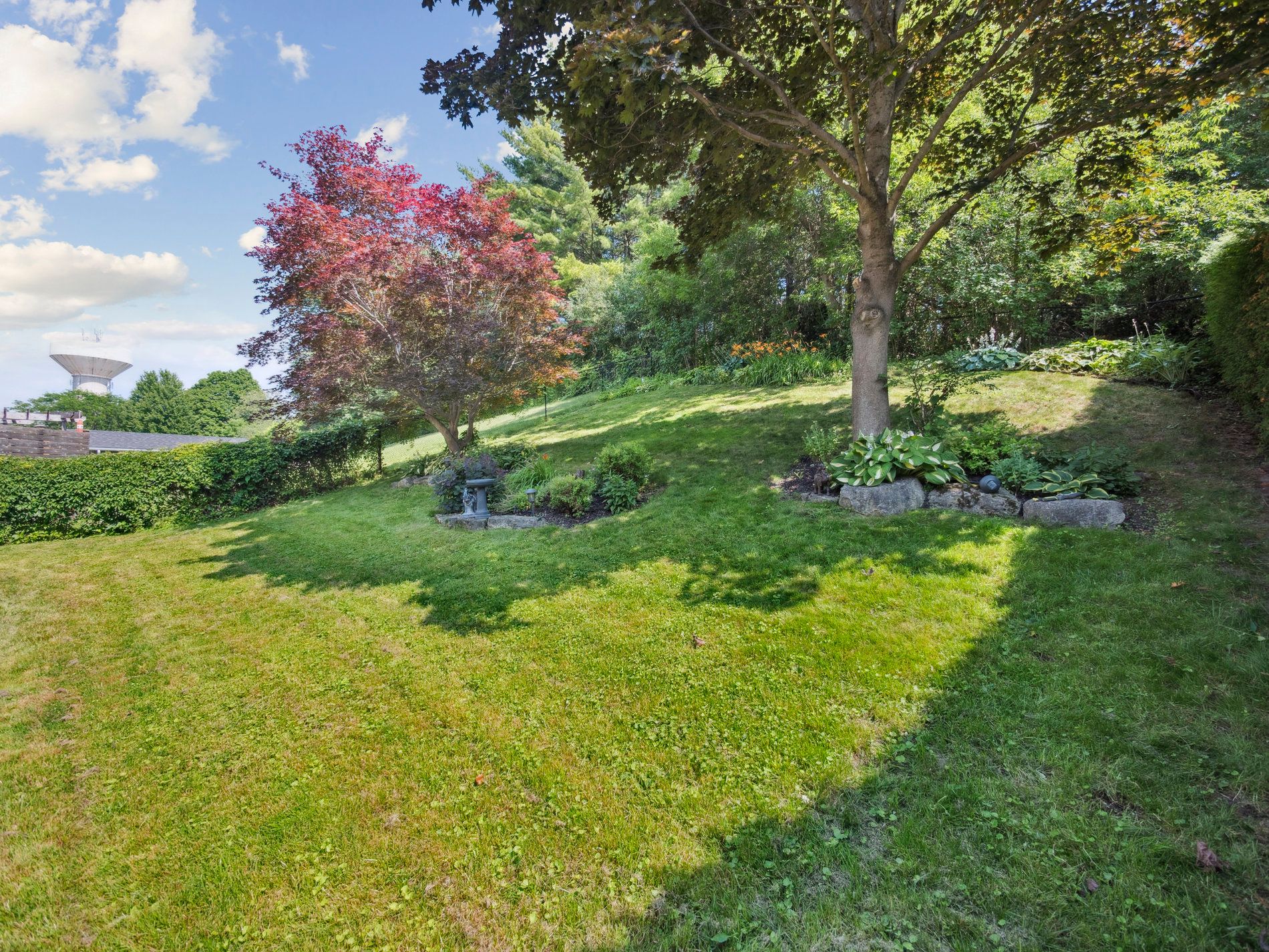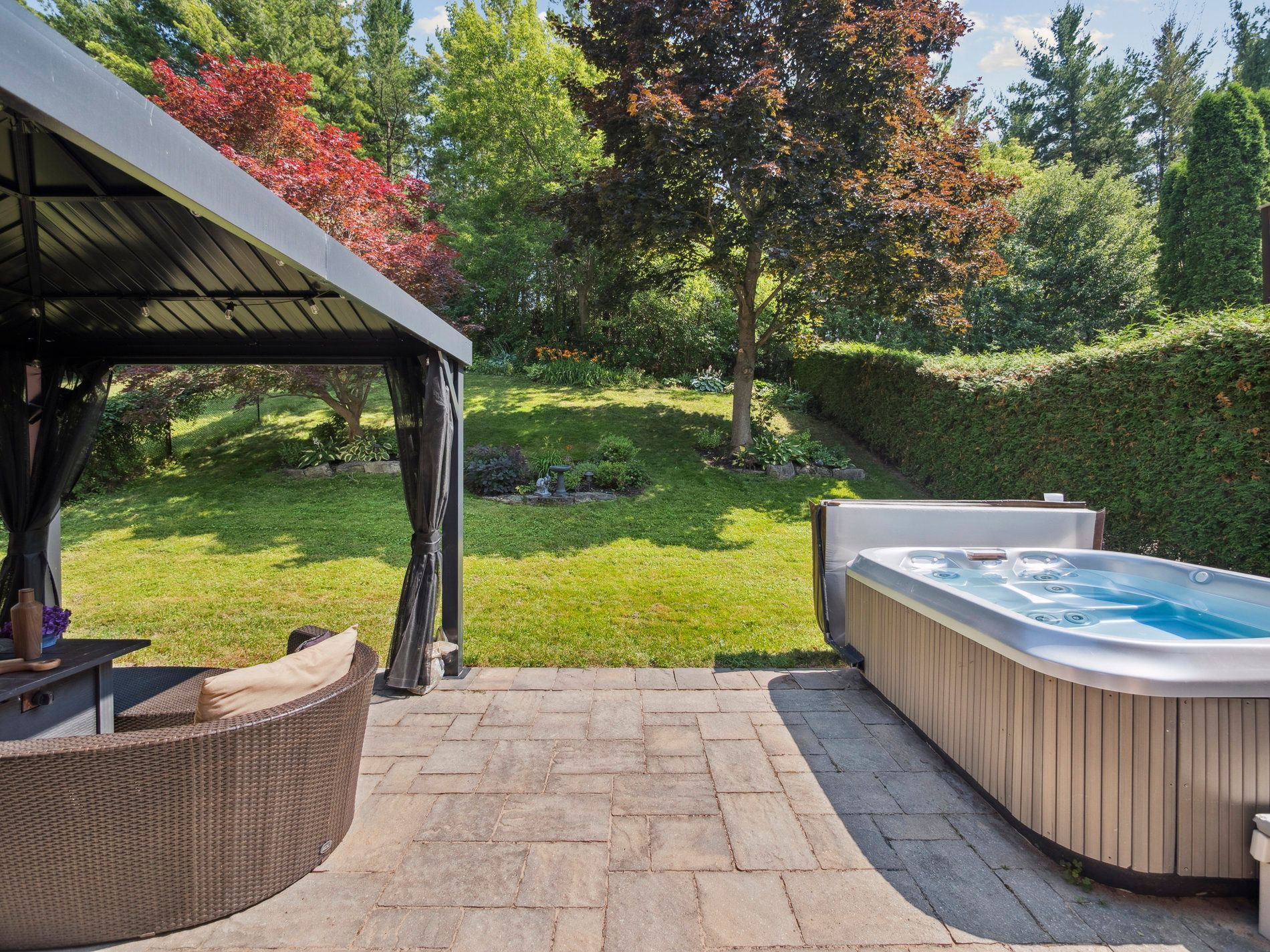 • Backyard offers a serene stone patio and lush greenspace for relaxation.