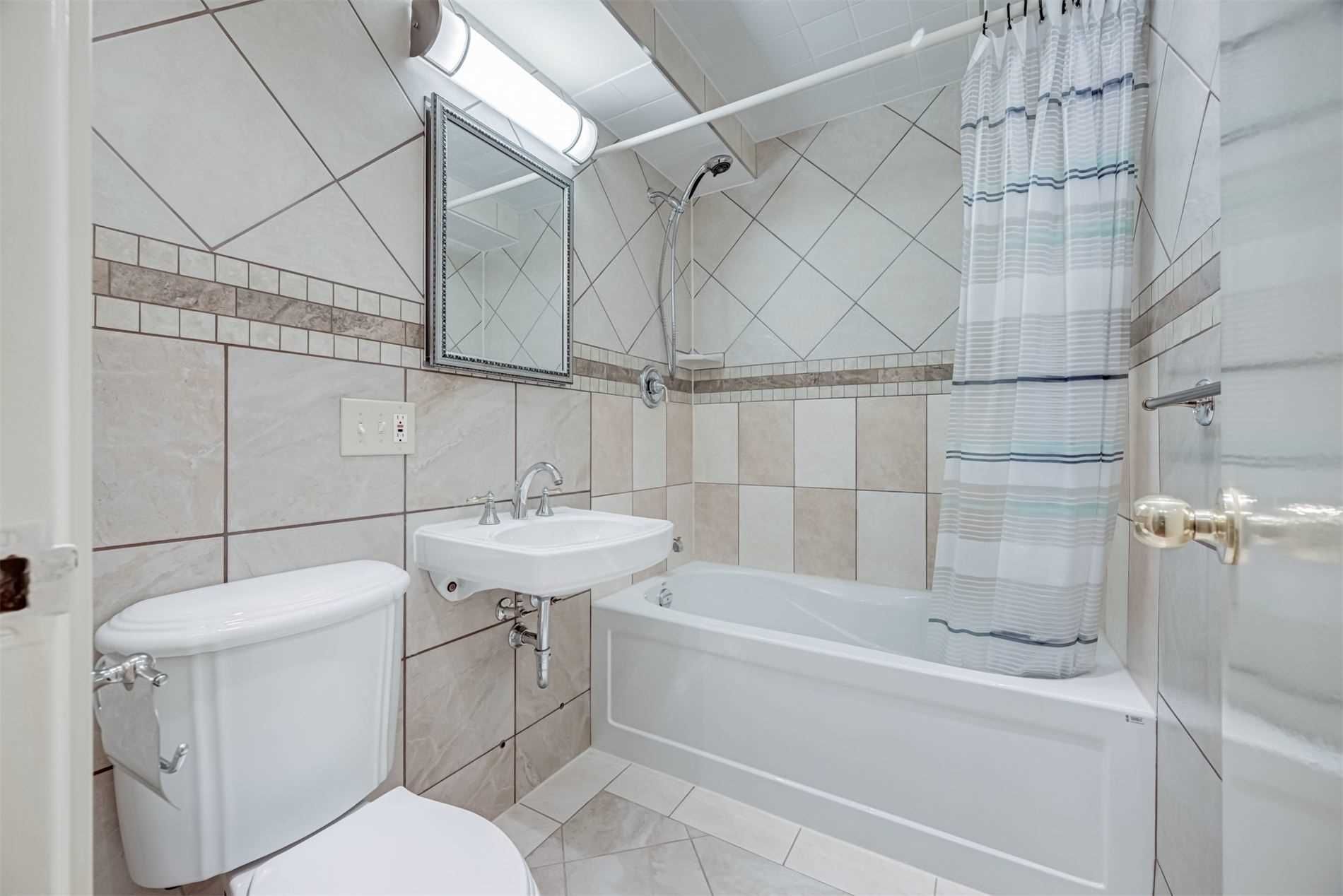 • Renovated bathroom with high ceilings and pot lights adds modern appeal.