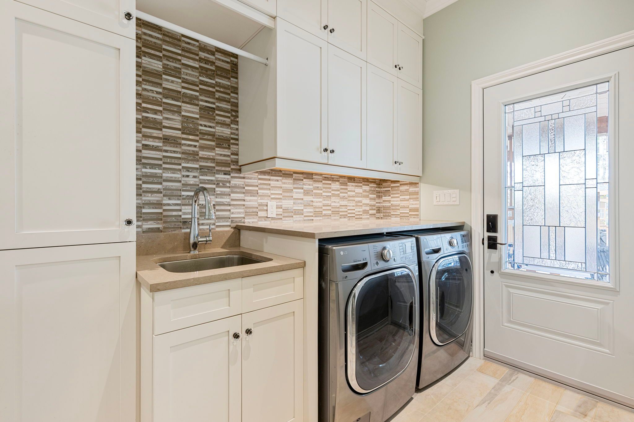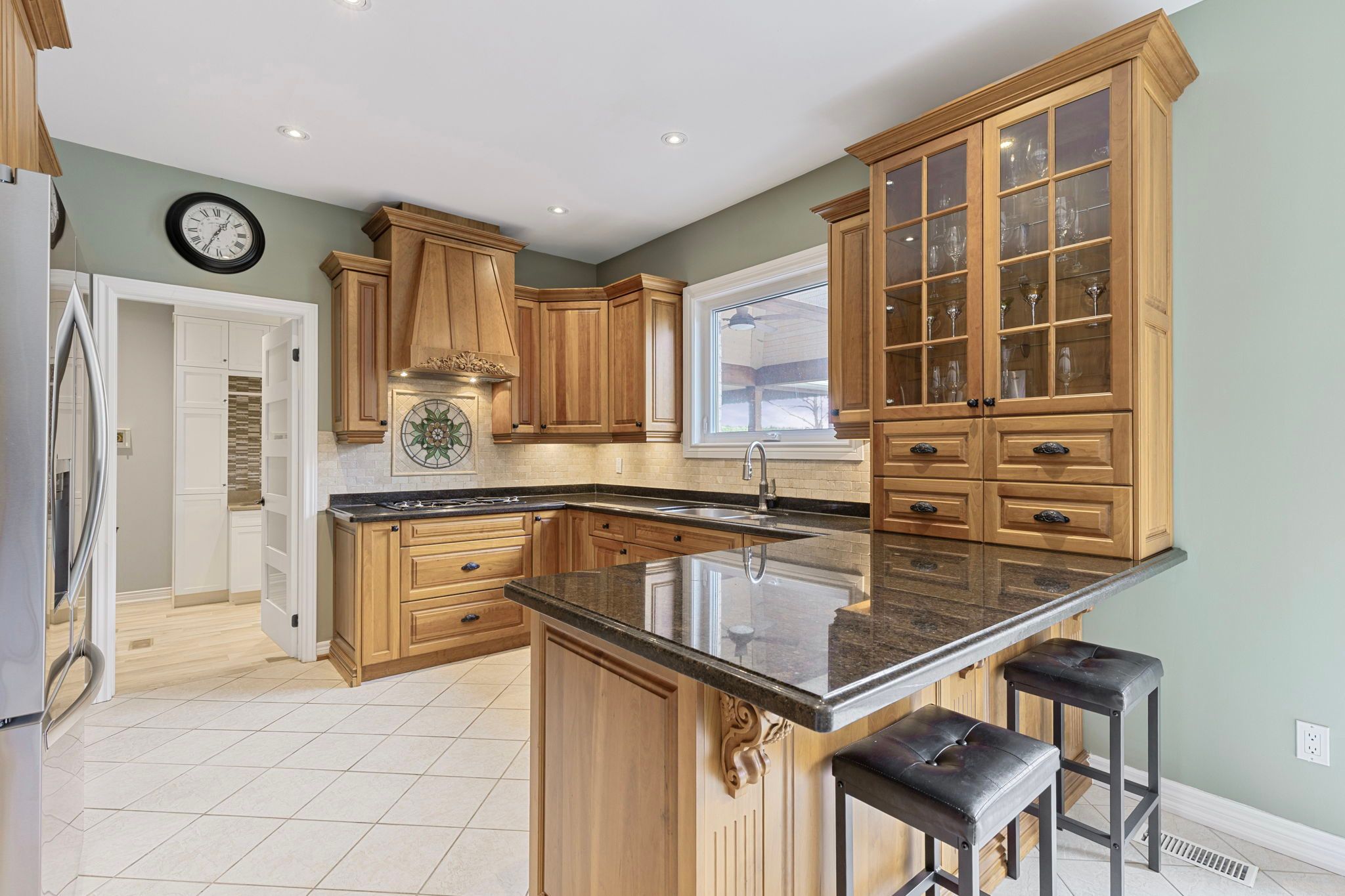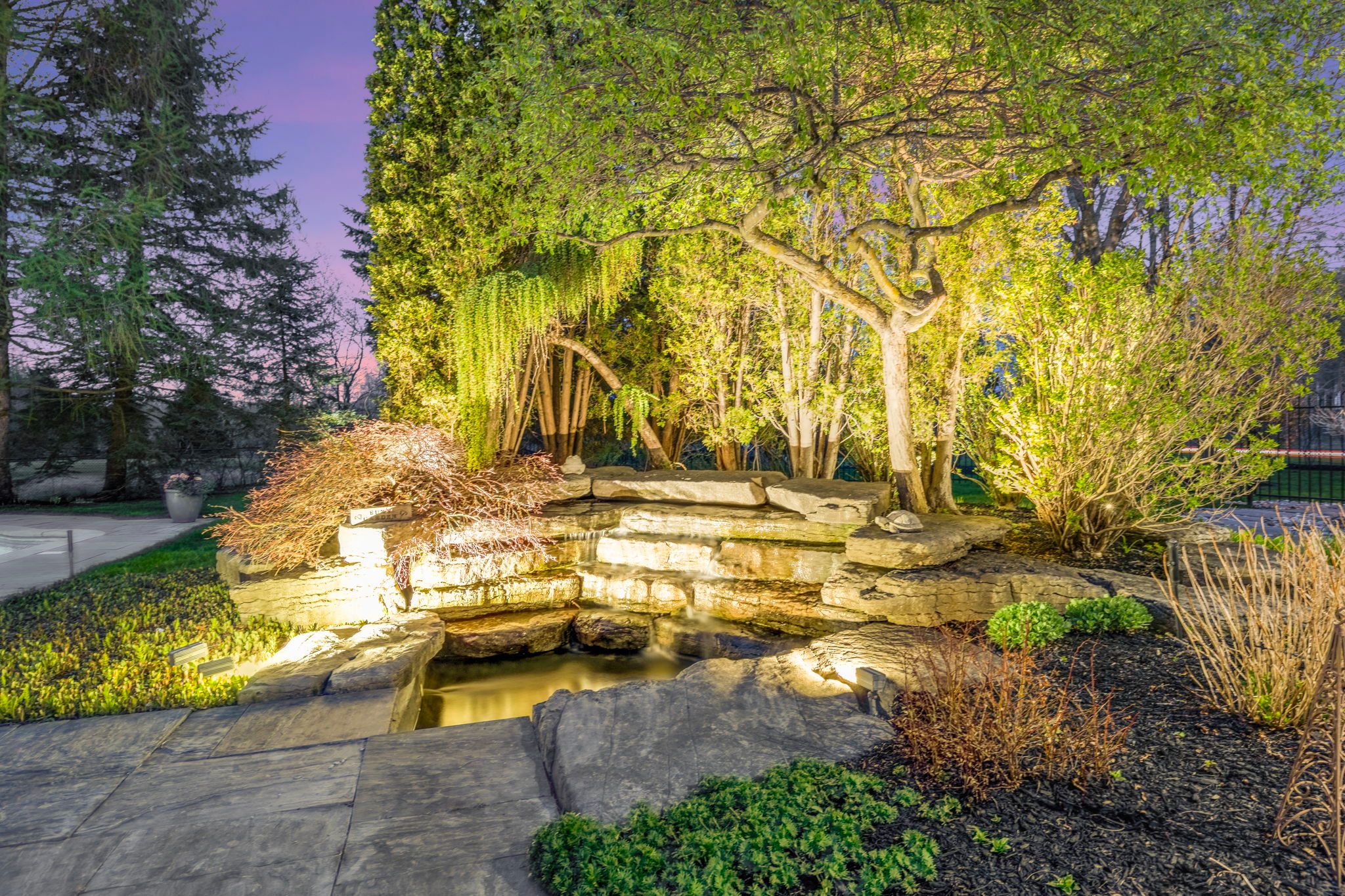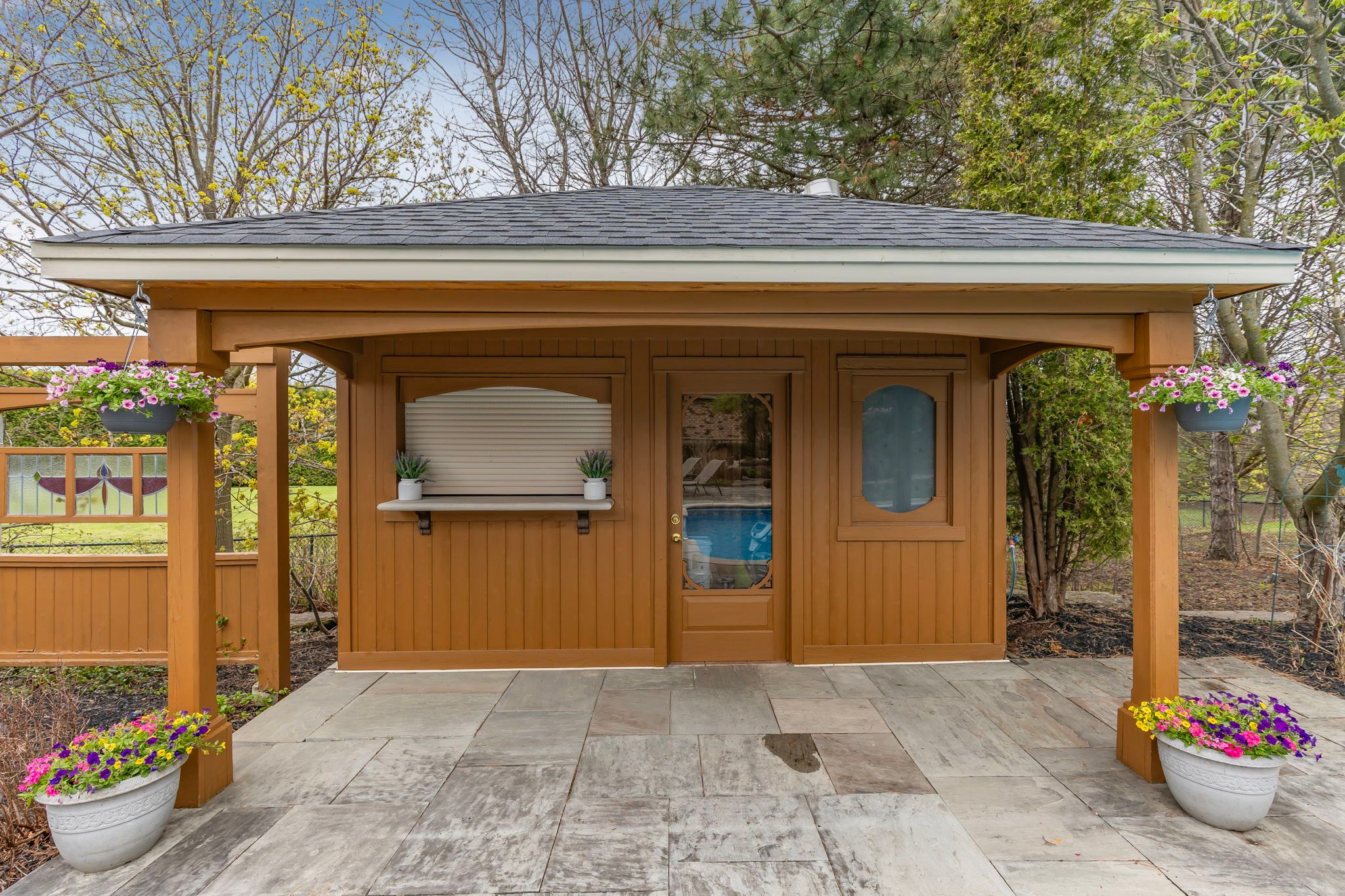 • Private backyard oasis with a pool, waterfall, and outdoor kitchen.
