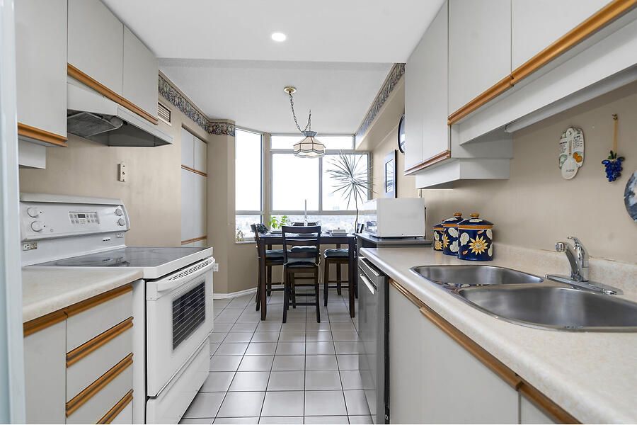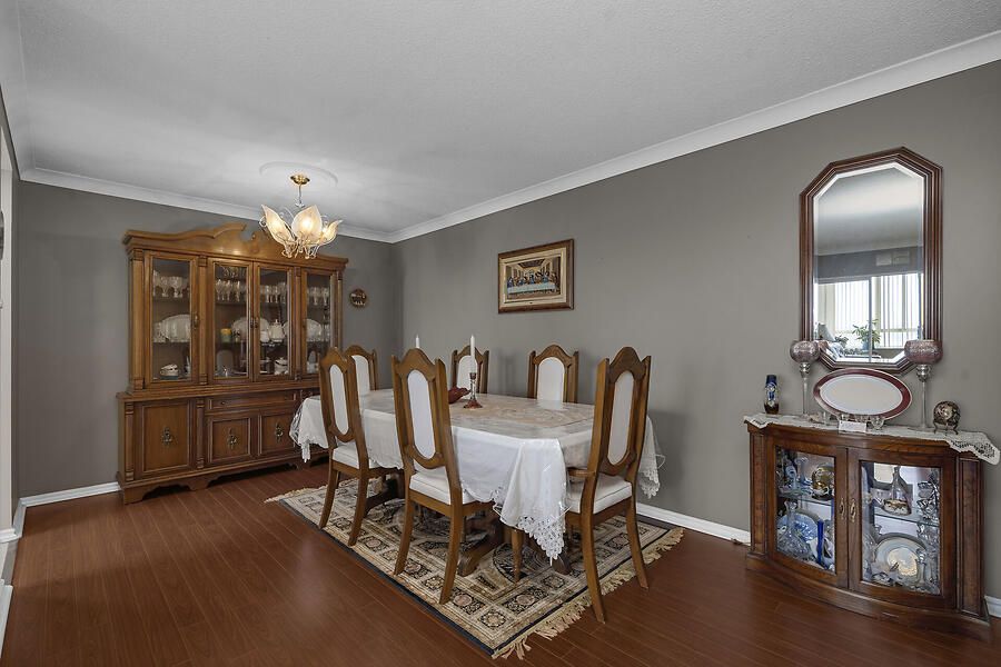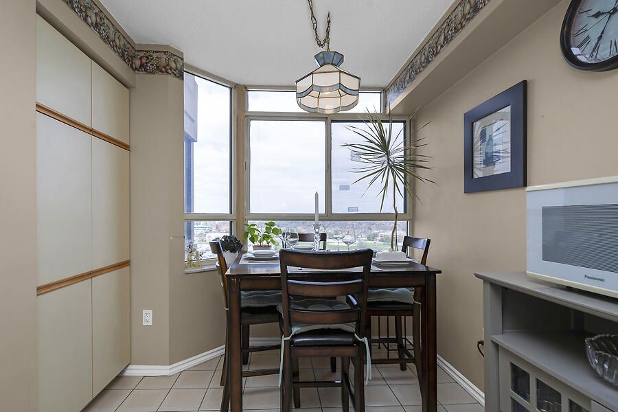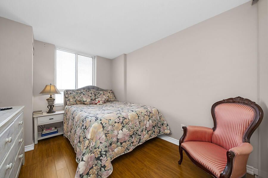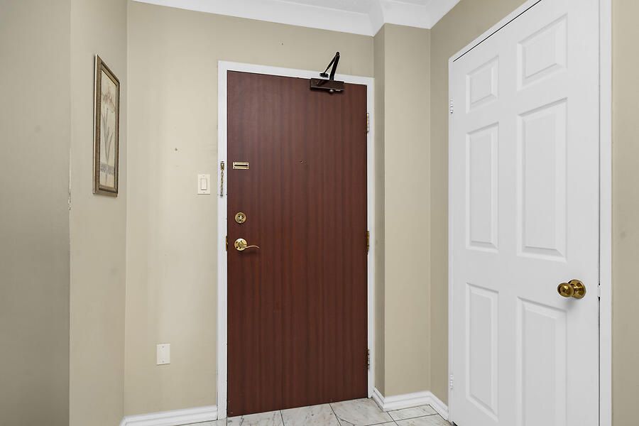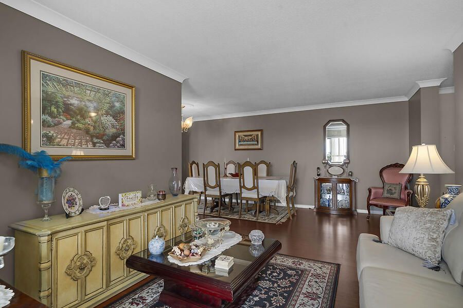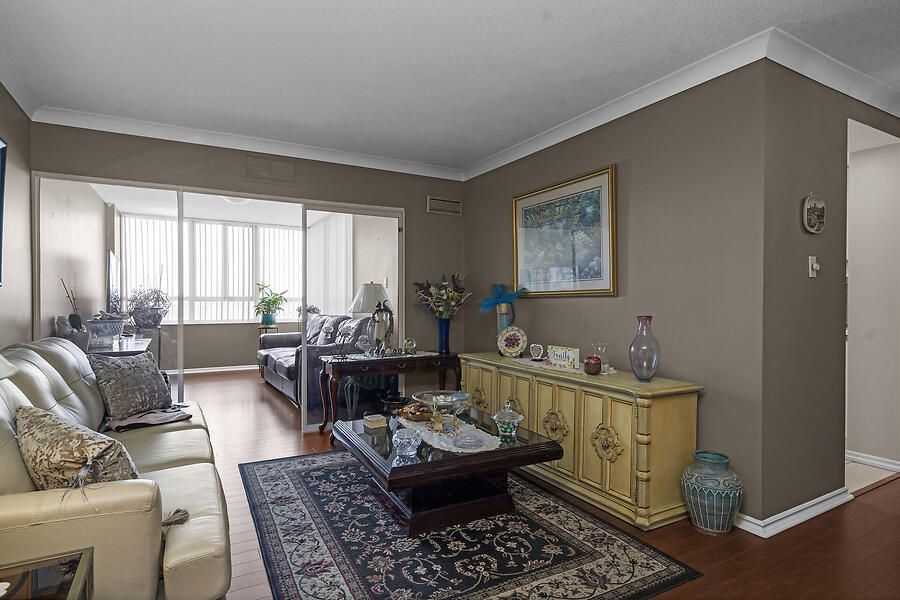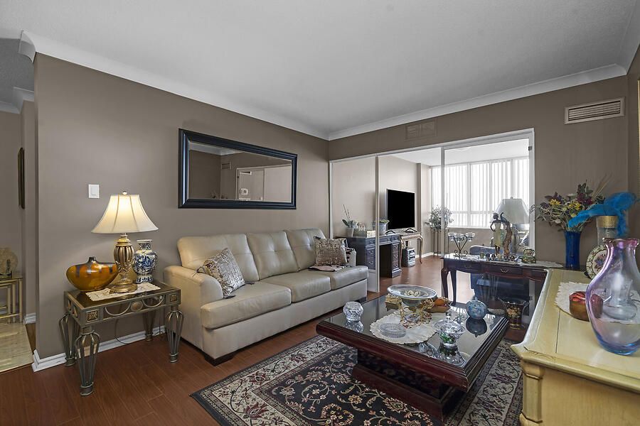 Rarely offered, bright & spacious condo in a highly sought-after building! This move-in ready 2 bed+ den, 2 bath layout is one of the largest in the complex, features laminate flooring, open-concept living with crown moulding, and a sun-filled solarium. Well-designed kitchen with a breakfast nook and ample counter space. Primary bedroom with ensuite and generous closets. In suite laundry for added convenience. Walk to shopping, restaurants, transit; ideal for professionals, downsizers or small families!