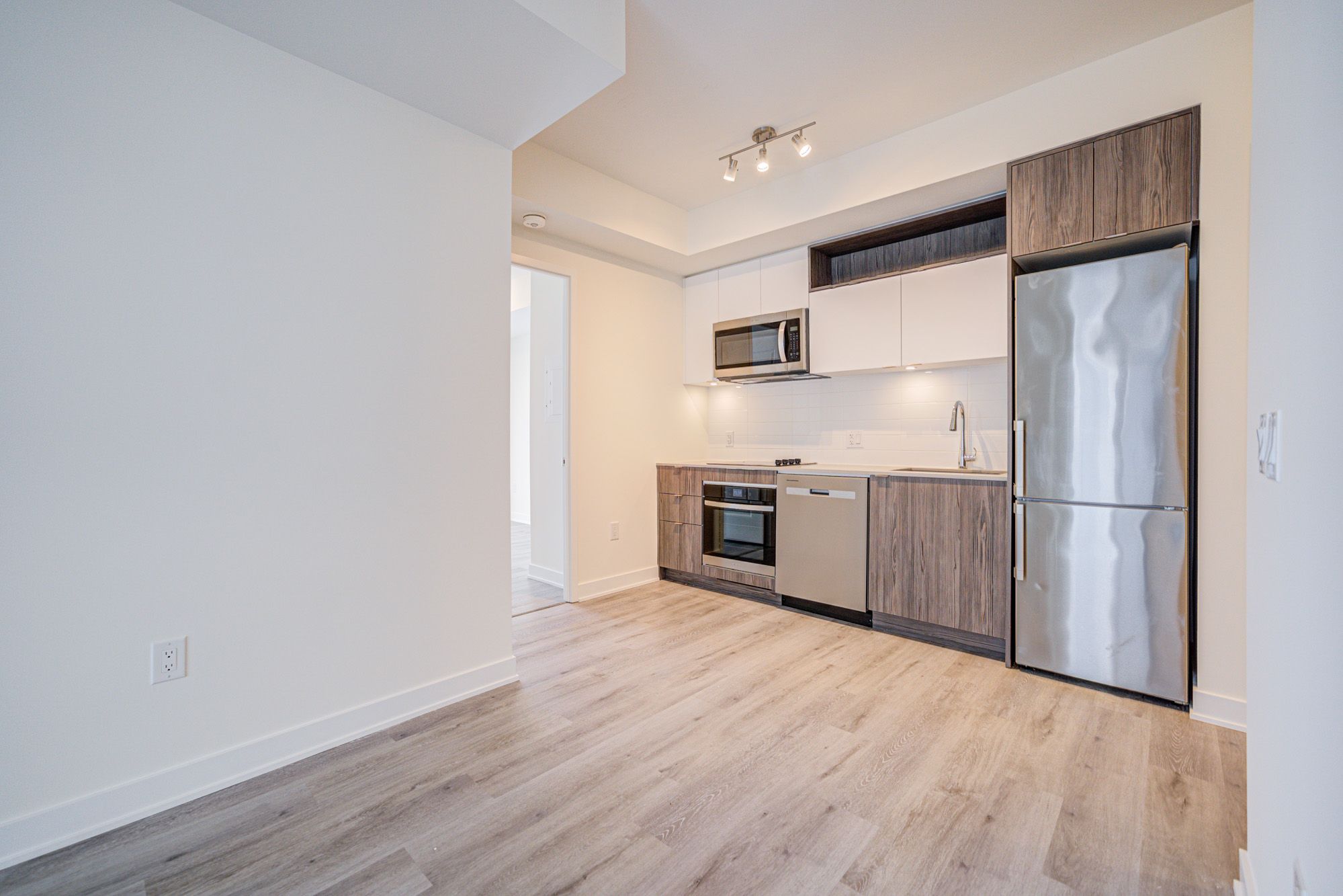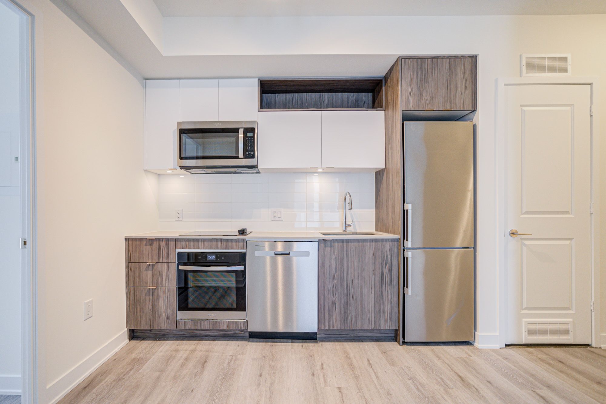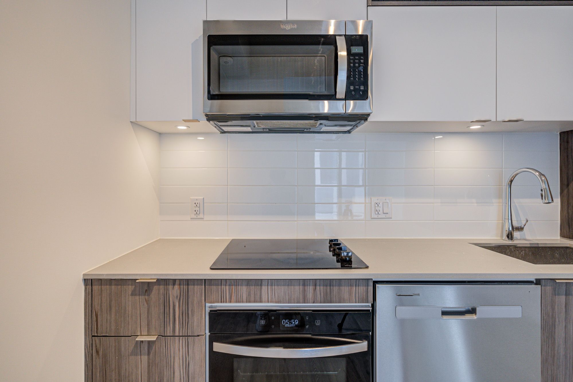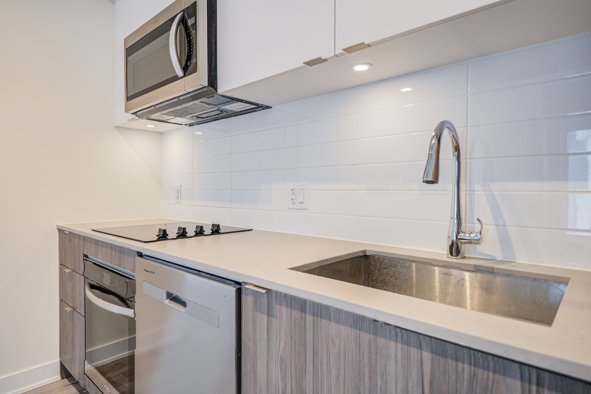• Modern kitchen with stainless steel appliances and quartz countertops.
