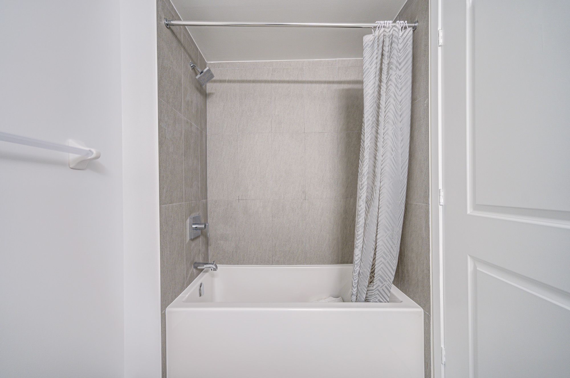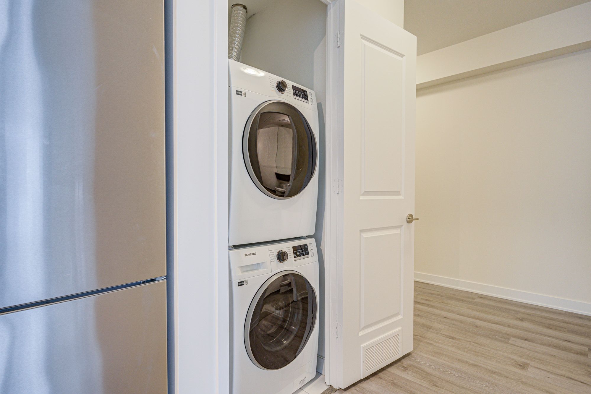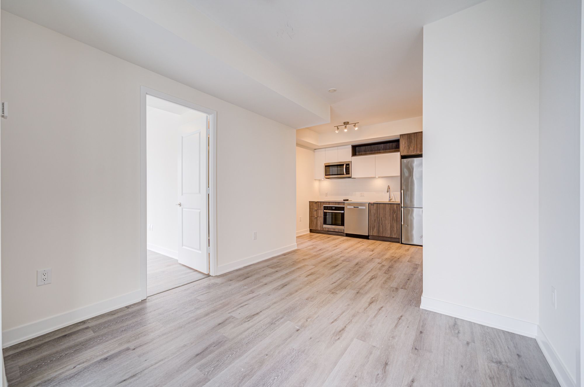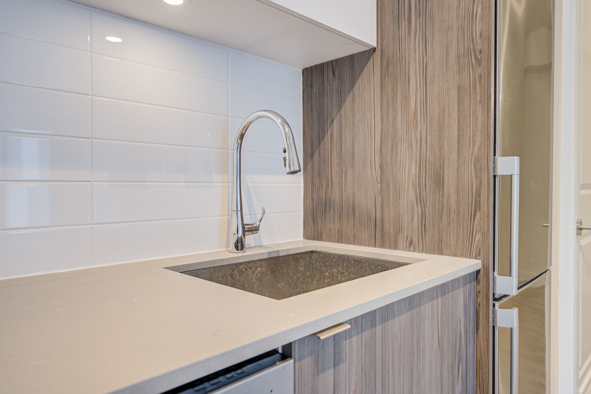 • Modern kitchen with stainless steel appliances and quartz countertops.