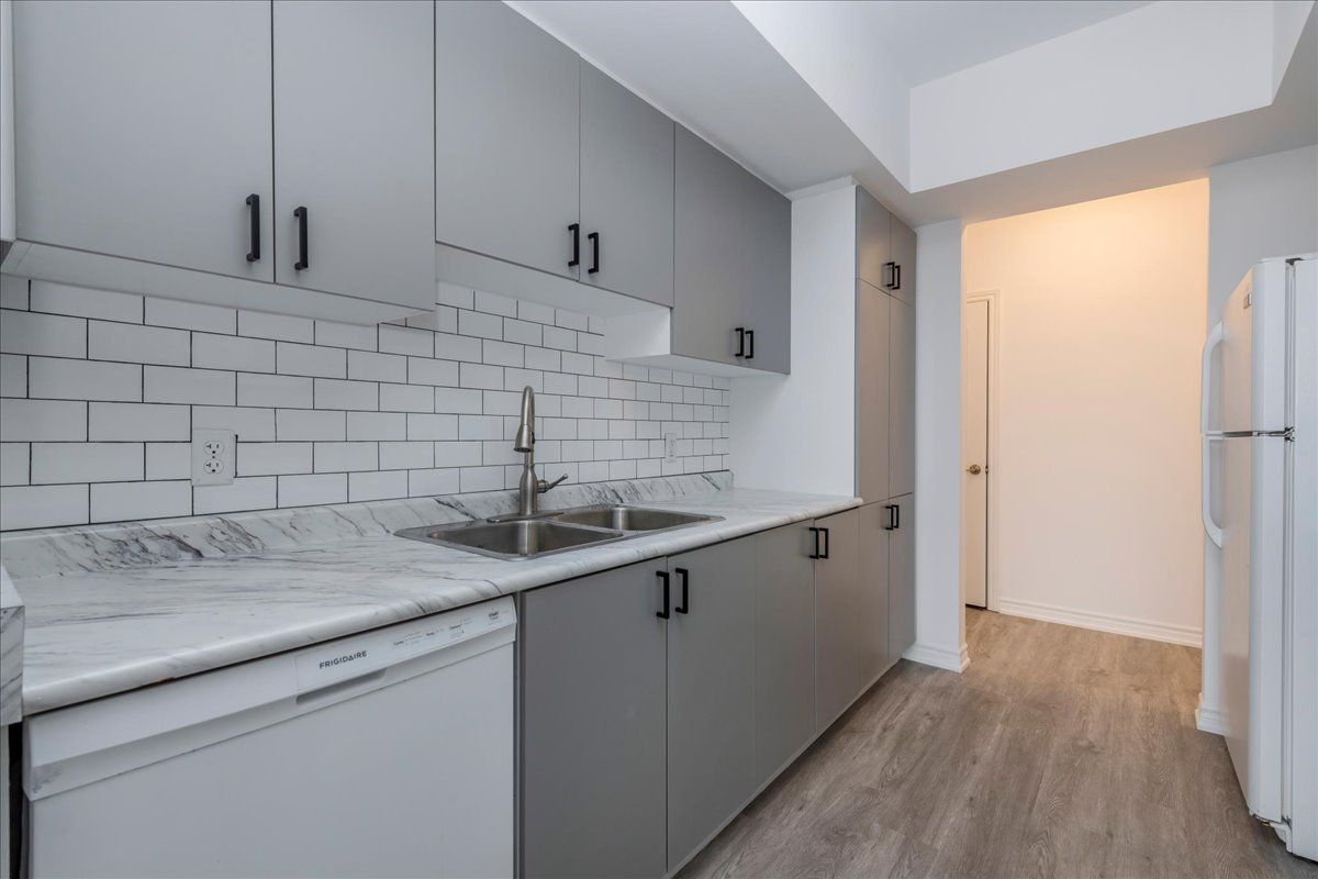 • Stylishly updated galley kitchen with modern cabinetry and classic tile backsplash.