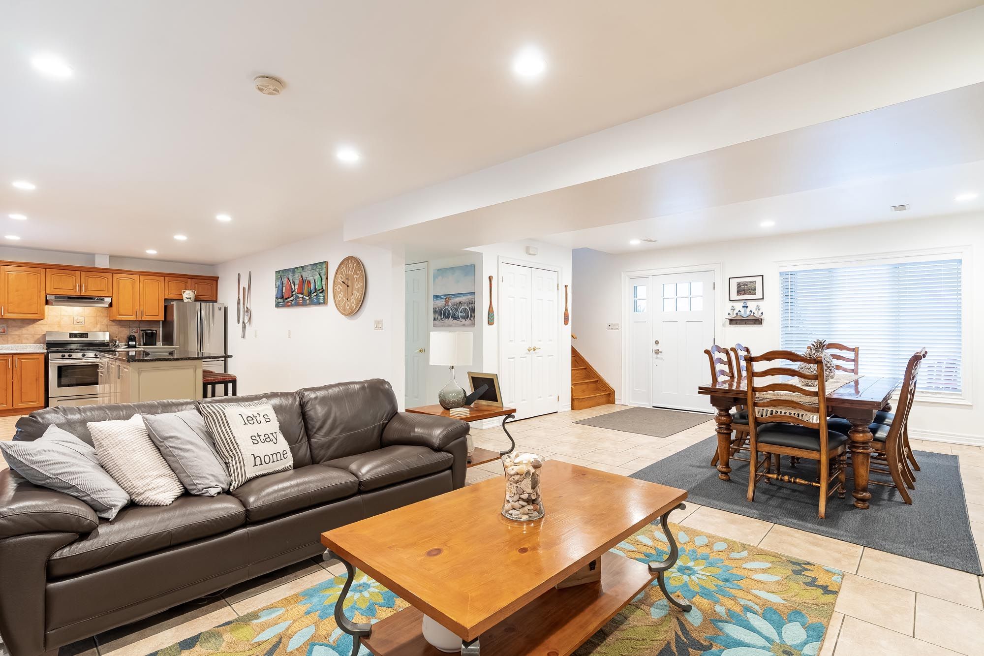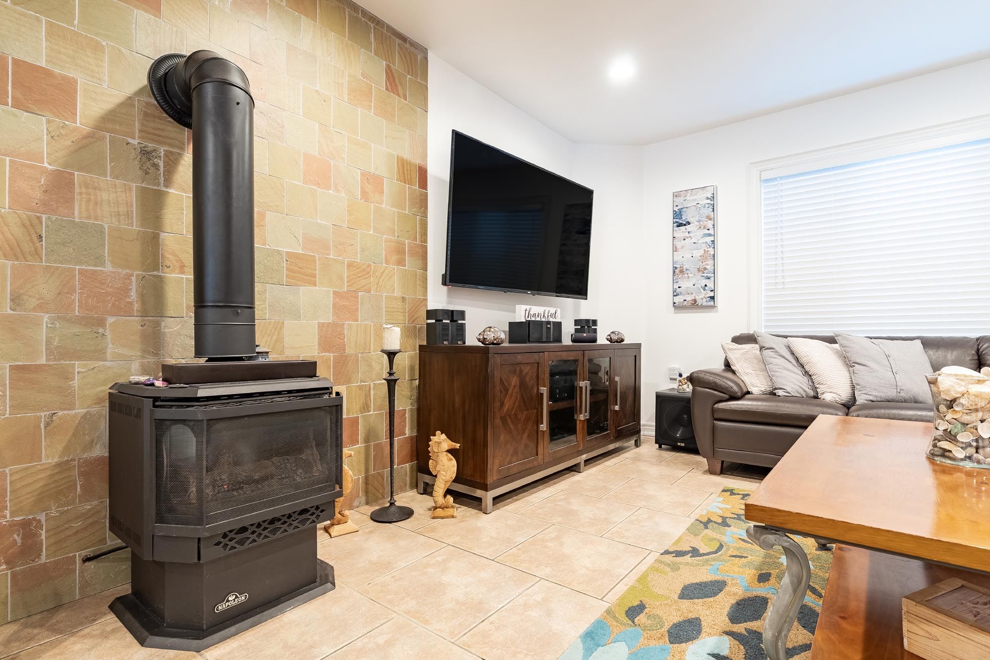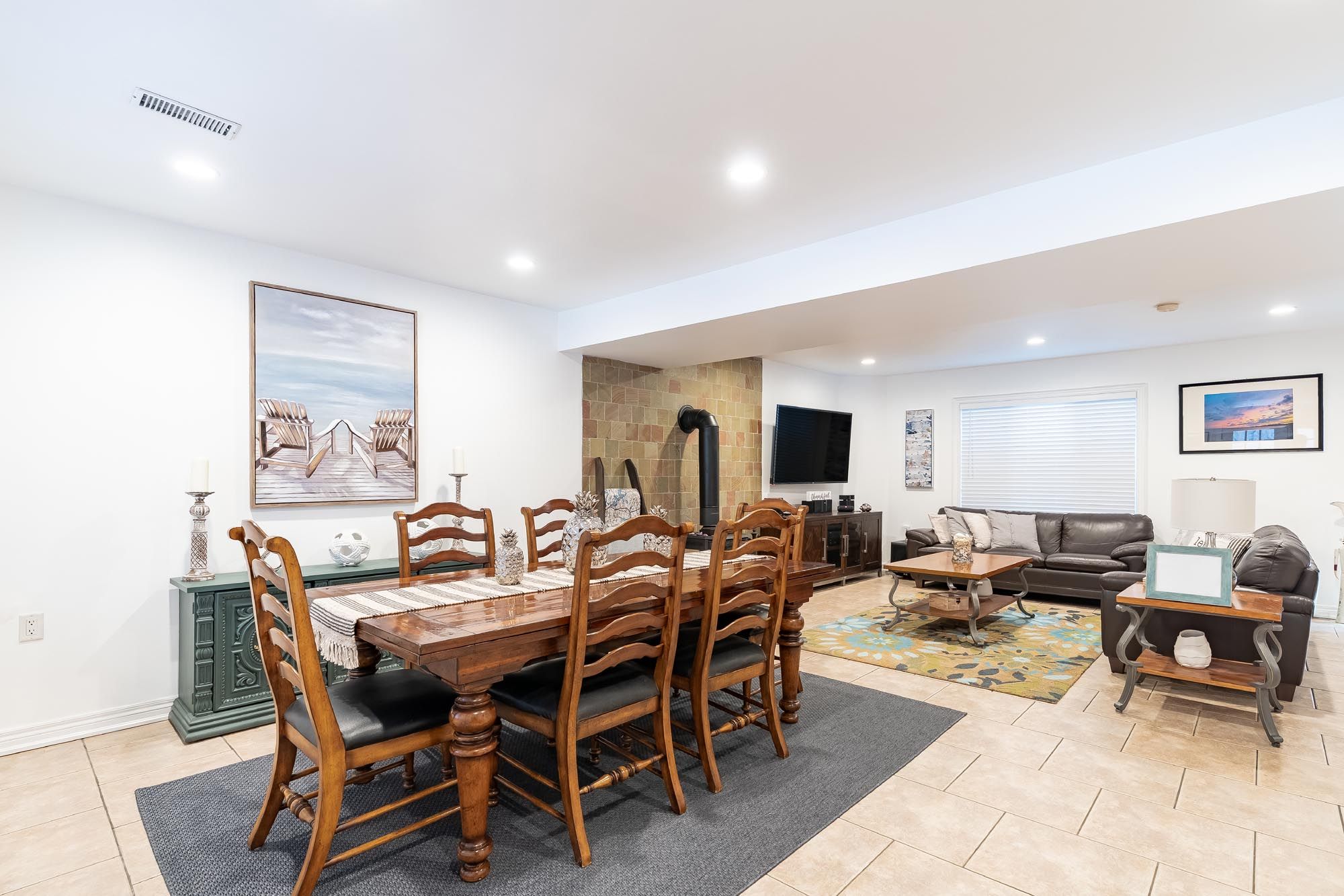 • Open-concept design with a large kitchen and cozy gas fireplace.