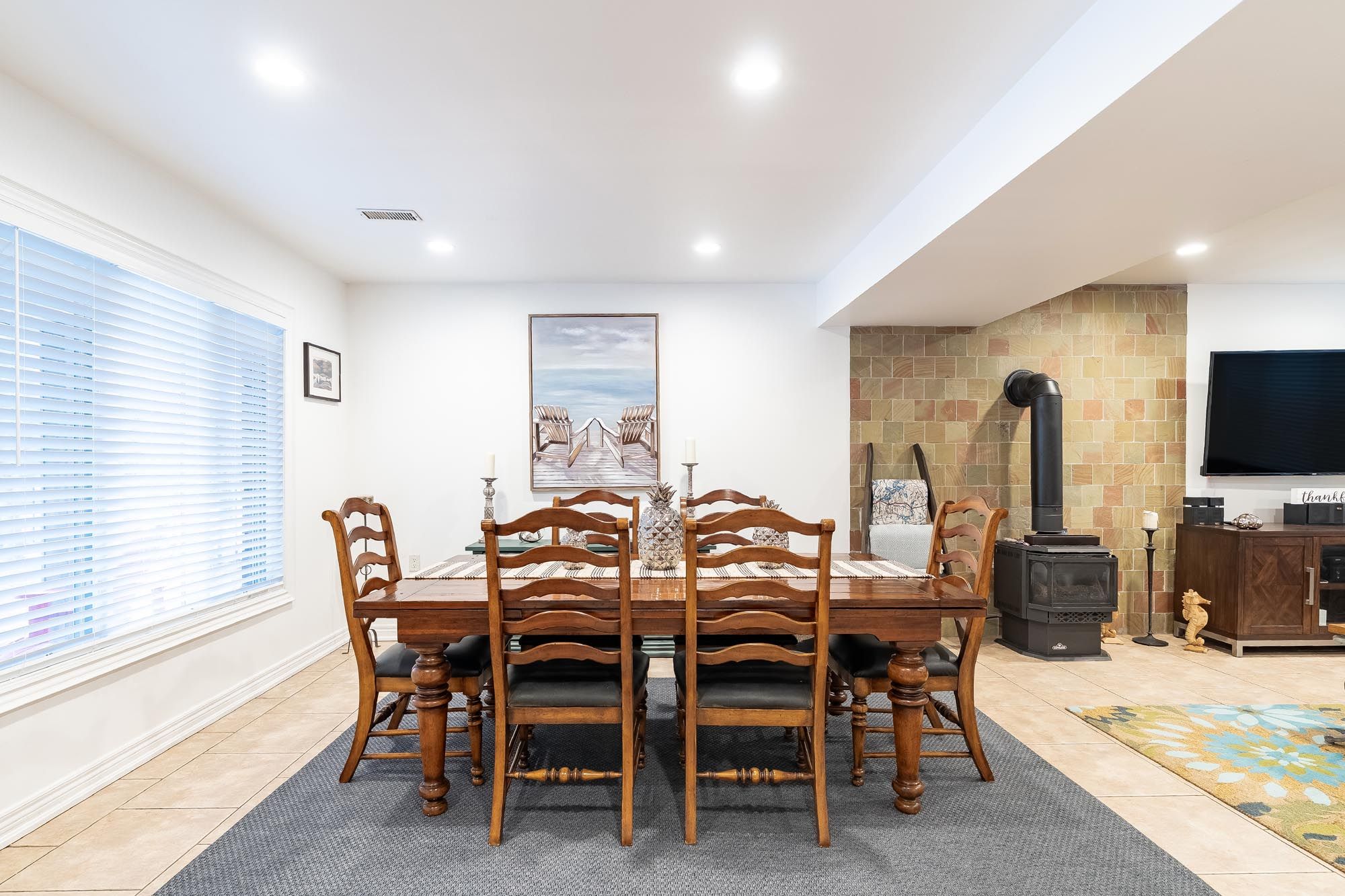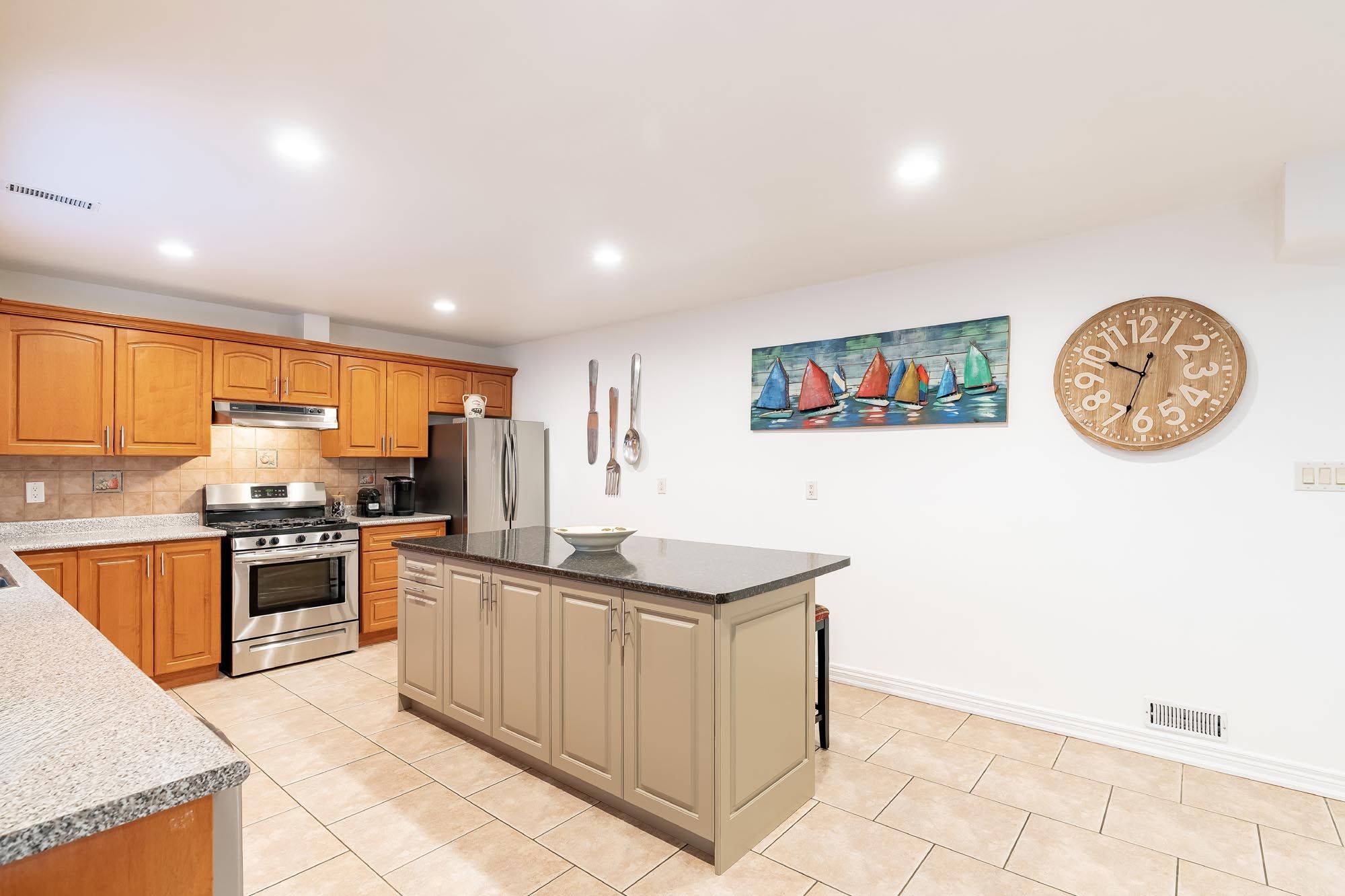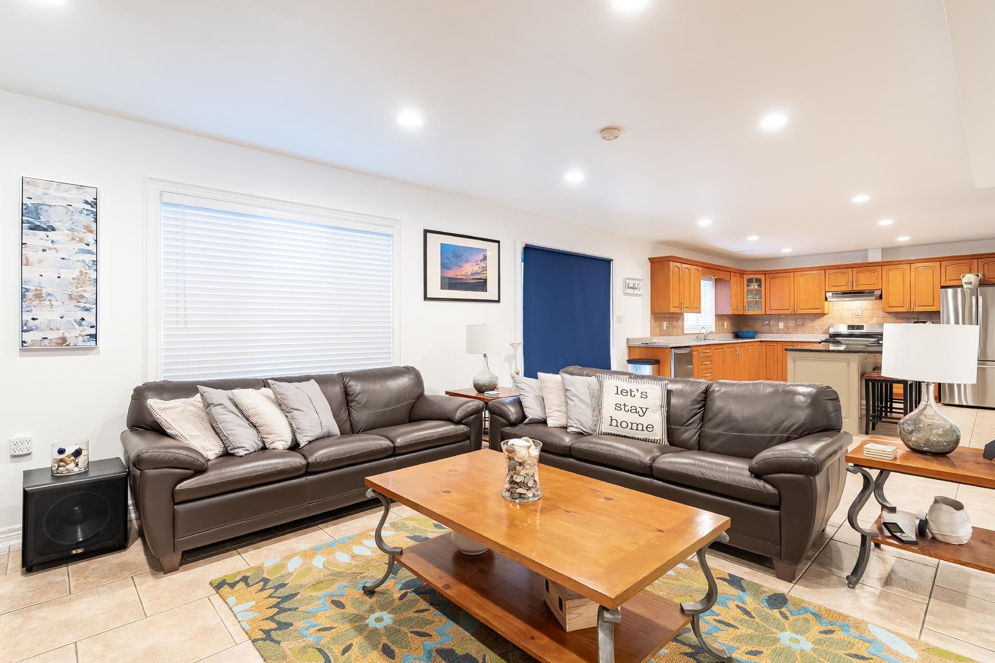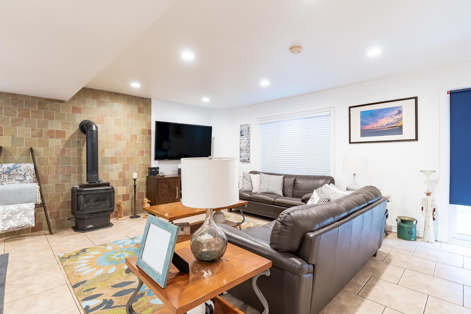 • Open-concept design with a large kitchen and cozy gas fireplace.