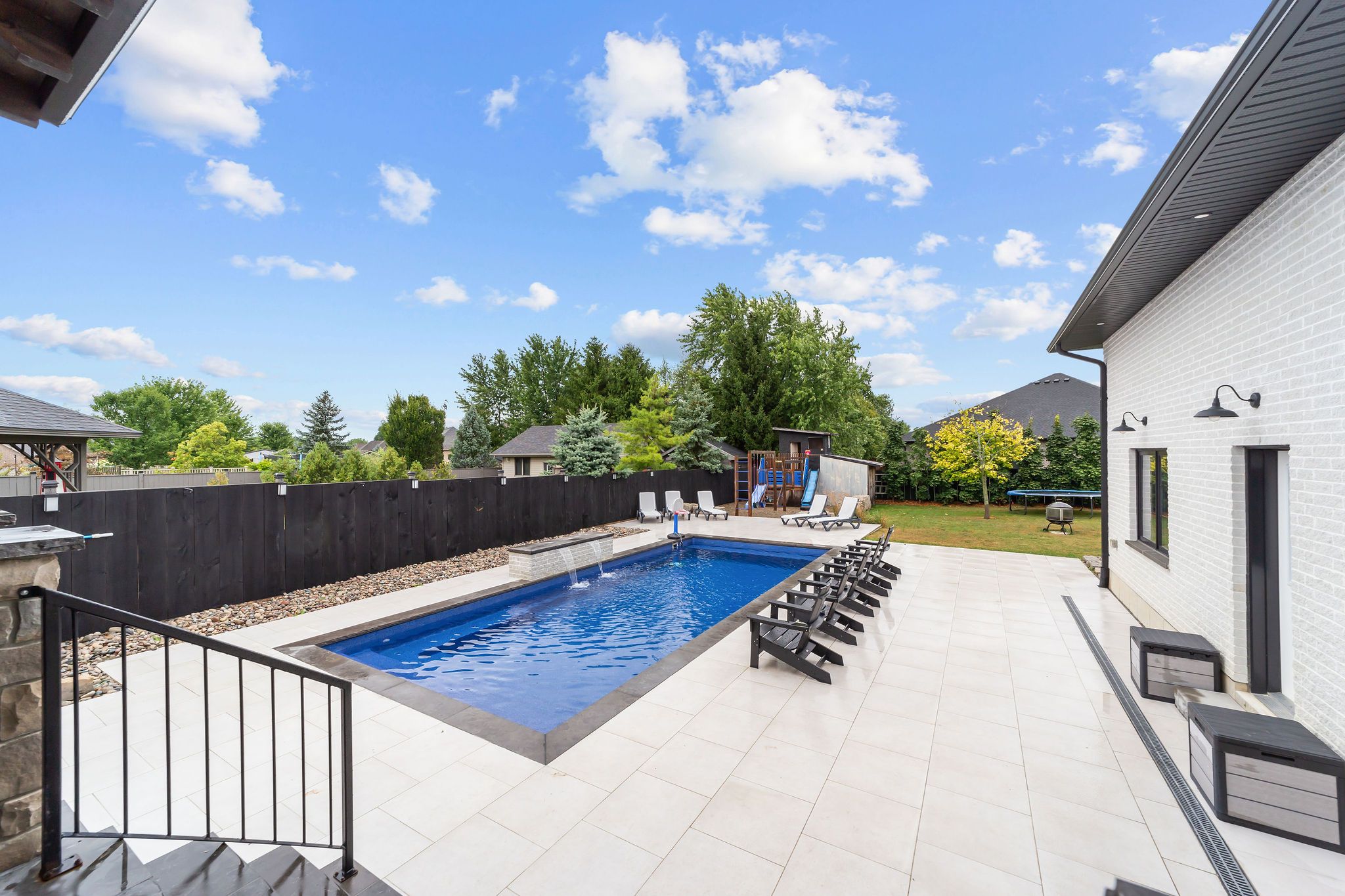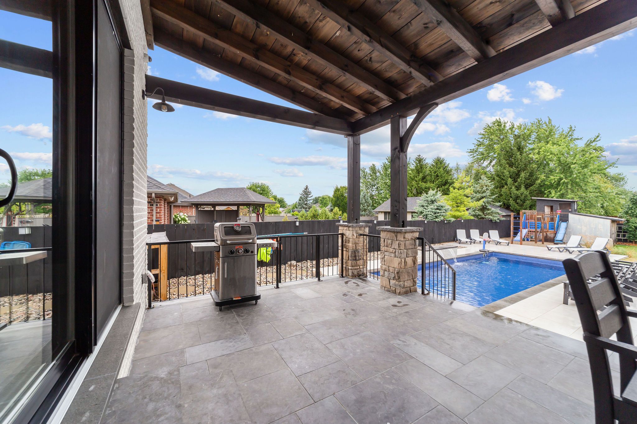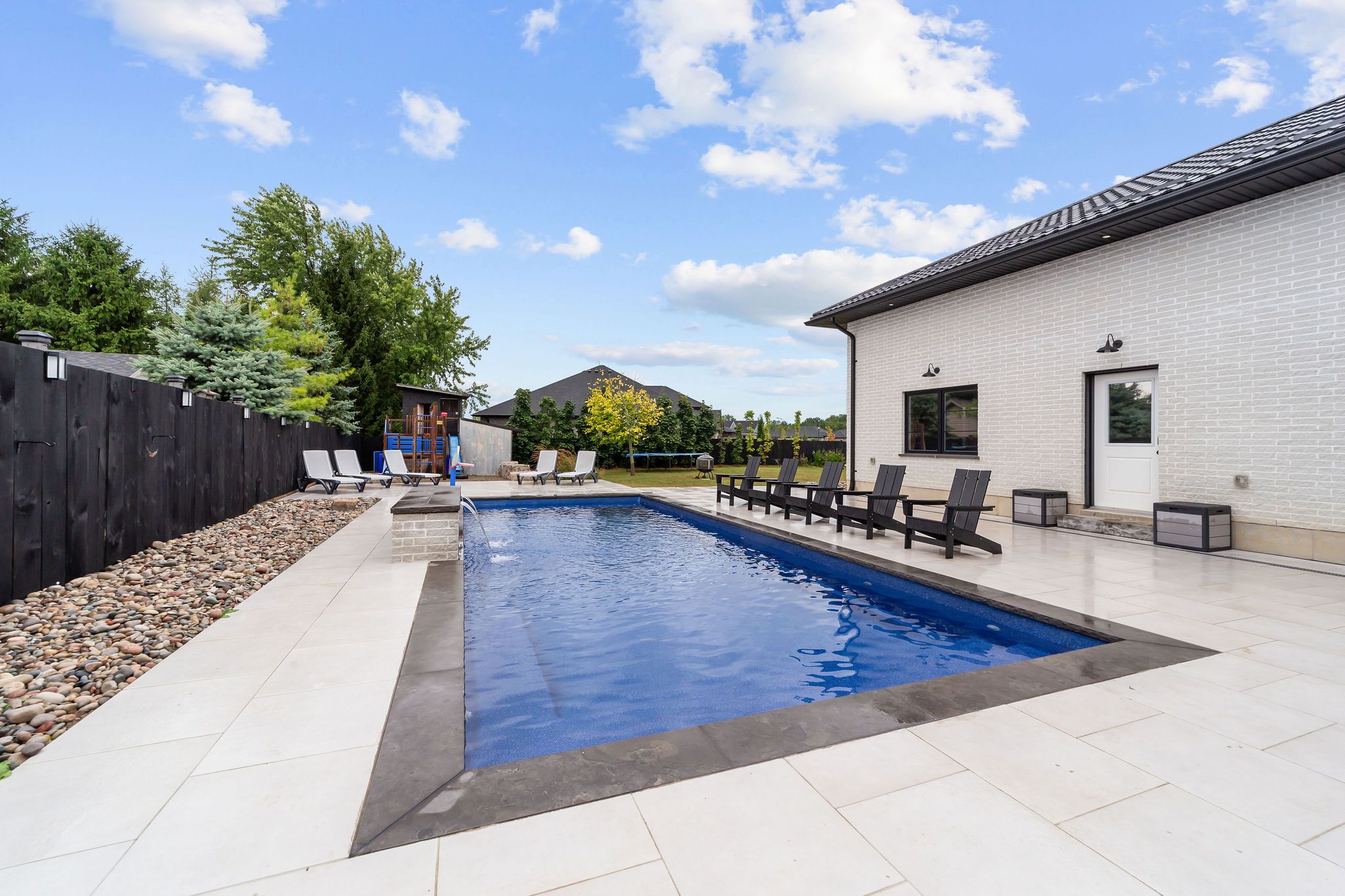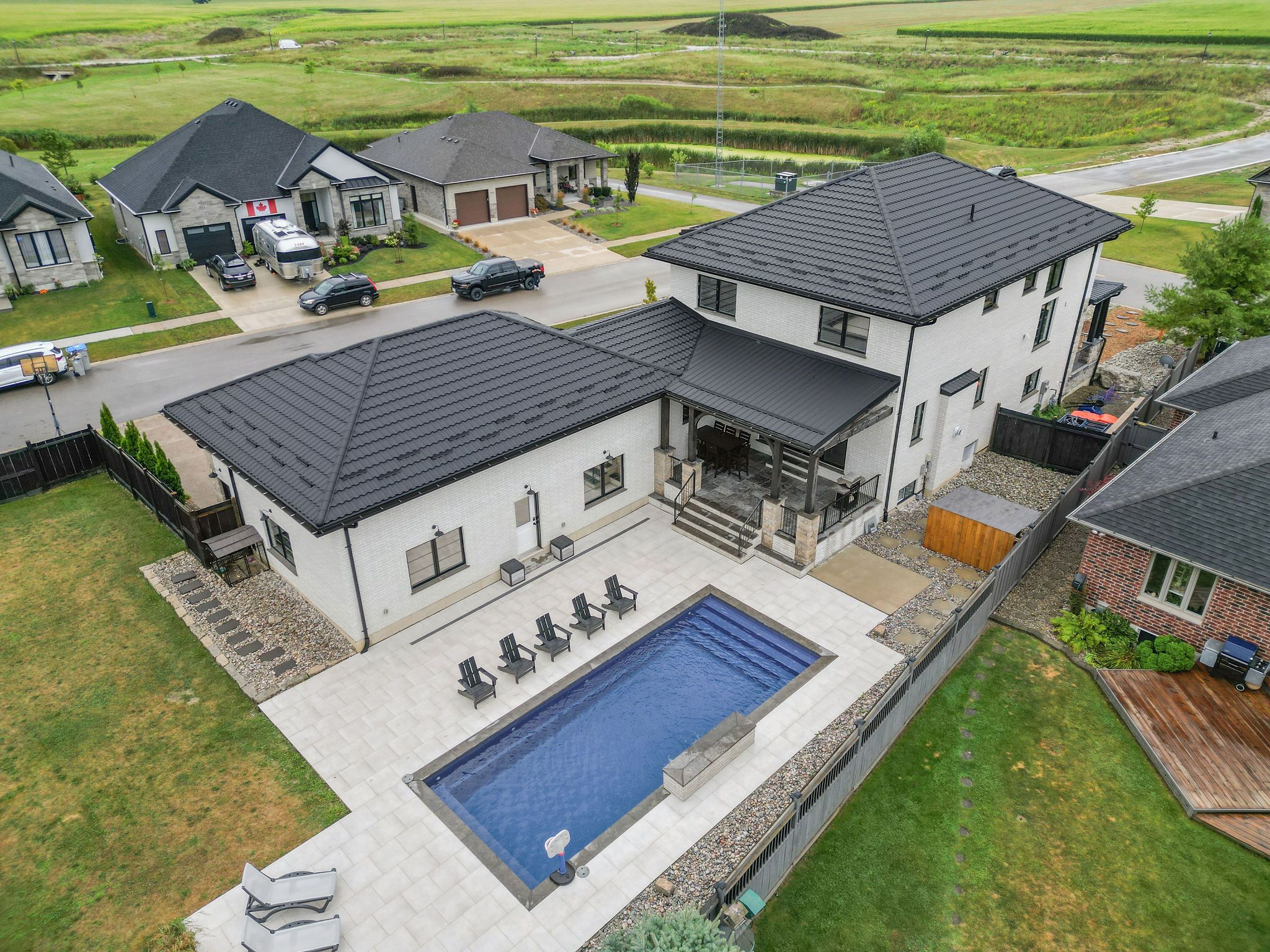 Welcome to a home where modern design meets small-town living, built just five years ago by marvel stone & masonry. This stone-and-brick masterpiece was crafted with every detail in mind from its timeless curb appeal to the wrap-around porch that sets the tone for peace, comfort, and connection. Inside, the main floor blends elegance and functionality. A bright, spacious kitchen with walk-in pantry is perfect for family gatherings, while the family room with fireplace offers a cozy retreat. A large office or bedroom with countryside views provides the ideal workspace, and built-in speakers add a touch of everyday luxury. Upstairs, you'll find four additional bedrooms that are thoughtfully placed on the same level, including a luxurious primary suite with spa-inspired ensuite, his-and-hers sinks, and a deep soaker tub. The three additional bedrooms feature oversized closets, built-ins, and window benches, while the second-floor laundry room makes daily routines effortless. The lower level is designed for entertainment and function, complete with a movie theatre, gym, games area, childrens recreation space, full bath, and a 16-foot cold cellar. Step outside to your private backyard oasis: a heated in-ground pool with bench seating, stone patios, bbq area, water feature, built-in play equipment, playhouse, and garden boxes all surrounded by mature trees and low-maintenance landscaping. Evenings on the porch or nights by the fire create a lifestyle thats hard to leave behind. Practical features include: an oversized gas heated three-car garage with car-lift wiring, parking for six, fully fenced yard, tinted windows throughout the home, spray foam insulation, professional-grade security cameras, drainage system, sump pump with battery backup, central vacuum, and metal roof with a transferable warranty. Future-ready upgrades are already in place, including wiring for a hot tub, gas generator switch, bbq hookup, and fireplace supports on the pool patio.