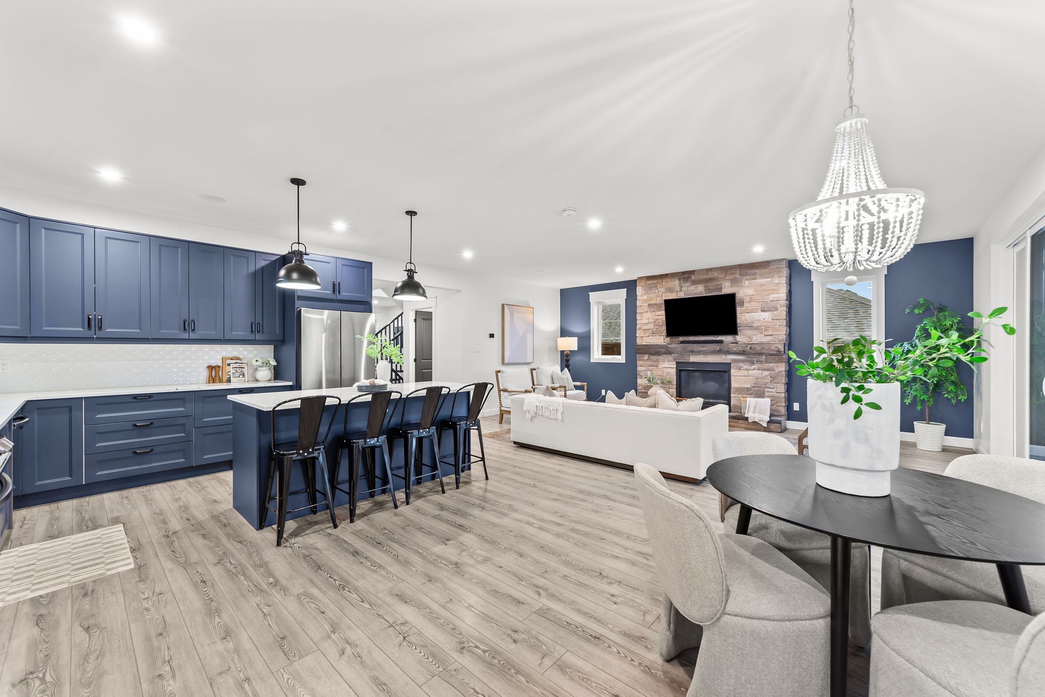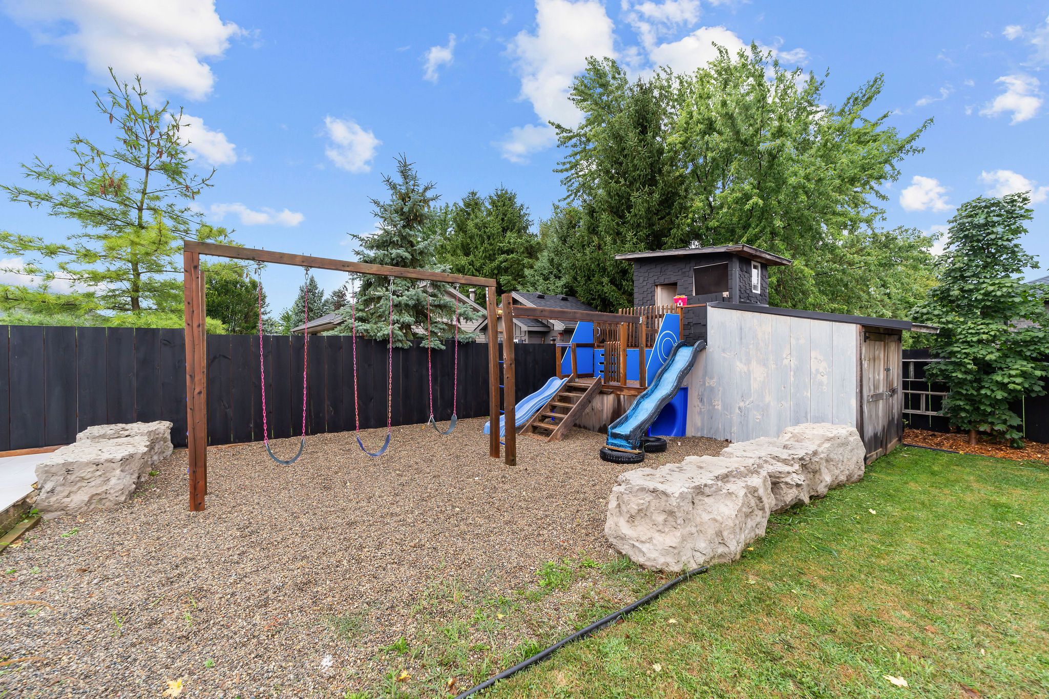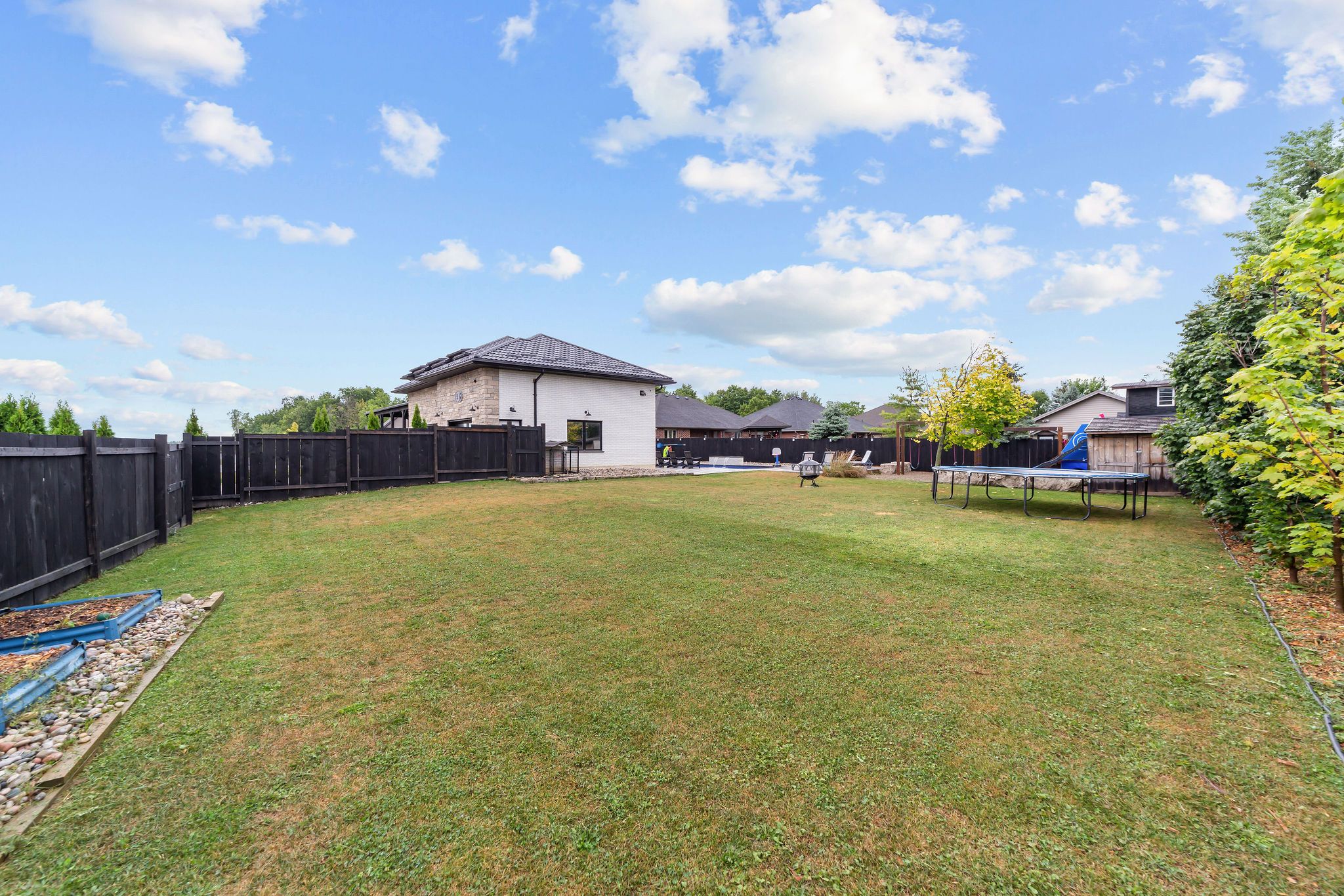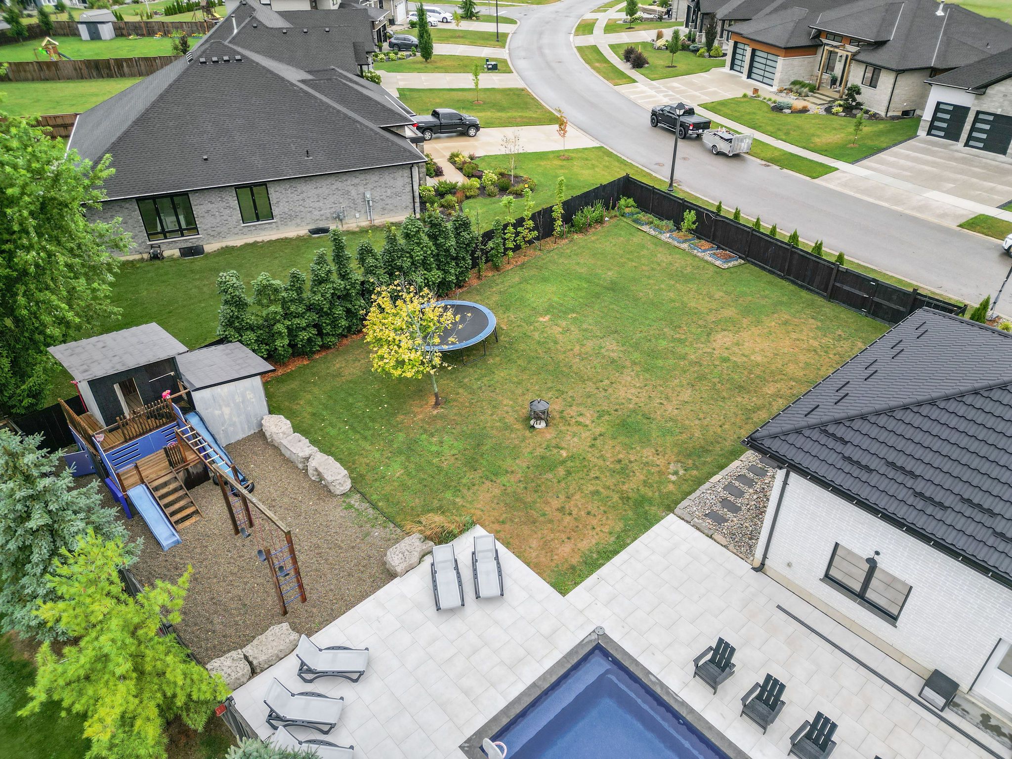 Welcome to a home where modern design meets small-town living, built just five years ago by marvel stone & masonry. This stone-and-brick masterpiece was crafted with every detail in mind from its timeless curb appeal to the wrap-around porch that sets the tone for peace, comfort, and connection. Inside, the main floor blends elegance and functionality. A bright, spacious kitchen with walk-in pantry is perfect for family gatherings, while the family room with fireplace offers a cozy retreat. A large office or bedroom with countryside views provides the ideal workspace, and built-in speakers add a touch of everyday luxury. Upstairs, you'll find four additional bedrooms that are thoughtfully placed on the same level, including a luxurious primary suite with spa-inspired ensuite, his-and-hers sinks, and a deep soaker tub. The three additional bedrooms feature oversized closets, built-ins, and window benches, while the second-floor laundry room makes daily routines effortless. The lower level is designed for entertainment and function, complete with a movie theatre, gym, games area, childrens recreation space, full bath, and a 16-foot cold cellar. Step outside to your private backyard oasis: a heated in-ground pool with bench seating, stone patios, bbq area, water feature, built-in play equipment, playhouse, and garden boxes all surrounded by mature trees and low-maintenance landscaping. Evenings on the porch or nights by the fire create a lifestyle thats hard to leave behind. Practical features include: an oversized gas heated three-car garage with car-lift wiring, parking for six, fully fenced yard, tinted windows throughout the home, spray foam insulation, professional-grade security cameras, drainage system, sump pump with battery backup, central vacuum, and metal roof with a transferable warranty. Future-ready upgrades are already in place, including wiring for a hot tub, gas generator switch, bbq hookup, and fireplace supports on the pool patio.