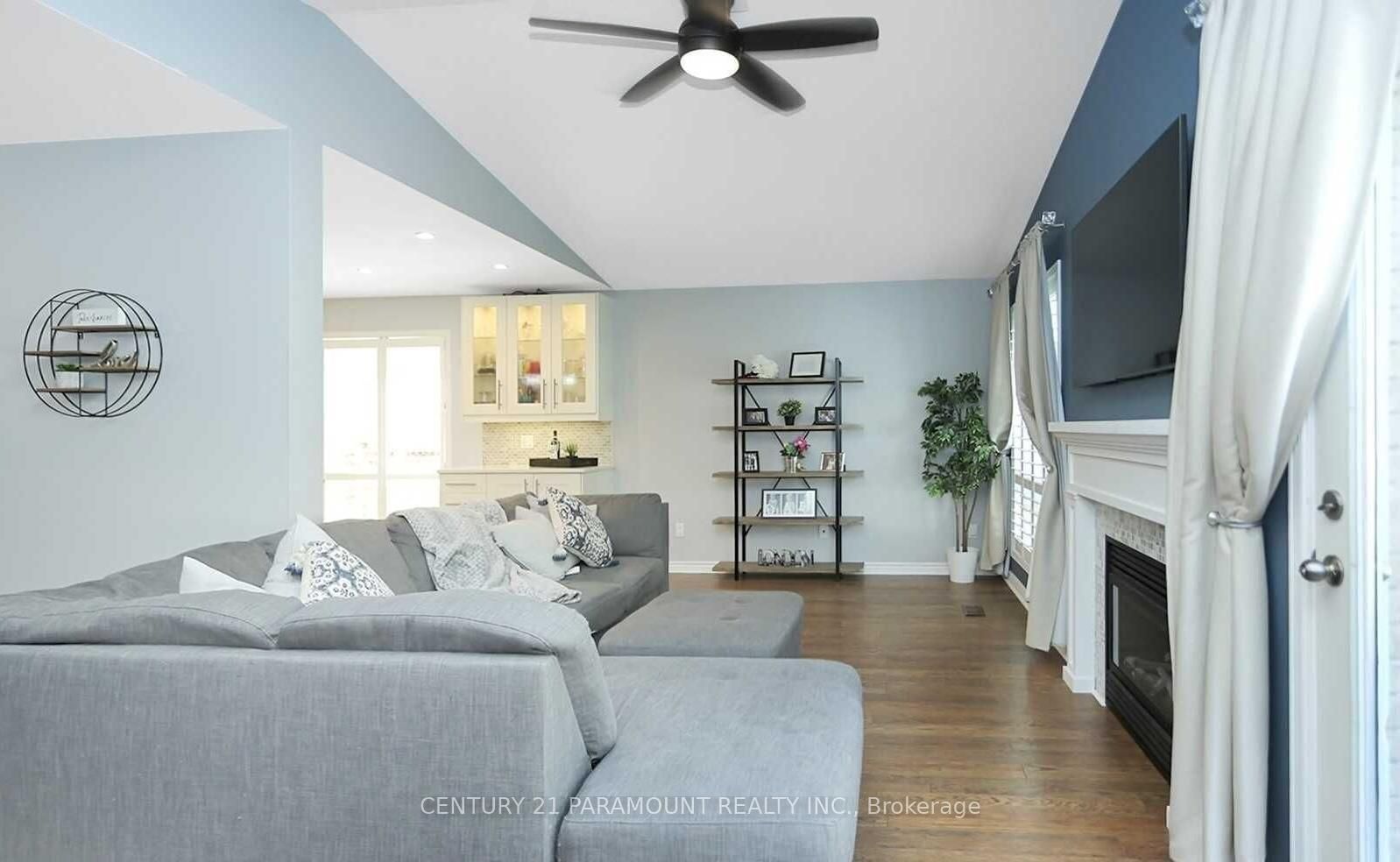• Great room with a gas fireplace and cathedral ceiling.