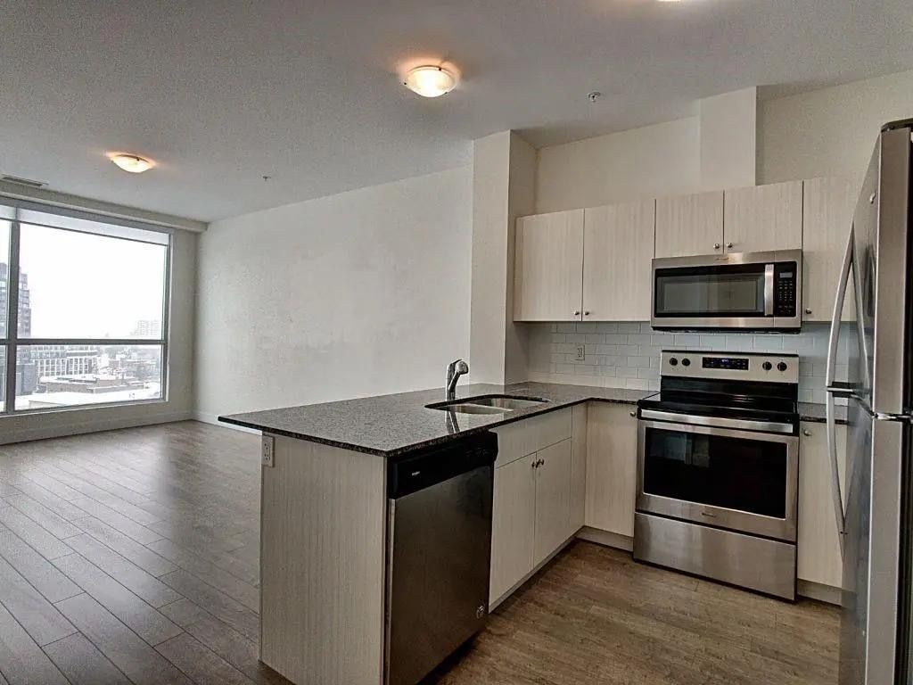 Large 1-bedroom plus den condo in dtk's innovation district. Spacious open-concept layout with floor-to-ceiling windows, stainless steel appliances, in-suite laundry, and private balcony with clear views. Free high-speed internet, heat and water included; tenant pays only hydro. Den offers ideal work-from-home space or as a second bedroom. Building amenities include rooftop terrace with bbqs, fitness centre, yoga room, co-working space, party room, and concierge. Steps to lrt, google, communitech, victoria park, restaurants, and shops.