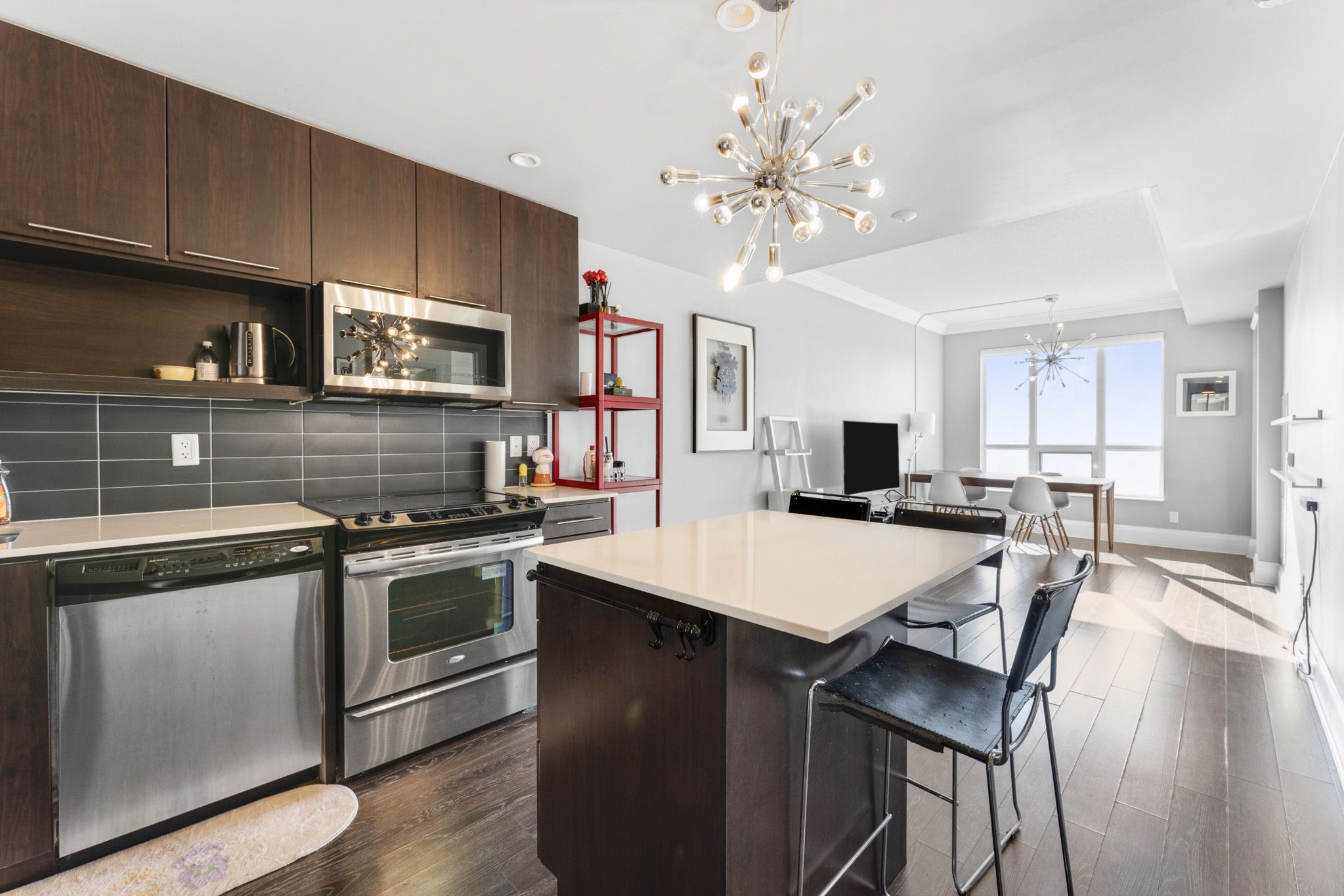 • Modern kitchen features stainless steel appliances and a breakfast bar.