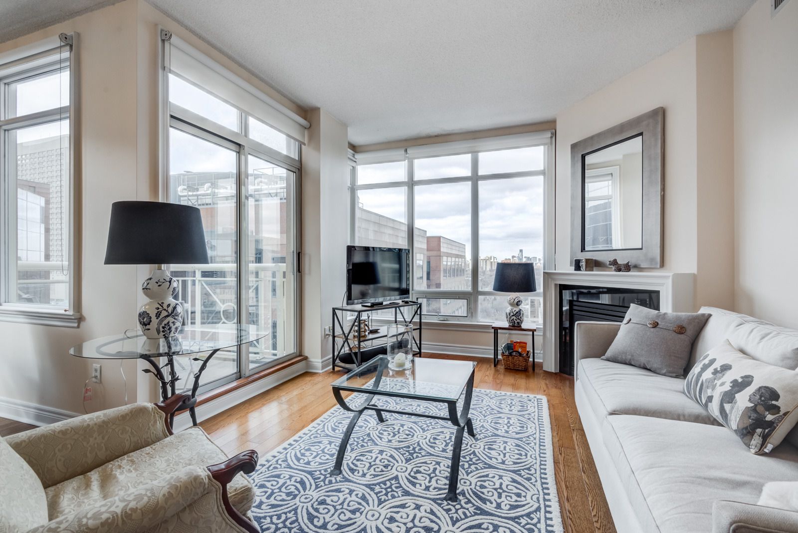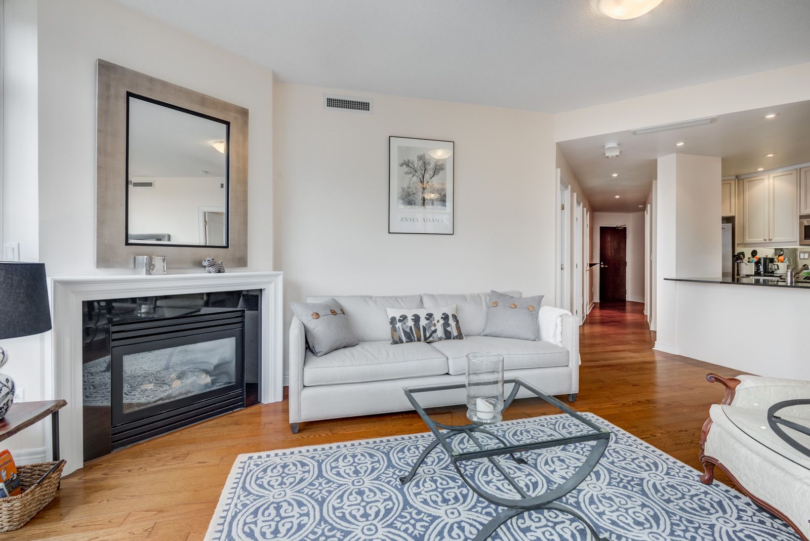 • Bright living area features a cozy gas fireplace for warmth.