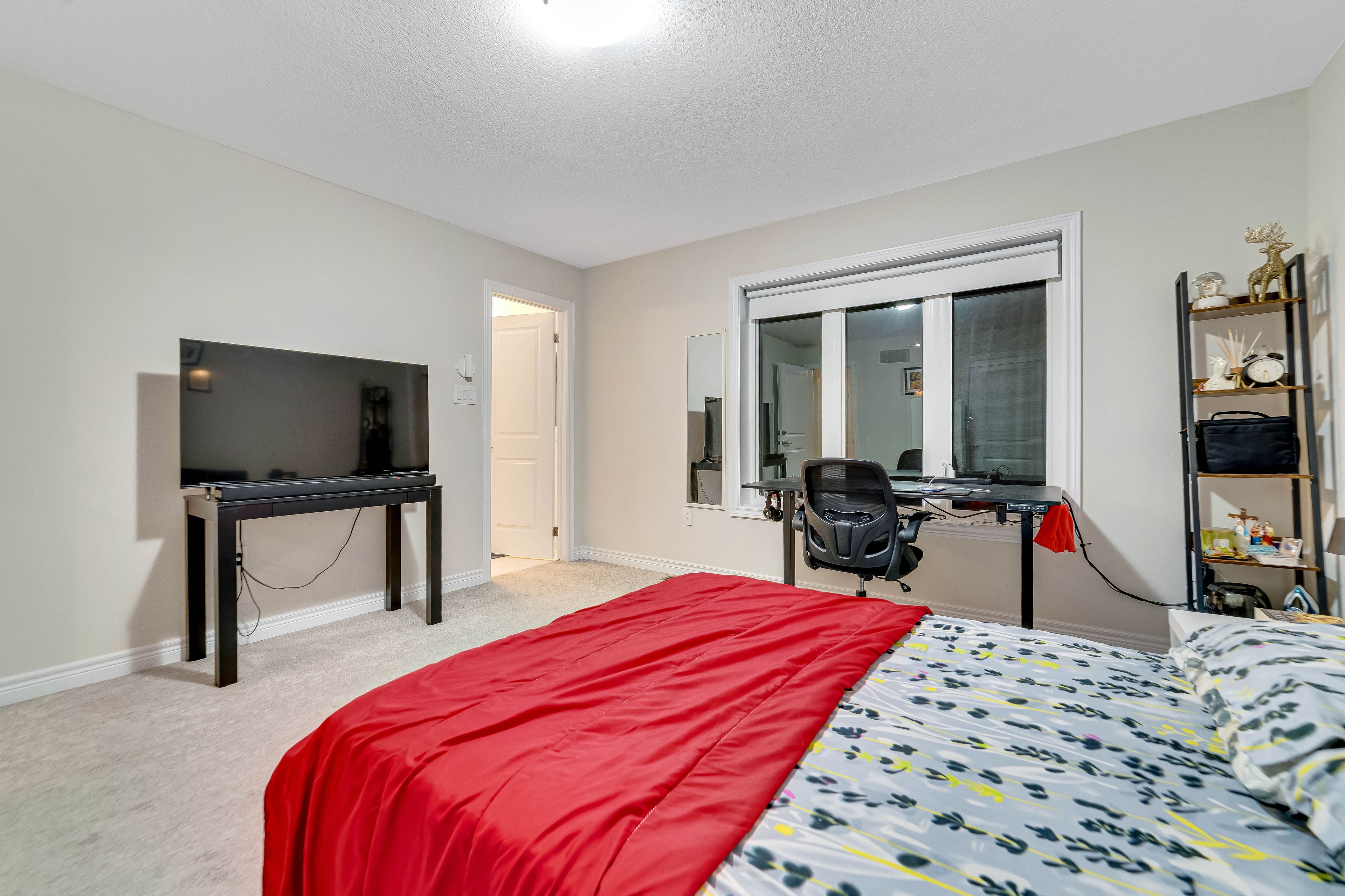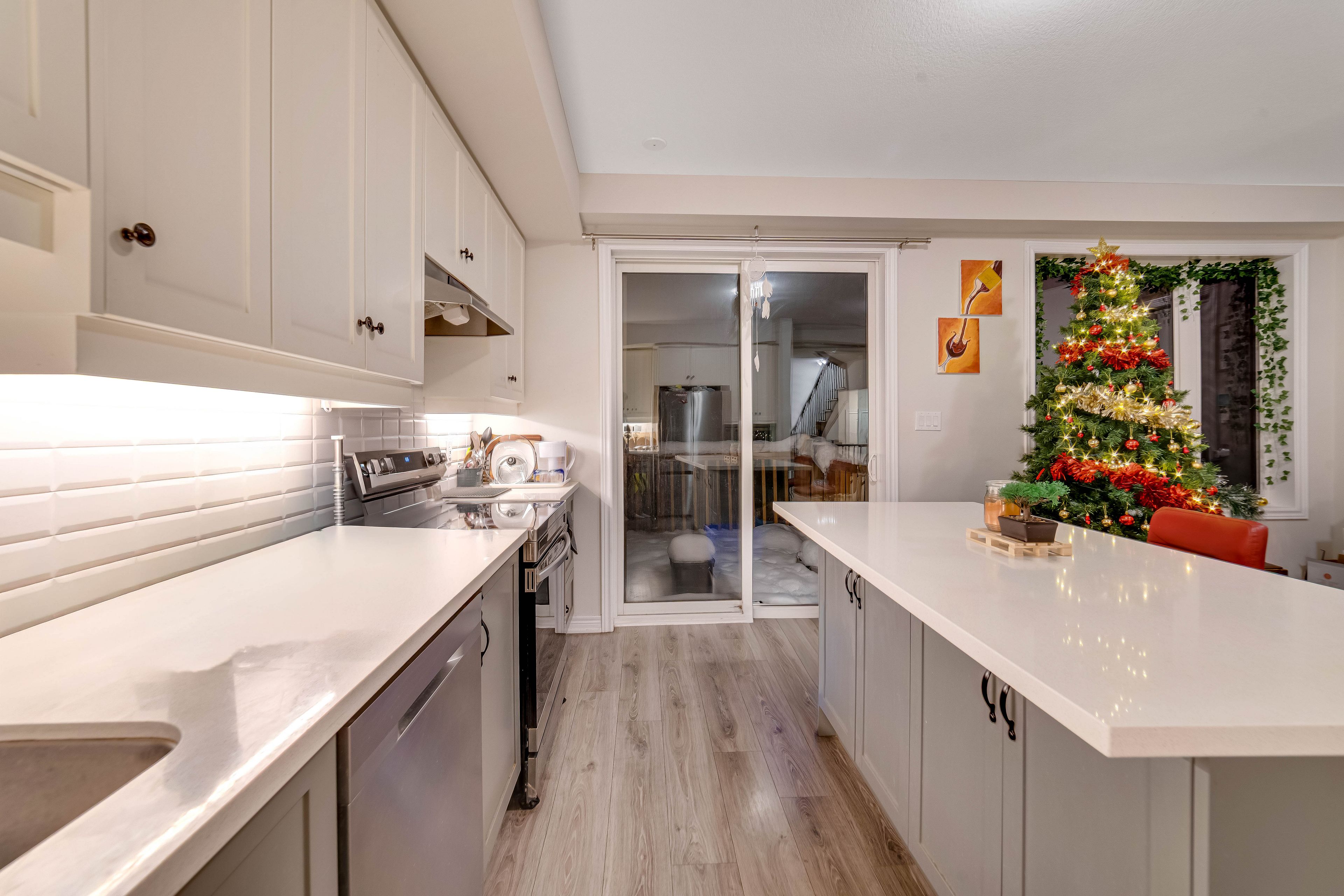 Located in a highly desirable neighbourhood, this beautiful 2-storey townhome backs onto a serene ravine and offers a walk-out basement. The bright open-concept main floor features upgraded hardwood flooring, large windows, and a stylish kitchen with upgraded cabinets, quartz countertops, stainless steel appliances, built-in microwave, modern backsplash, and an oversized island. Walk out to a large deck overlooking the ravine-perfect for relaxing or entertaining. The oak staircase leads to the second level with hardwood in the hallway, a convenient upper-level laundry, a primary bedroom with a private ensuite, two additional spacious bedrooms, and a full bath. Additional highlights include double-car driveway parking and a central vacuum rough-in. Close to parks, trails, shopping, public transit, cambridge mall, and major highways.