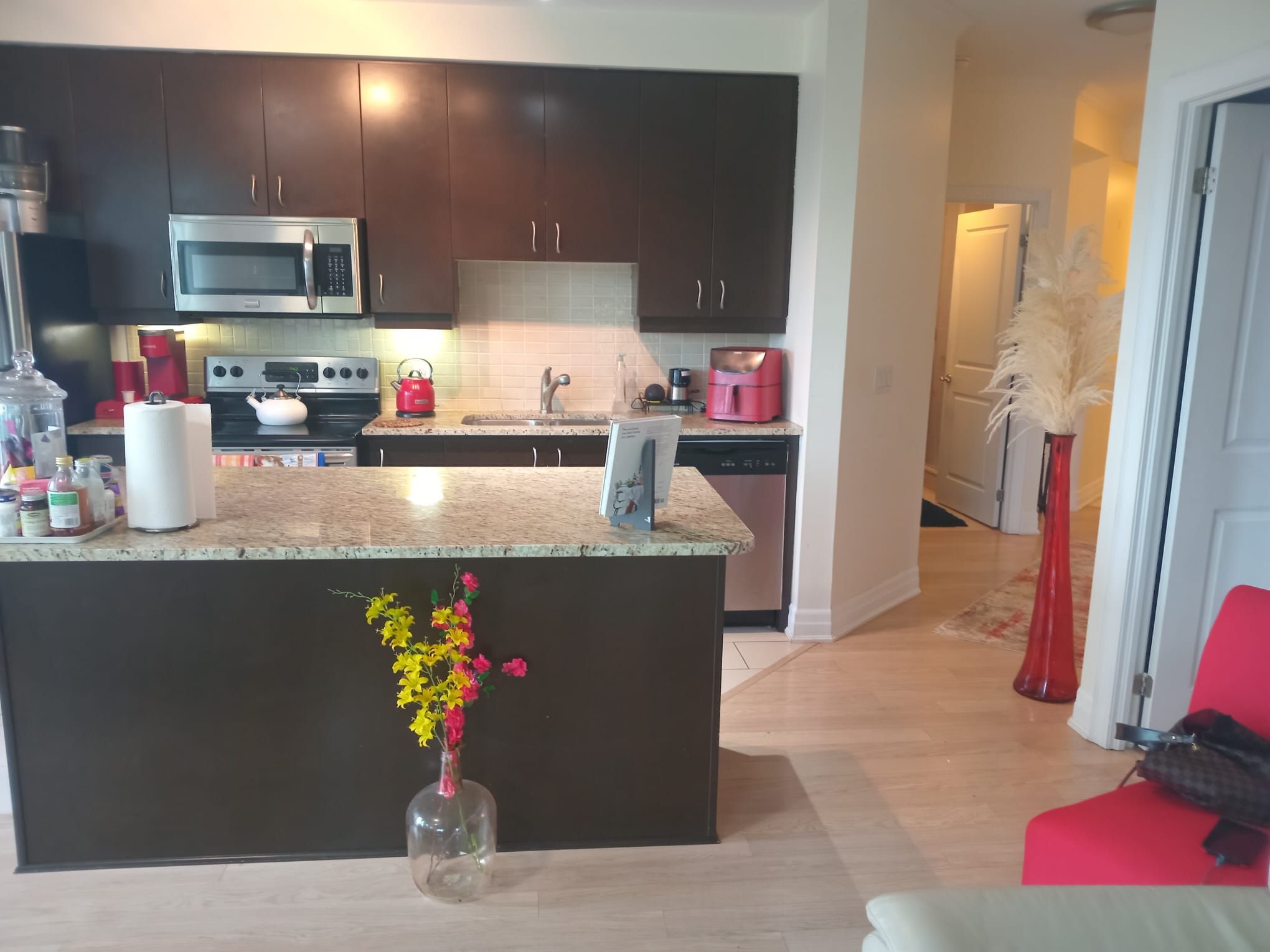 Amazing opportunity**unit condo approximately 1200 sq ft features 2 bedrooms, 2 bathrooms stunning sun-filled solarium with sliding doors** modern spacious luxurious space** renovated & modern kitchen, sleek ceramic countertops, contemporary cabinetry, pot lights, new flooring, oversized primary bedroom with large 4 piece ensuite. Modern living room and dining room. Walk-out to balcony overlooks green space, walk-in closet and large windows. The other bedroom is sun-filled with large closets. Nestled in the highly sought-after downtown brampton, this condo offers sunny north west exposure ready for your enjoyment, with an impressive selection of amenities including a meeting/party room, gym, guest suite, visitor parking, concierge and close to go trains.