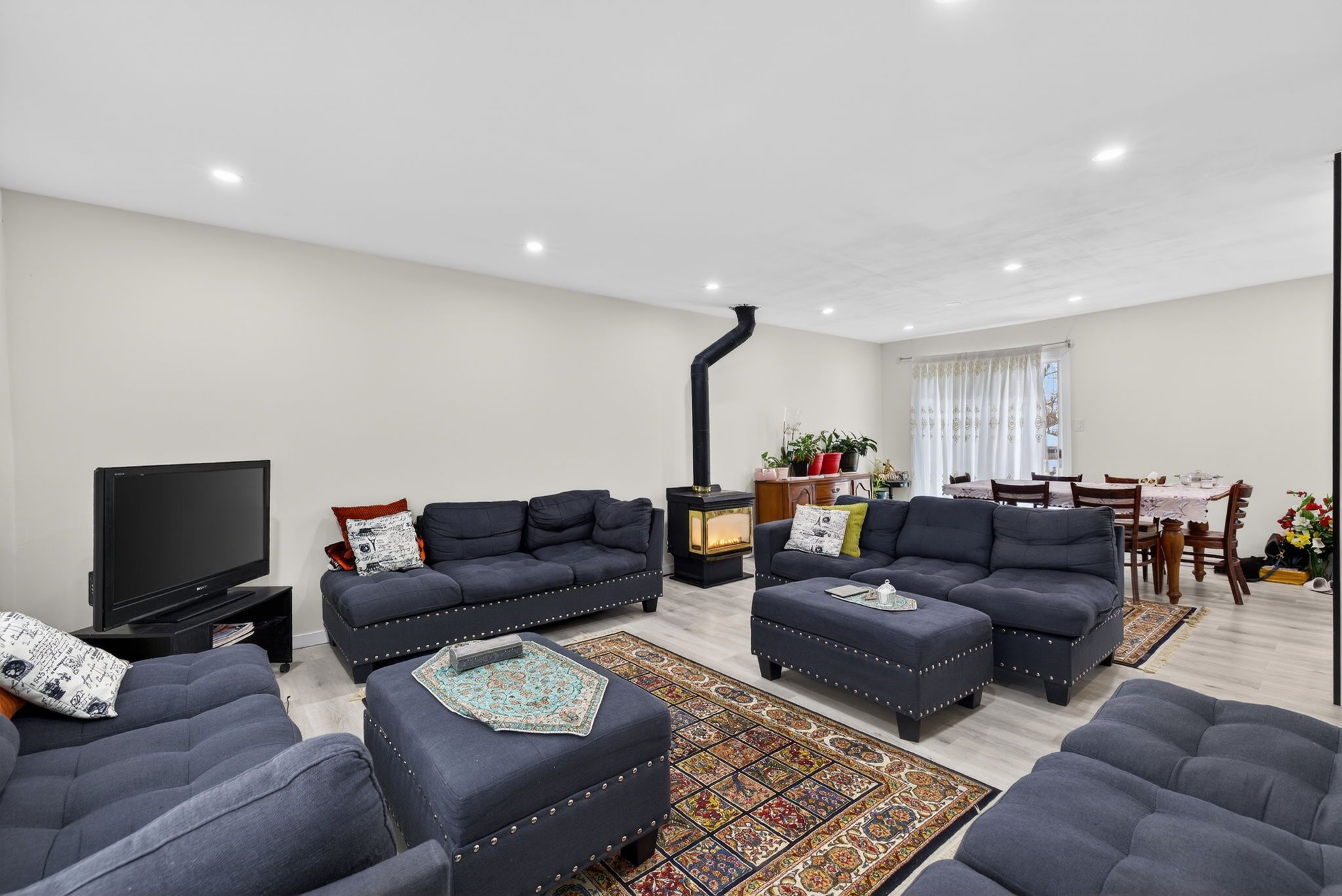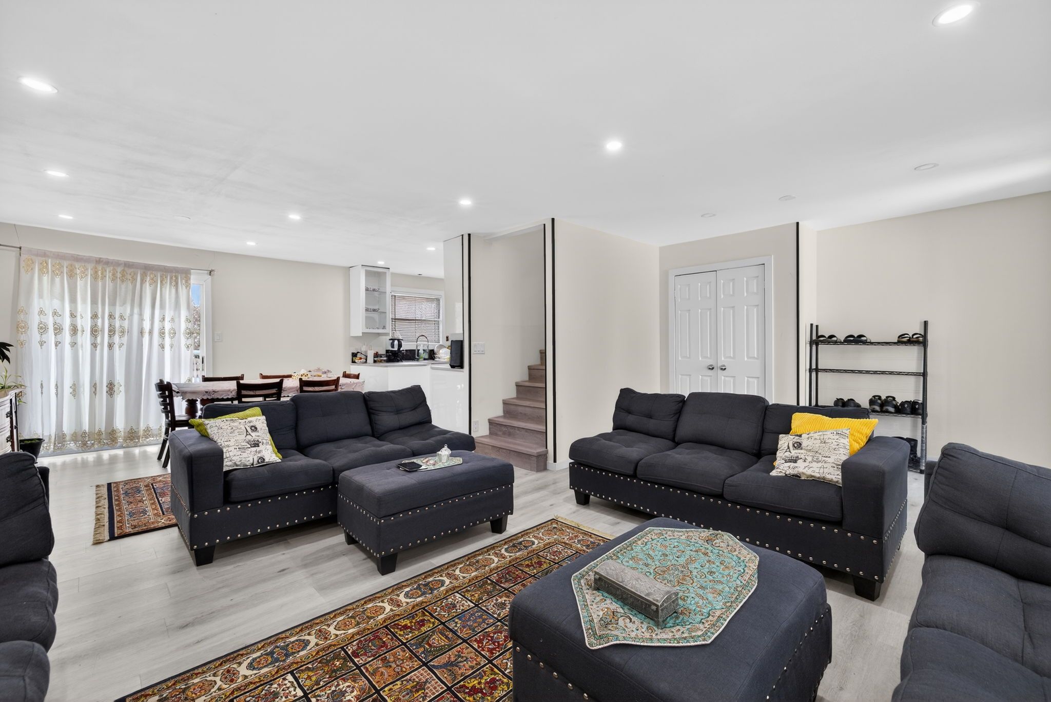 • Bright open-concept living area with modern pot lights and gas fireplace.