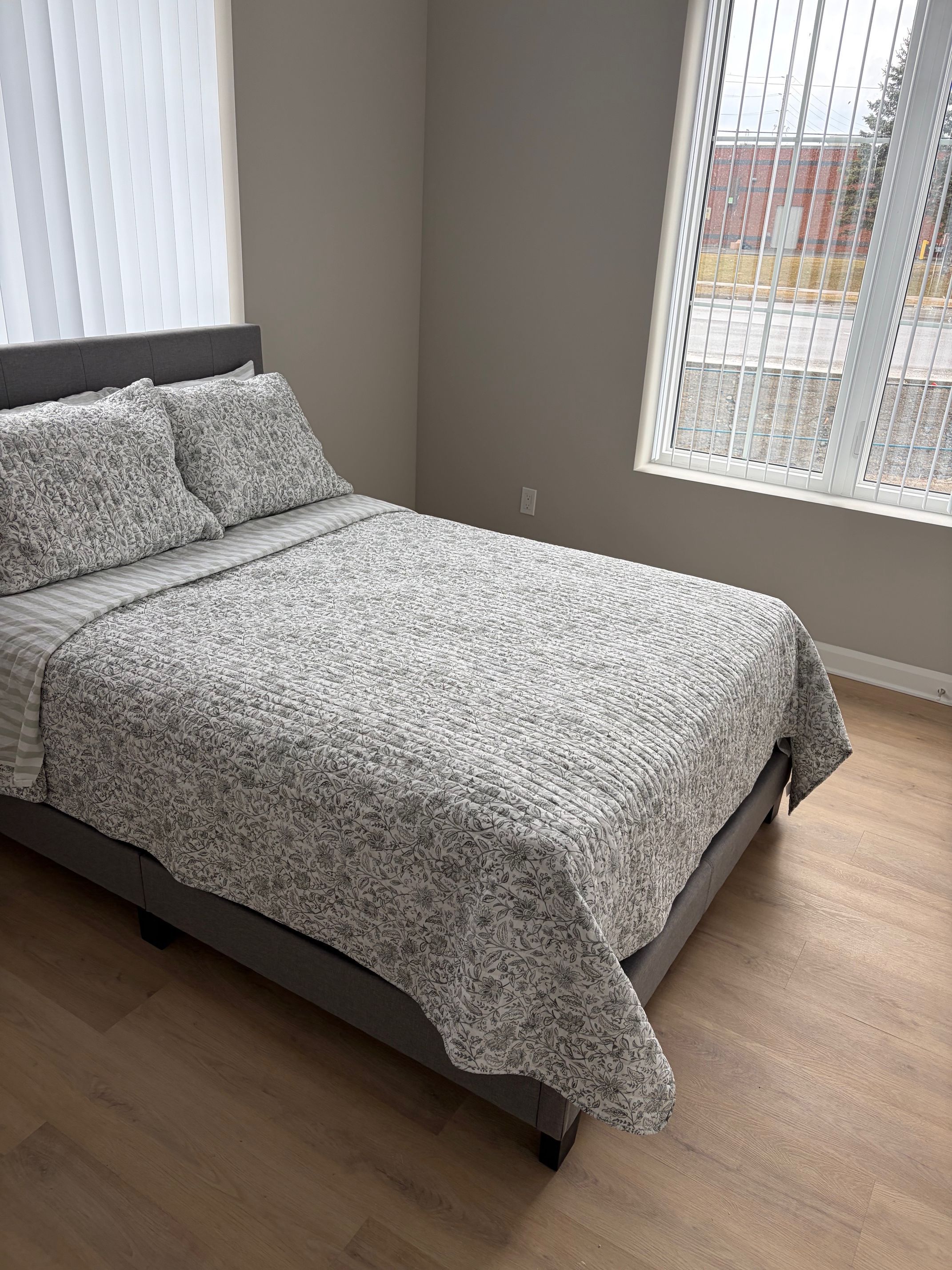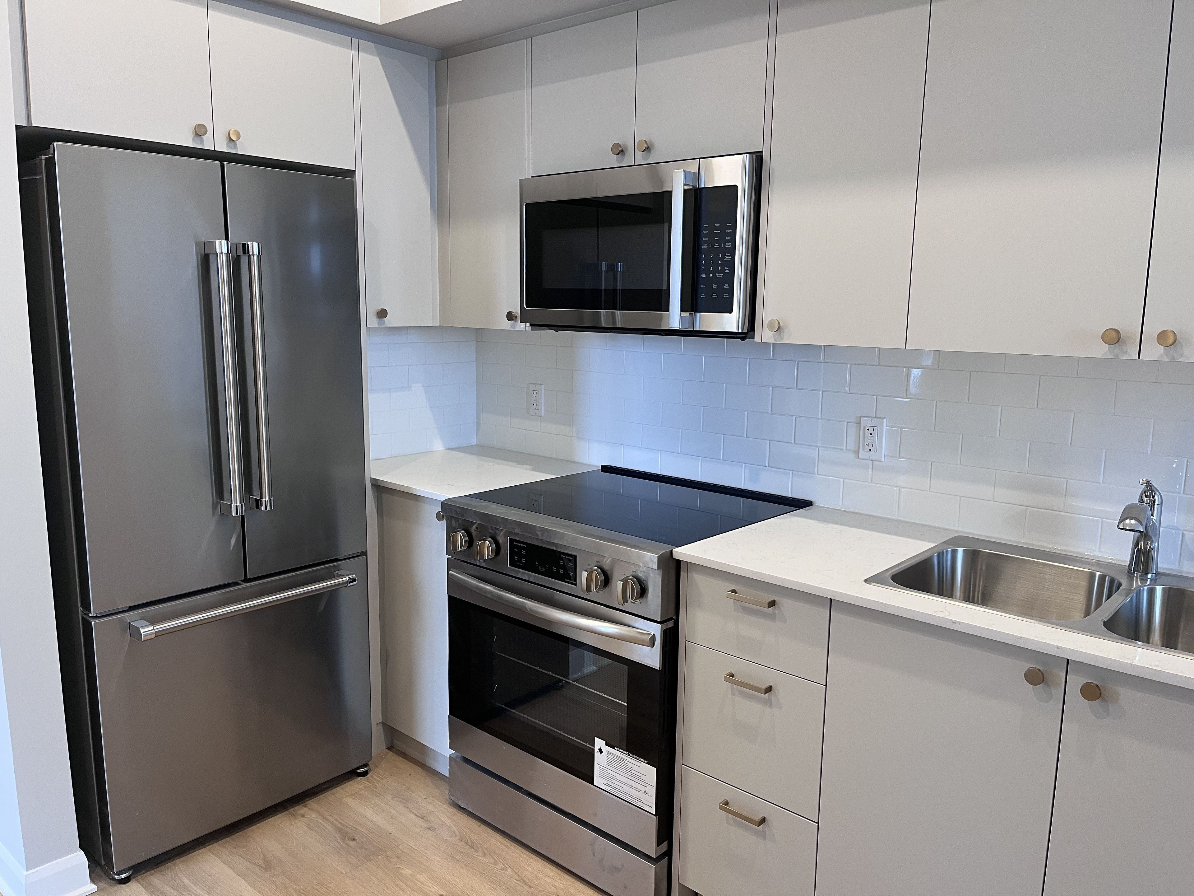 • Luxurious finishes include quartz countertops and laminate flooring.