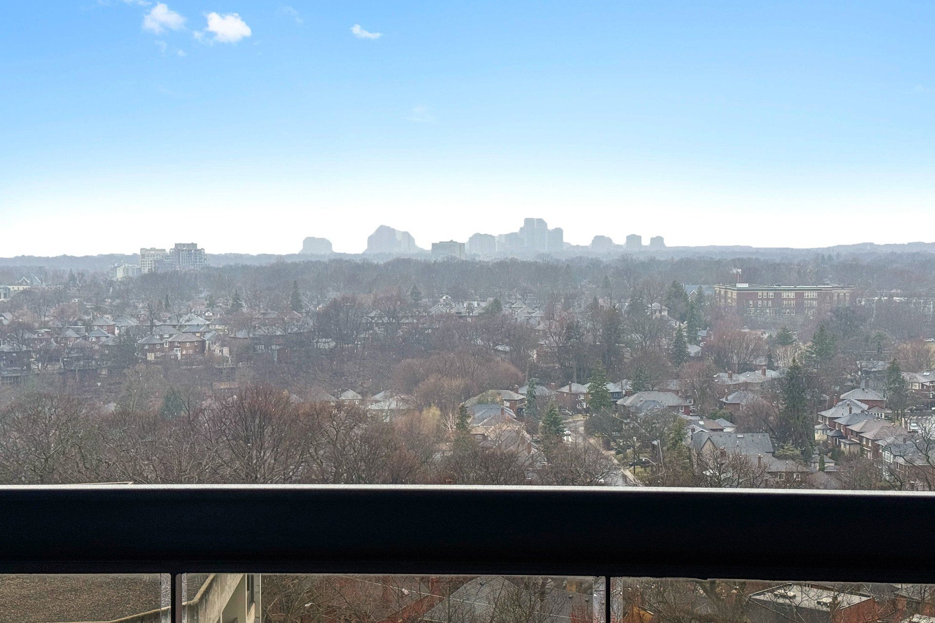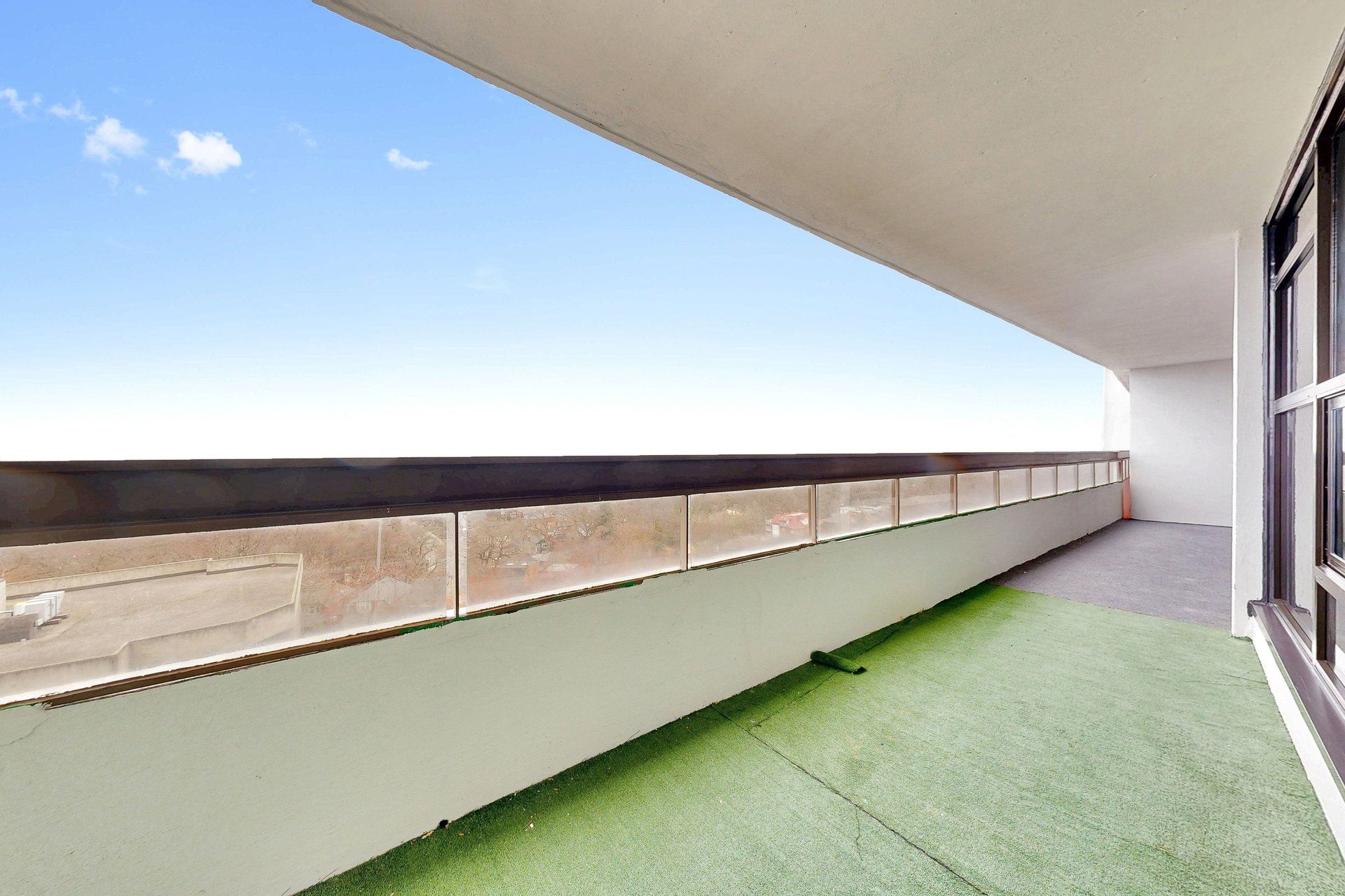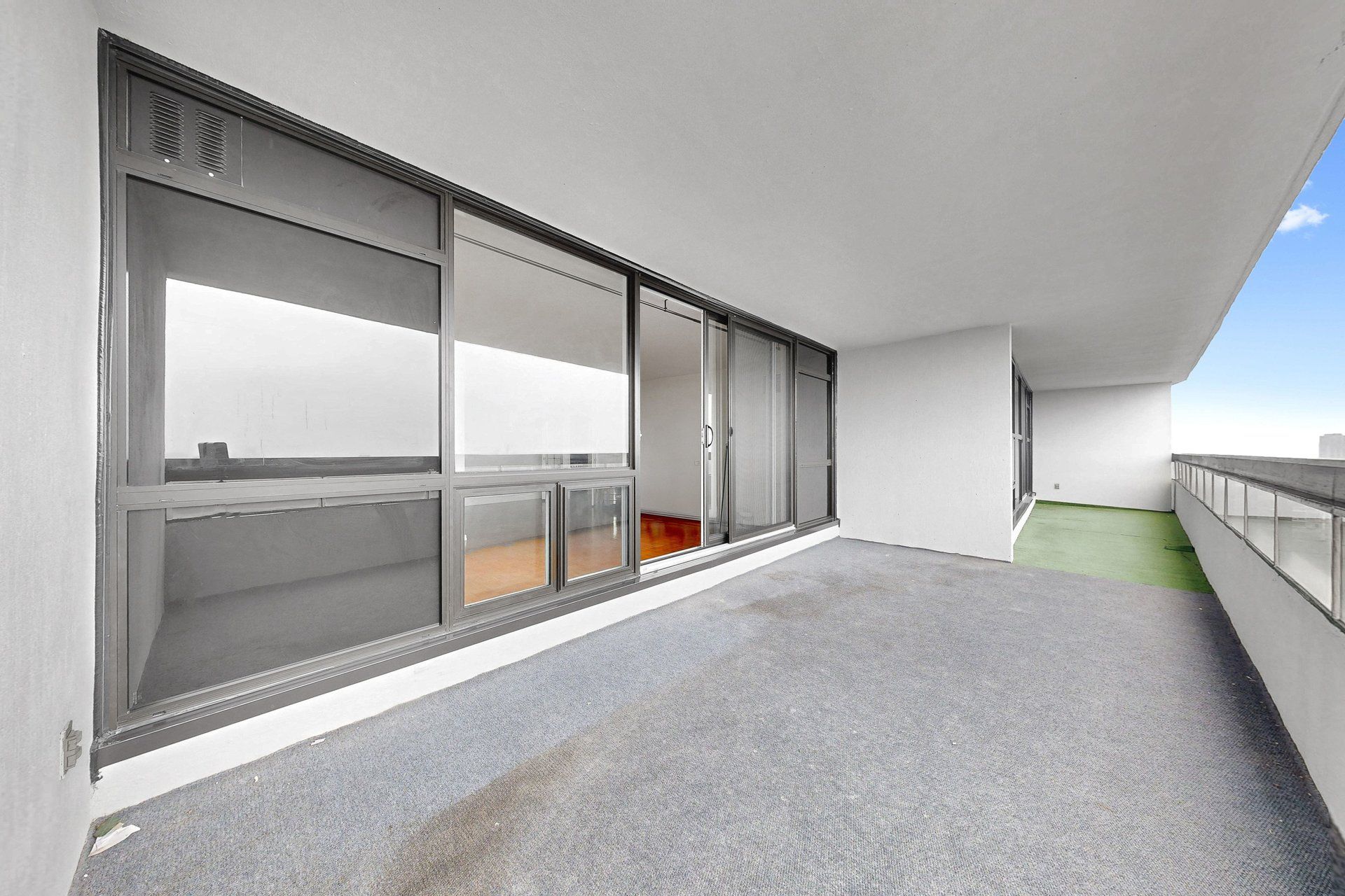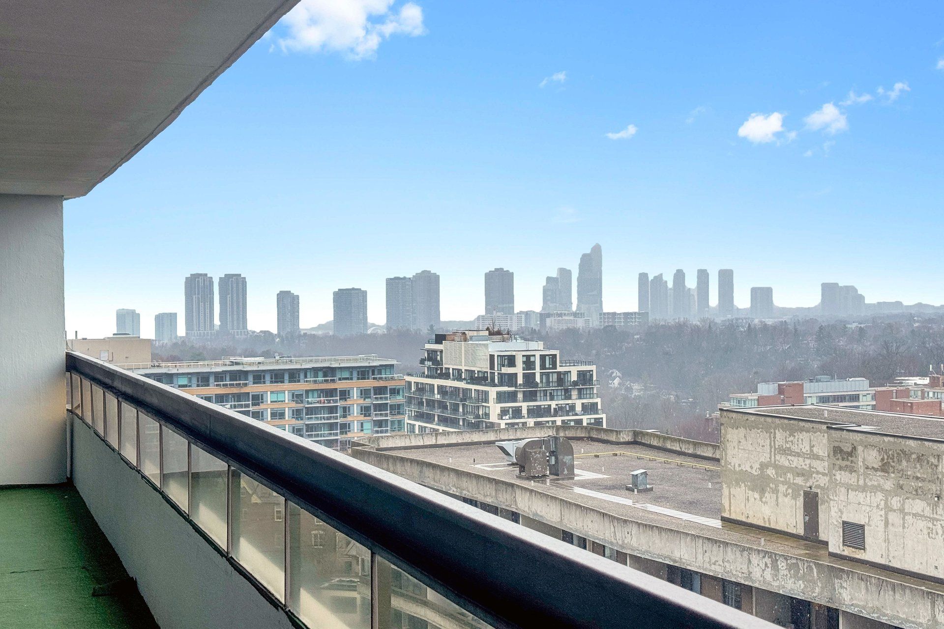 • Large private balcony with sweeping panoramic city views.