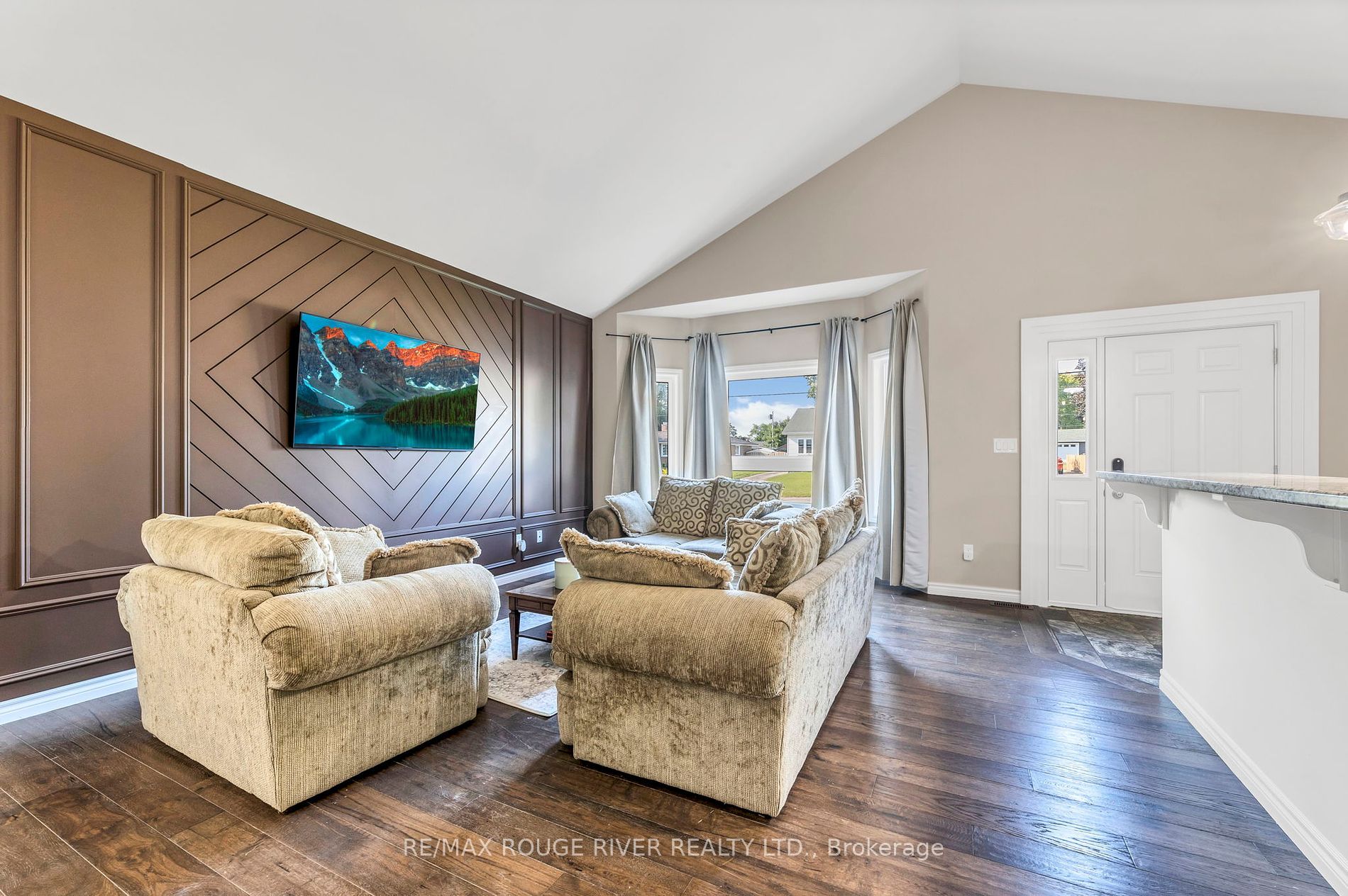 • Open concept living space with cathedral ceilings and modern finishes.