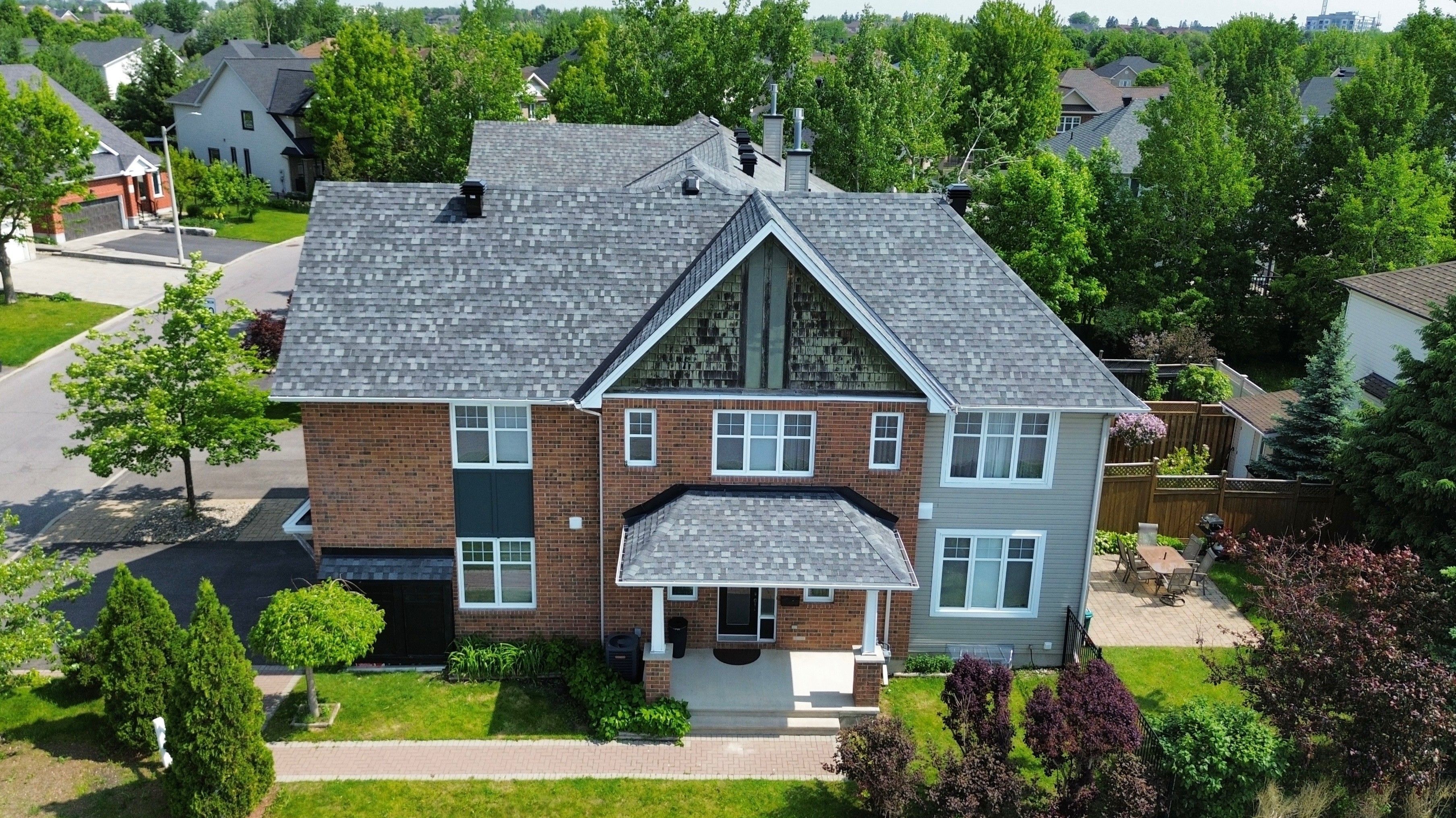 Welcome to this beautifully maintained and thoughtfully designed townhome, offering an ideal blend of comfort, style, and functionality. End unit townhome featuring a double car garage, this home provides both convenience and exceptional living space for modern families. Step inside to a bright and inviting main floor, highlighted by 9-foot ceilings and rich hardwood flooring throughout. The elegant living room is centered around a natural gas fireplace, creating a warm and welcoming atmosphere perfect for both everyday living and entertaining. The adjoining dining area flows seamlessly into the stunning kitchen with shaker-style cabinetry in a striking wood tone extending to the ceiling, and separate island. Patio doors lead to a fully fenced backyard oasis, surrounded by mature trees for added privacy. Enjoy outdoor living with an interlock patio and interlock walkway. Upstairs, offers a versatile loft space, perfect for a home office, reading nook, or additional family area. The spacious primary bedroom retreat features a walk-in closet and a well appointed 4 piece ensuite bathroom with soaker tub and walk in shower. Two additional generously sized bedrooms and the convenience of second-level laundry and family bathroom complete this level. The fully finished lower level expands your living space with a cozy family room featuring a floor-to-ceiling stone electric fireplace, creating a perfect setting for movie nights or quiet evenings at home. This level also includes a utility room with ample storage, ensuring everything has its place. This home is truly move-in ready and meticulously maintained, with a new roof installed in 2025 for added peace of mind. Close to amenities and walking distance to schools. Note: driveway fits 4 vehicles plus 2 garage spaces. 3875 sqft irregular lot