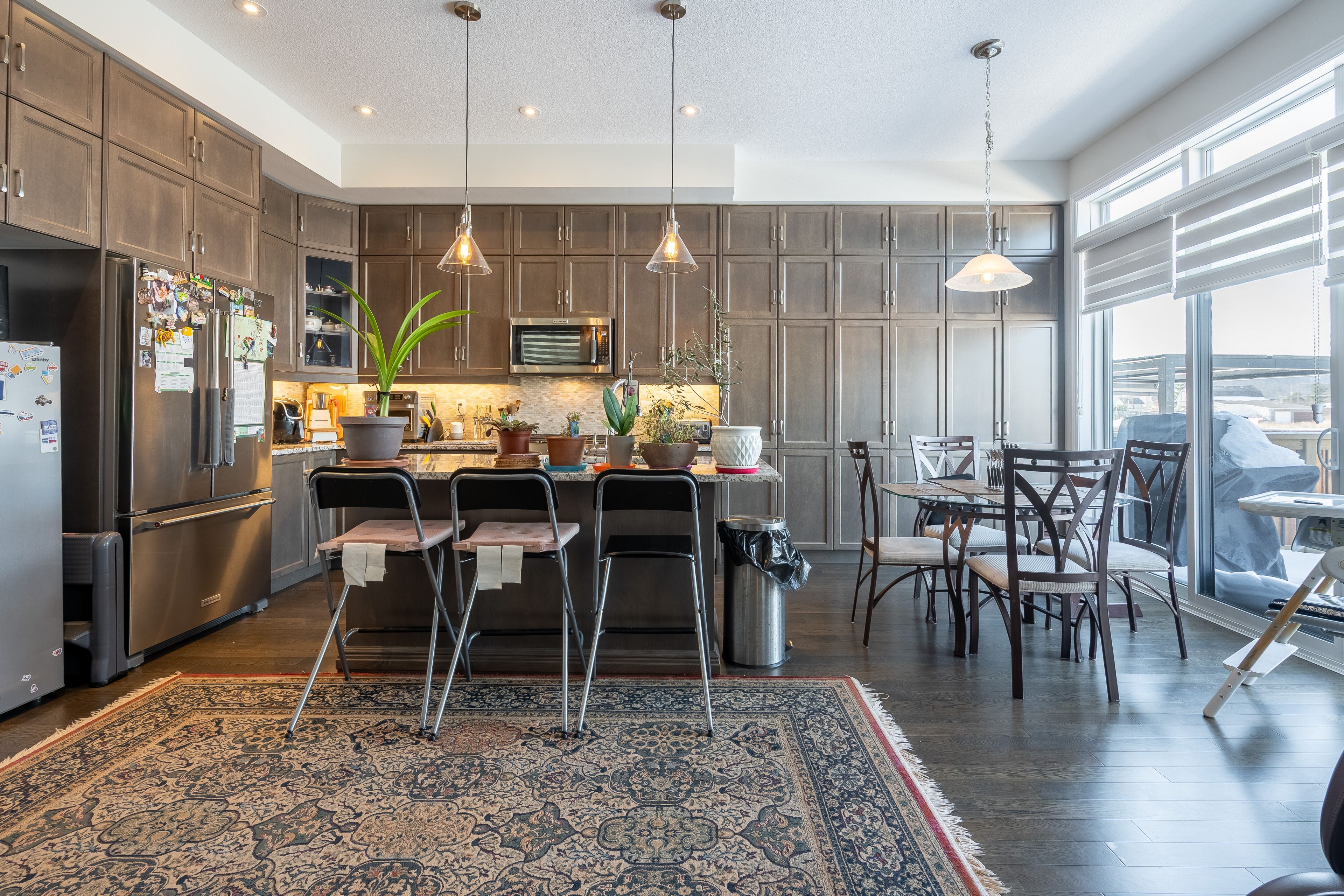 • Bright dining room with large windows and two-way fireplace.