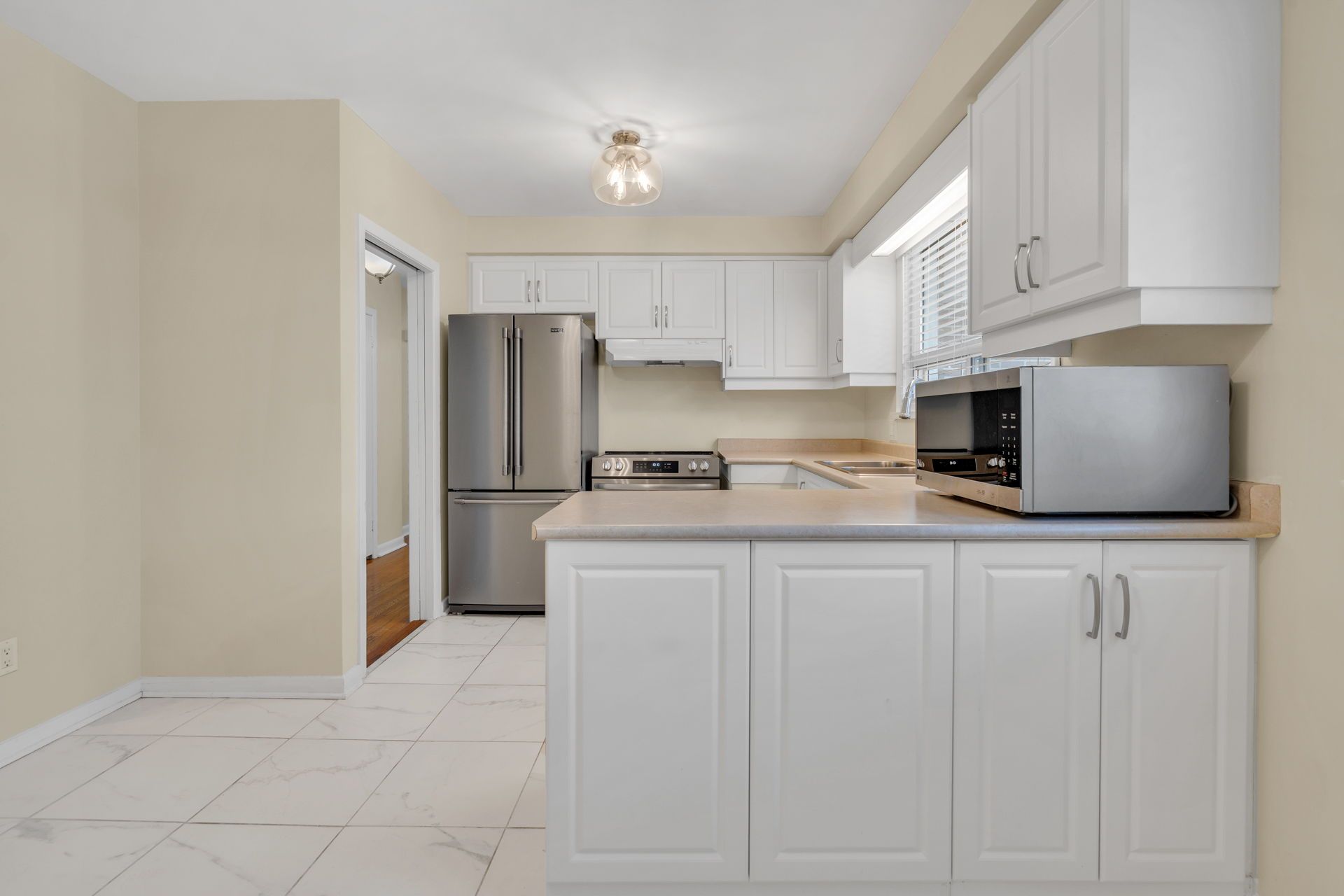 • Modern kitchen with stainless steel appliances and stylish finishes.