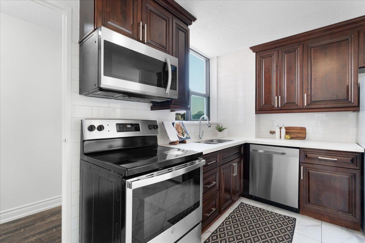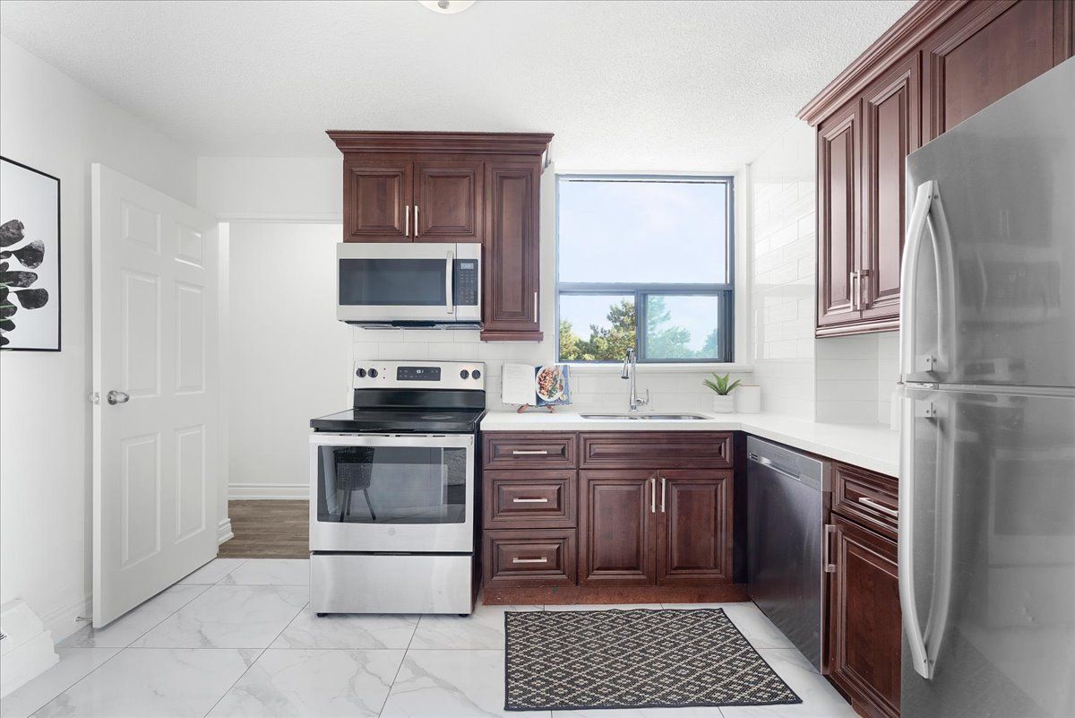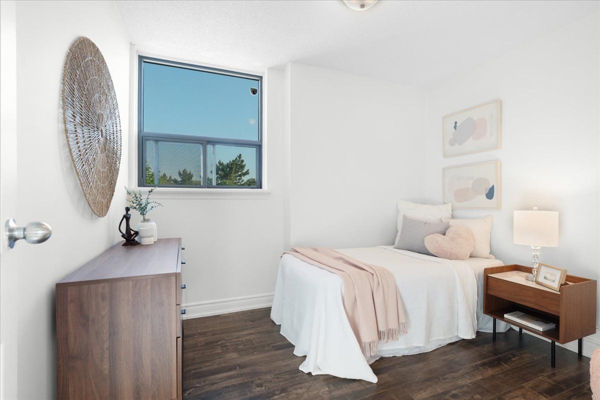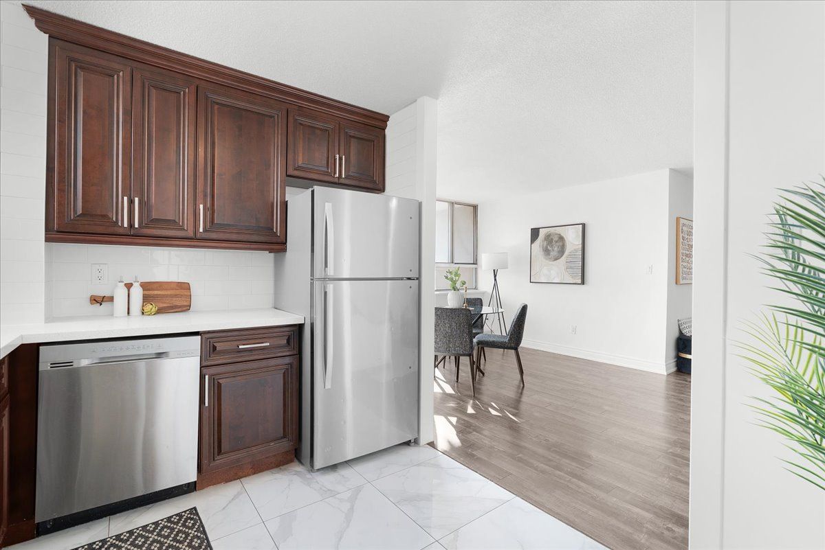 Move-in ready, this beautifully renovated, freshly painted 2 bedroom, 1. 5 bath corner suite offers the perfect blend of space, smart design, serenity and unbeatable convenience: all on a lower floor for easy access without elevator traffic. Enjoy a bright, open-concept living and dining area that's perfect for entertaining, paired with a large updated kitchen featuring full-size appliances, modern countertops, rich cabinetry and an oversized walk-in pantry. This smart split-bedroom layout provides excellent privacy, with each bedroom tucked away on opposite sides of the unit. You'll also find a full size separate laundry room a rare condo convenience! Finally step outside onto your private balcony to unwind with peaceful views in a quiet, end-unit setting. Highlights:all-inclusive maintenance fees: heat, hydro & water and dedicated underground parking. Prime location: ttc transit, schools, shopping, places of worship, parks and hwy 401/407 desirable end unite: quiet, private and filled with natural light new balcony doors/windows december 2025. This is more than a condo it's a smart investment in a great location. Don't miss out on this spacious, stylish, and serene home!