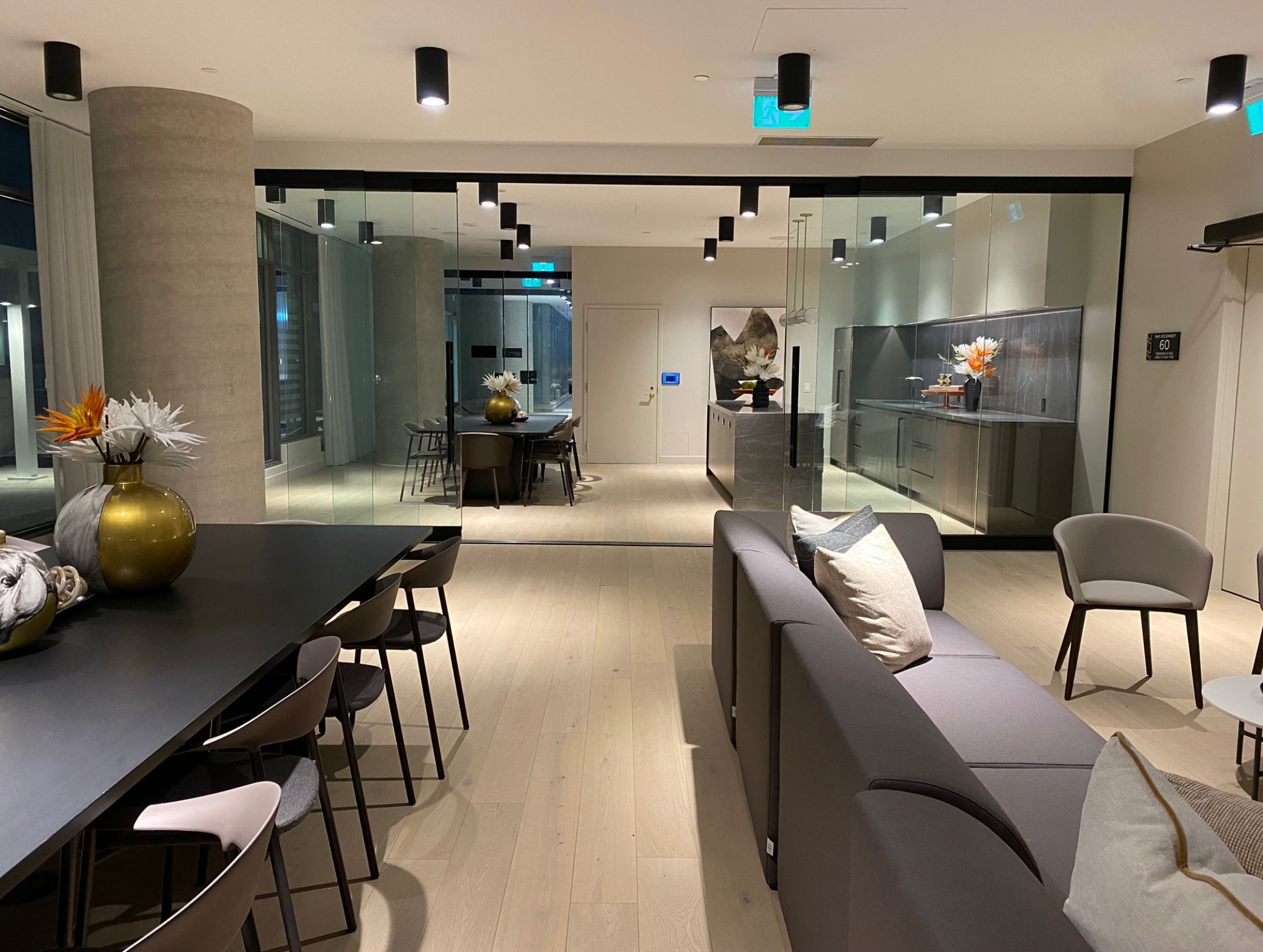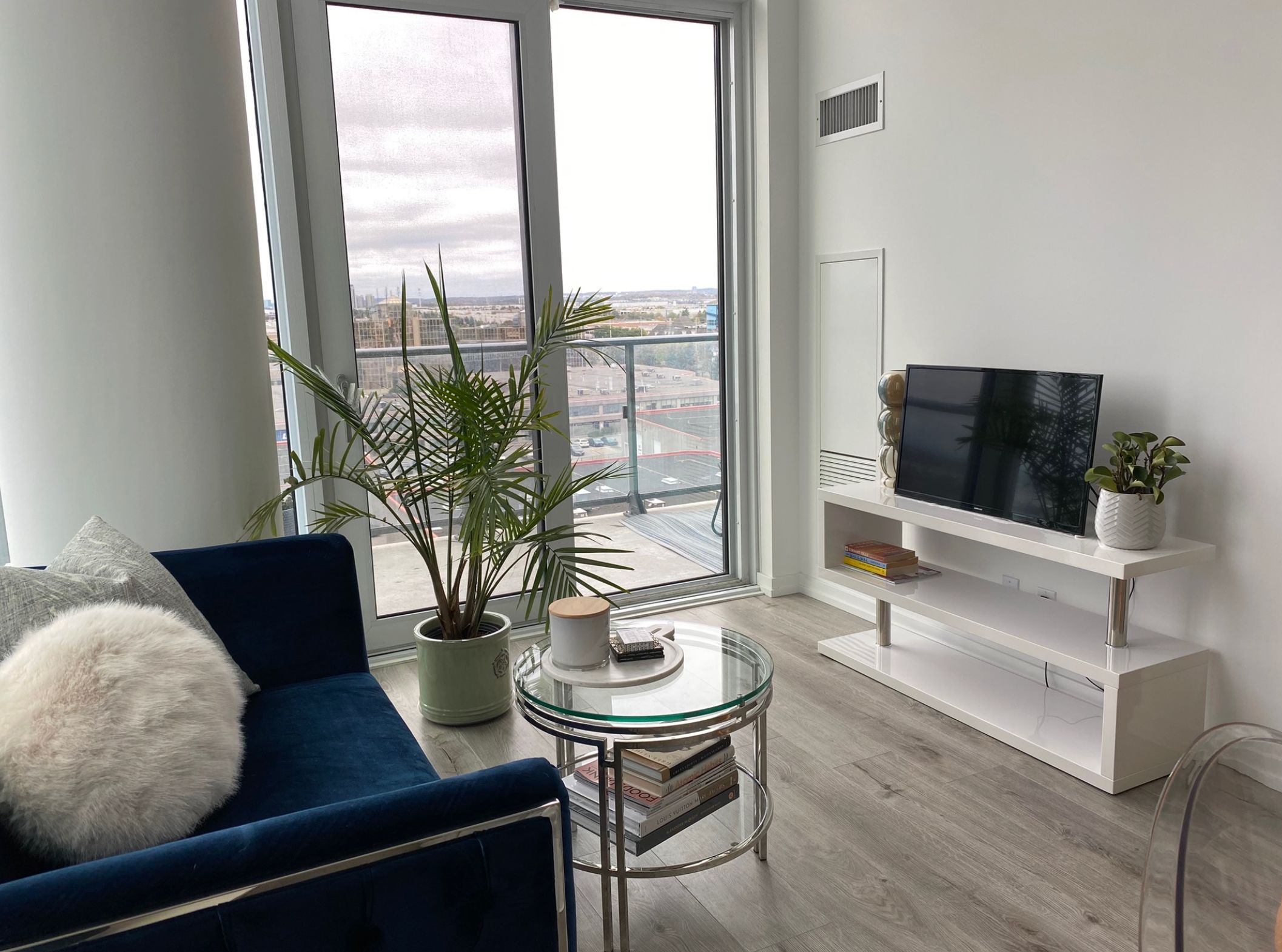 • Open-concept living area with 10 ft ceilings and floor-to-ceiling windows.
