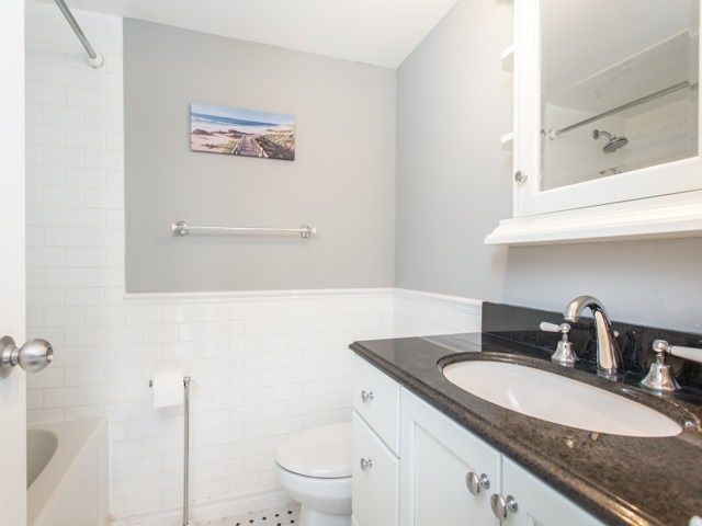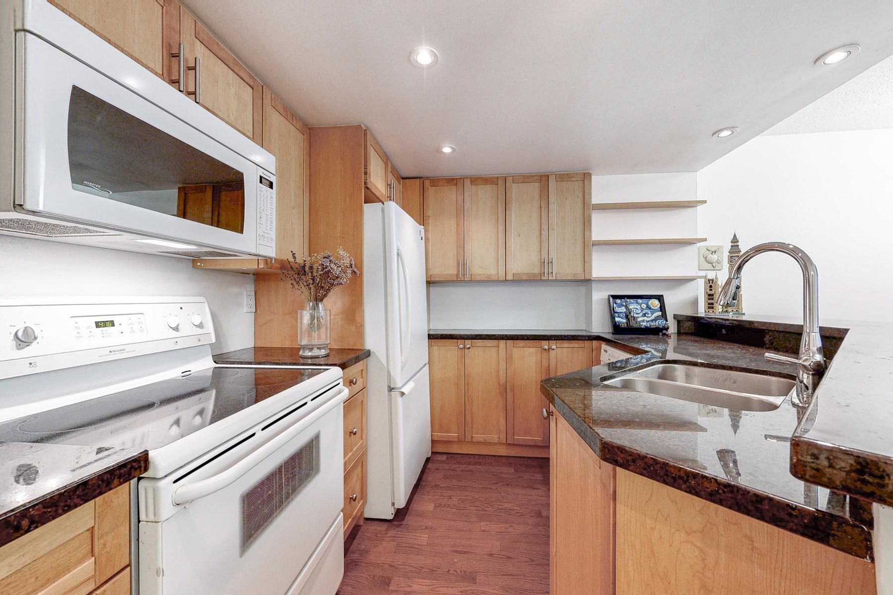 • Updated kitchen features granite counters, pot lighting, and a breakfast bar.
