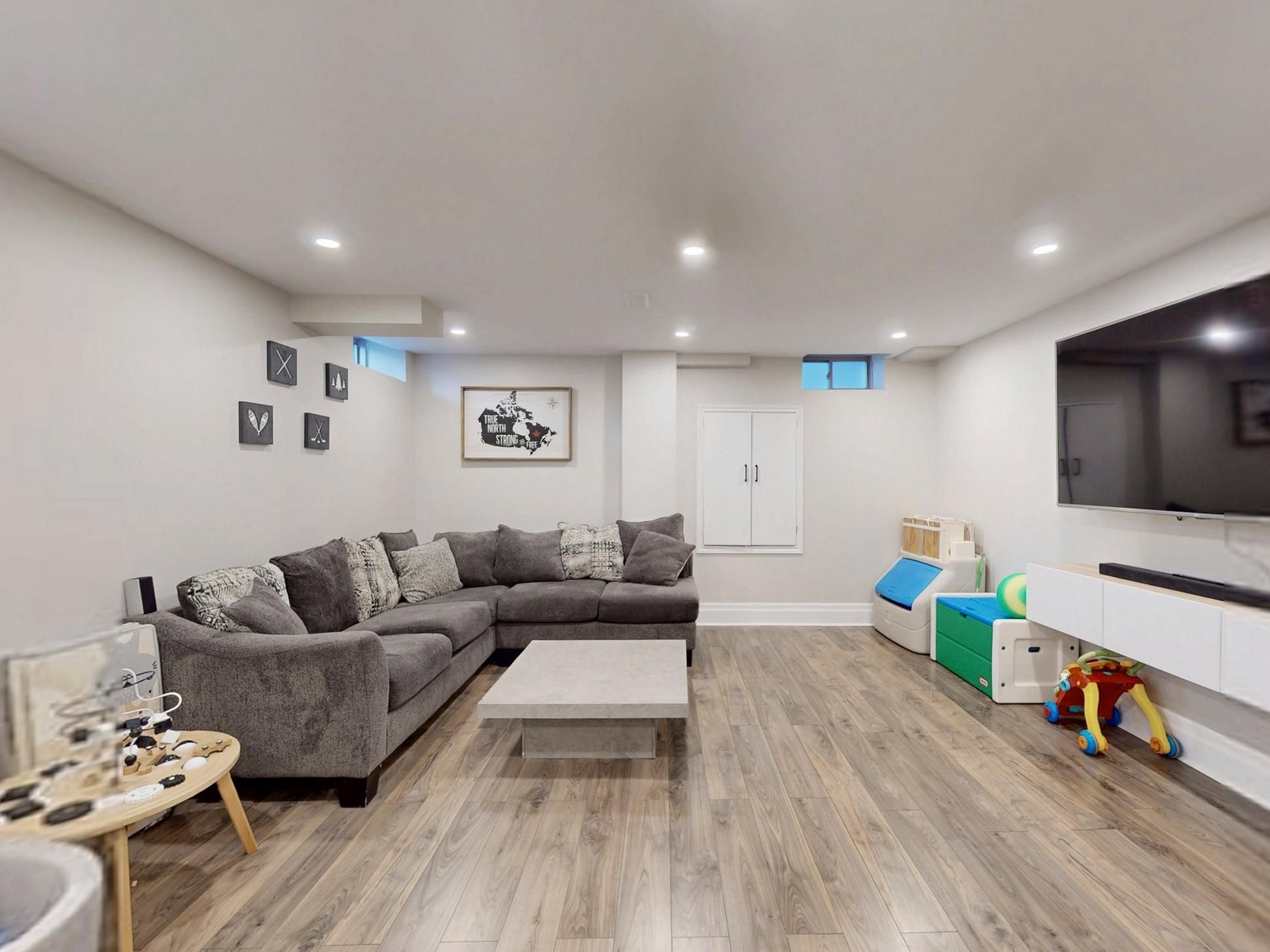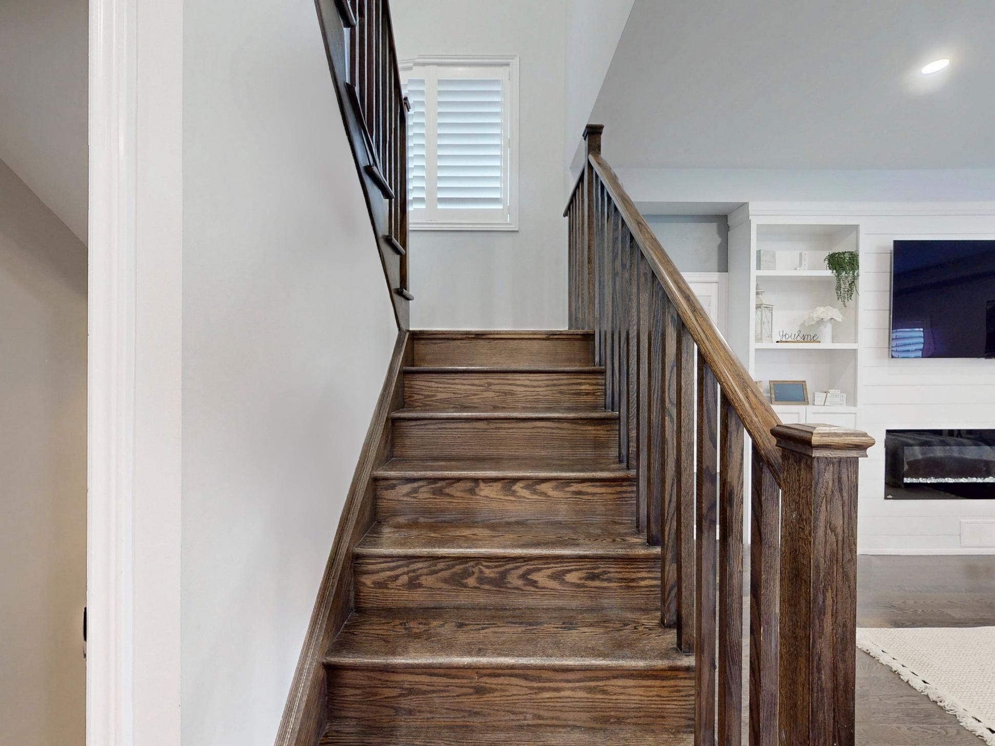 • Bright main floor with a modern fireplace and custom built-ins.