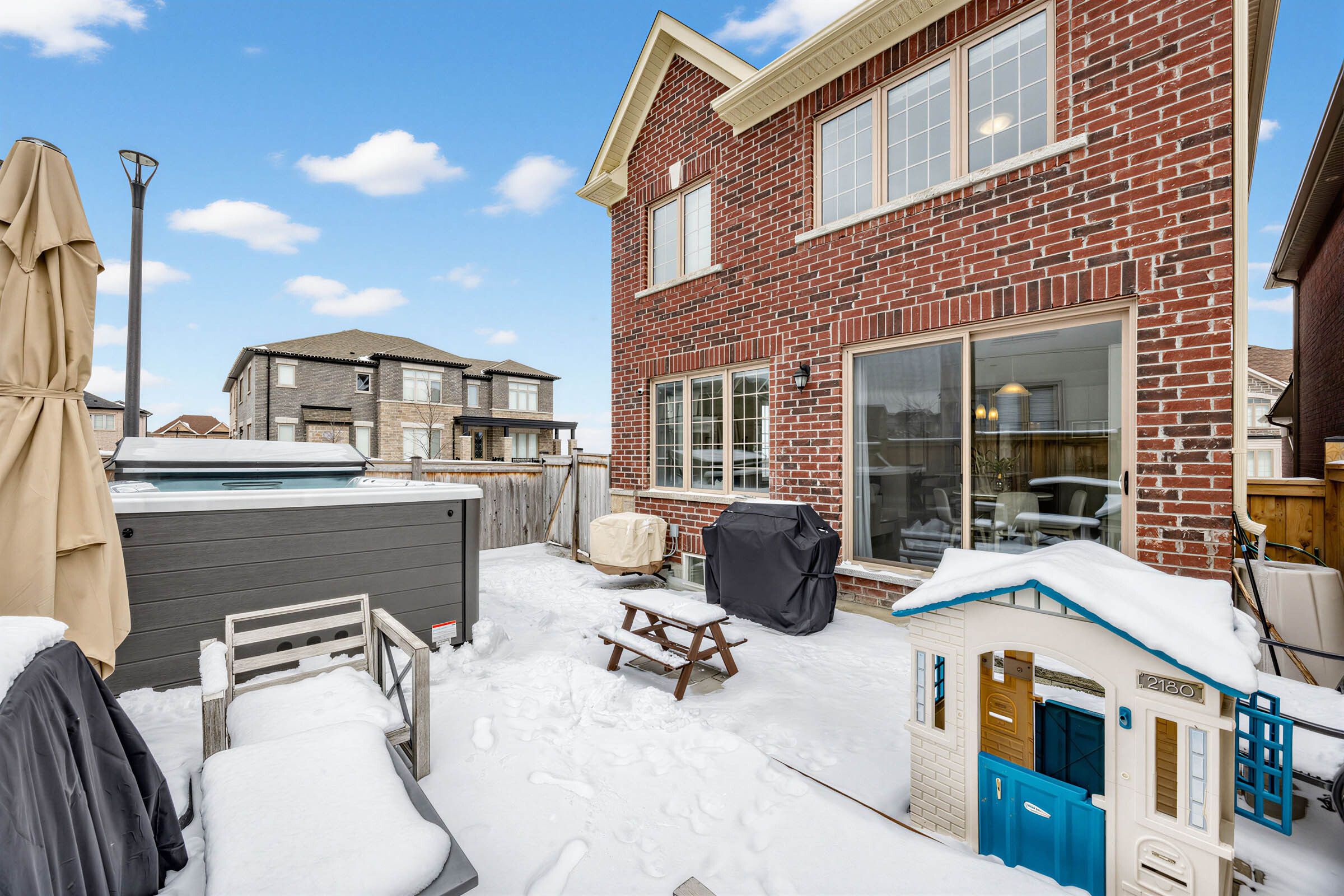 • Fully fenced backyard featuring a heated swim spa and wooden deck.