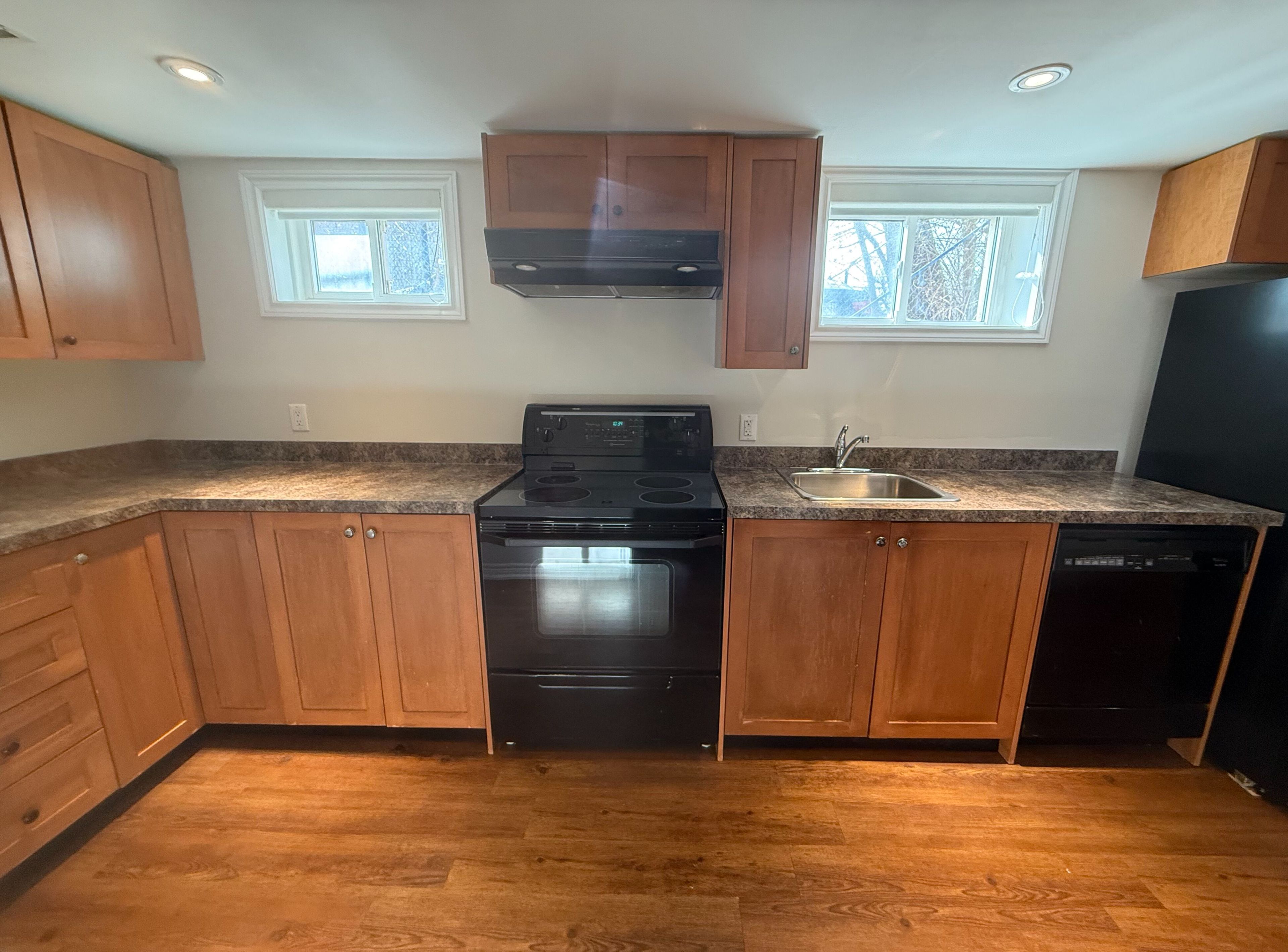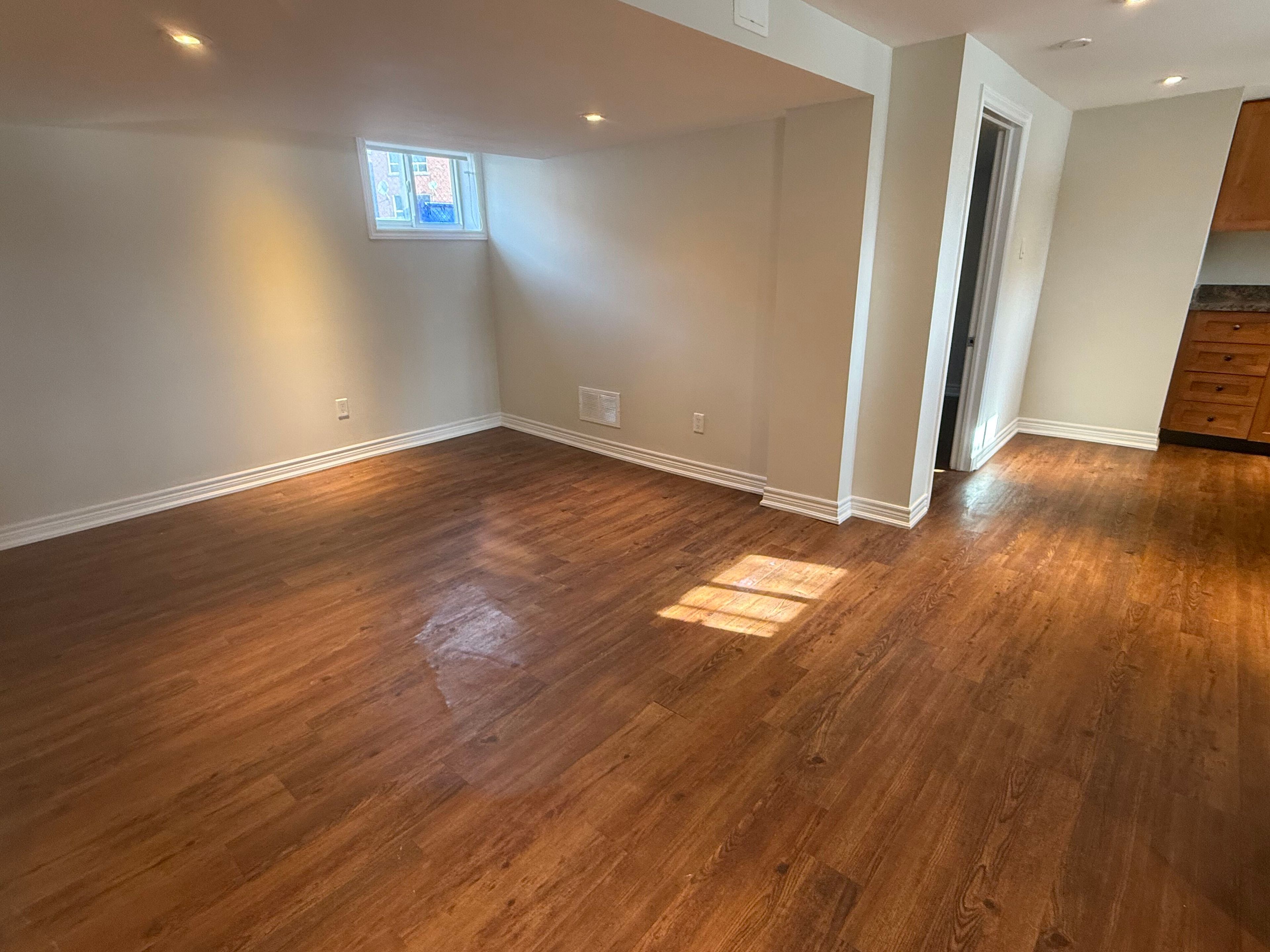 Spacious & bright ! Open concept living/dining/kitchen + 1 bedroom w/ walk-in closet & parking. Many large windows. Big kitchen with tons of cabinet/counter space and full sized appliances. Newer, large 3 pc bathroom w/ glass enclosure. Security lighting. Separate entrance. New window coverings for full privacy. No carpet anywhere. Very comfortable space ! Shared use of backyard < please no pets or smokers > < max occupancy 2 people > ensuite laundry. Excellent transit/commute options with a 7 min walk to the eglinton lrt now open or 11 mins to mount dennis upx or go trains to downtown !! Walk to york rec centre / eglinton flats park. With golf & shopping near by.
