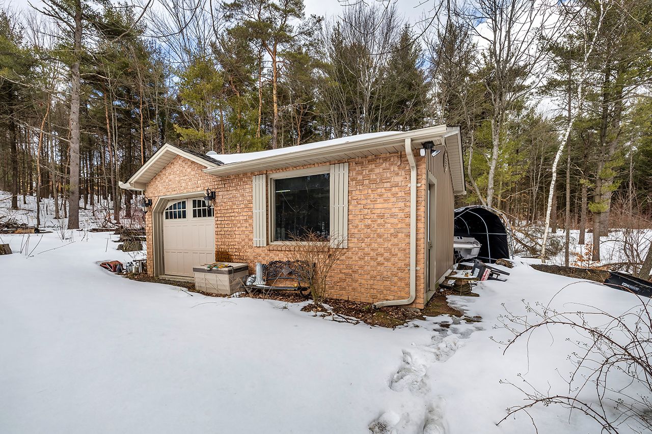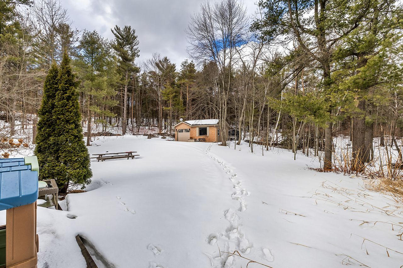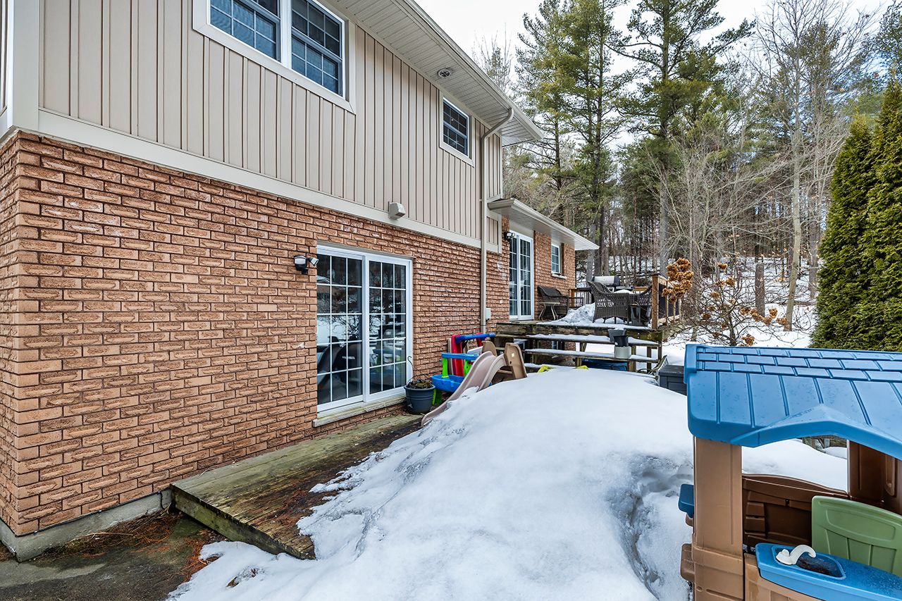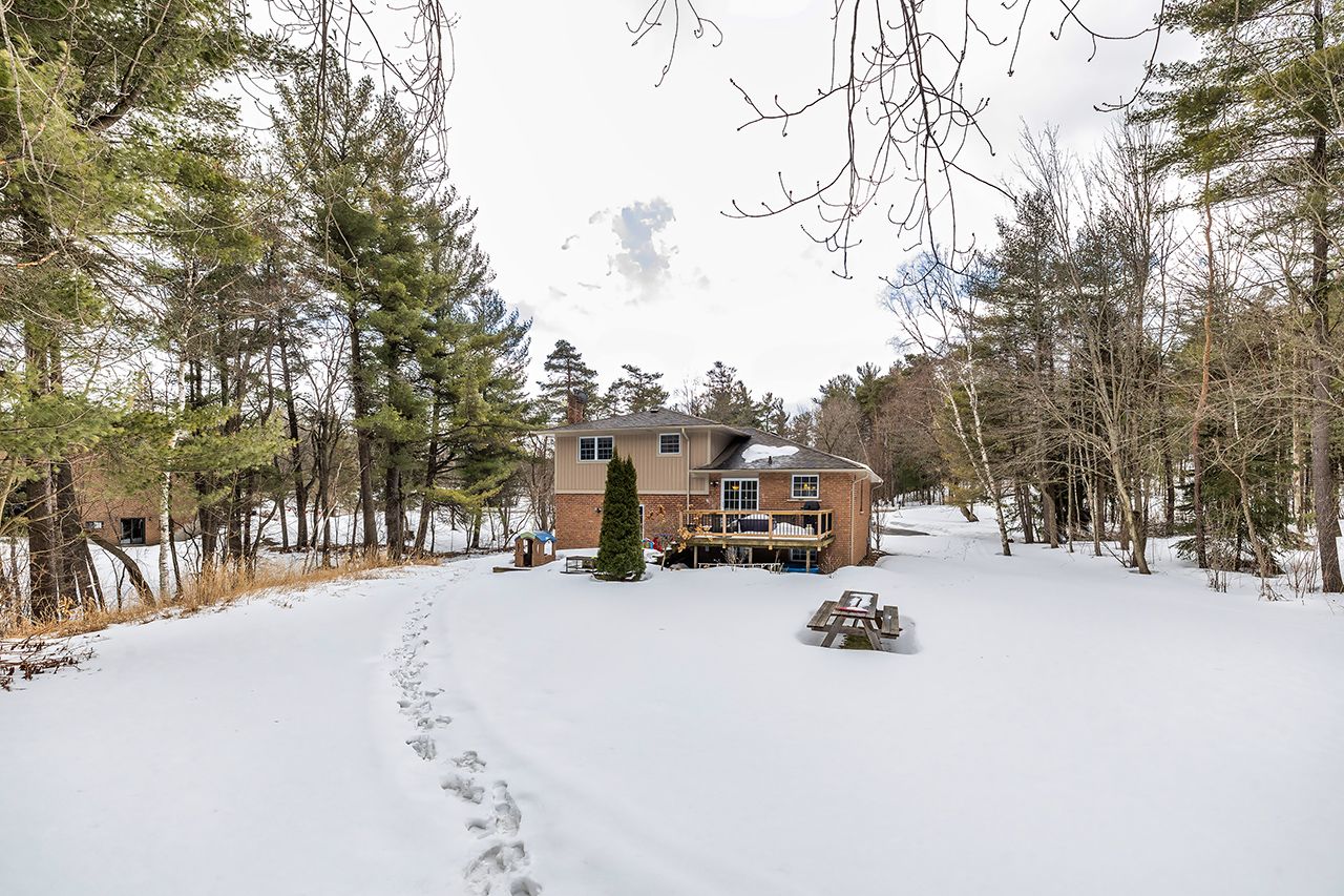 A nature lover's paradise! Nestled in picturesque burketon station, this idyllic property sits on a beautifully wooded 2 acre lot and features a long circular driveway leading to a spacious 1,918 sqft 5-level sidesplit. The stunning kitchen is a true chef's dream, complete with granite countertops, a large island with breakfast bar, custom cabinetry, gleaming hardwood floors, herringbone marble backsplash, stainless steel appliances, pot lighting, pantry with roll-outs, abundant pot and pan drawers, lazy susan, beam ceilings, and a walk-out to the deck. The main floor family room offers hardwood flooring, pot lights, a walk-out to the deck, and a striking (non-functional) fireplace feature. Ceramic flooring carries through the front entry into the main floor powder room and a convenient laundry/mudroom combo offering both direct garage access and a walk-out to the side yard. The lower level boasts a massive rec room with an oak bar and bright above-grade windows, while the fifth level adds flexibility with a newly finished office, a fourth bedroom, and ample storage space. Upstairs, you'll find three generously sized bedrooms serviced by two beautifully updated bathrooms featuring solid surface countertops and vinyl flooring. The primary bedroom offers a walk-in closet and a spa-inspired ensuite with an oversized glass shower. New vinyl flooring runs throughout the upper-level bedrooms and bathrooms. Additional highlights include a fantastic 288 sqft outbuilding with a garage door (built in 2000), serene wooded views from every room, and complete backyard privacy - offering the perfect blend of nature, space, and tranquility to call home.