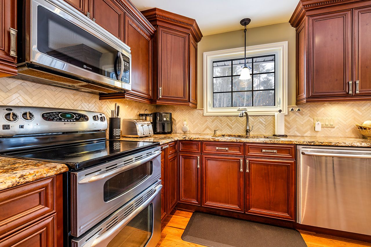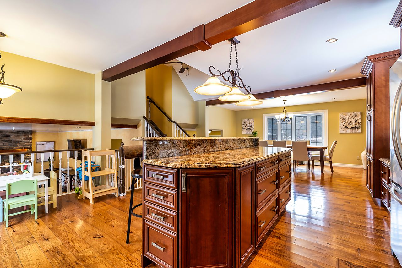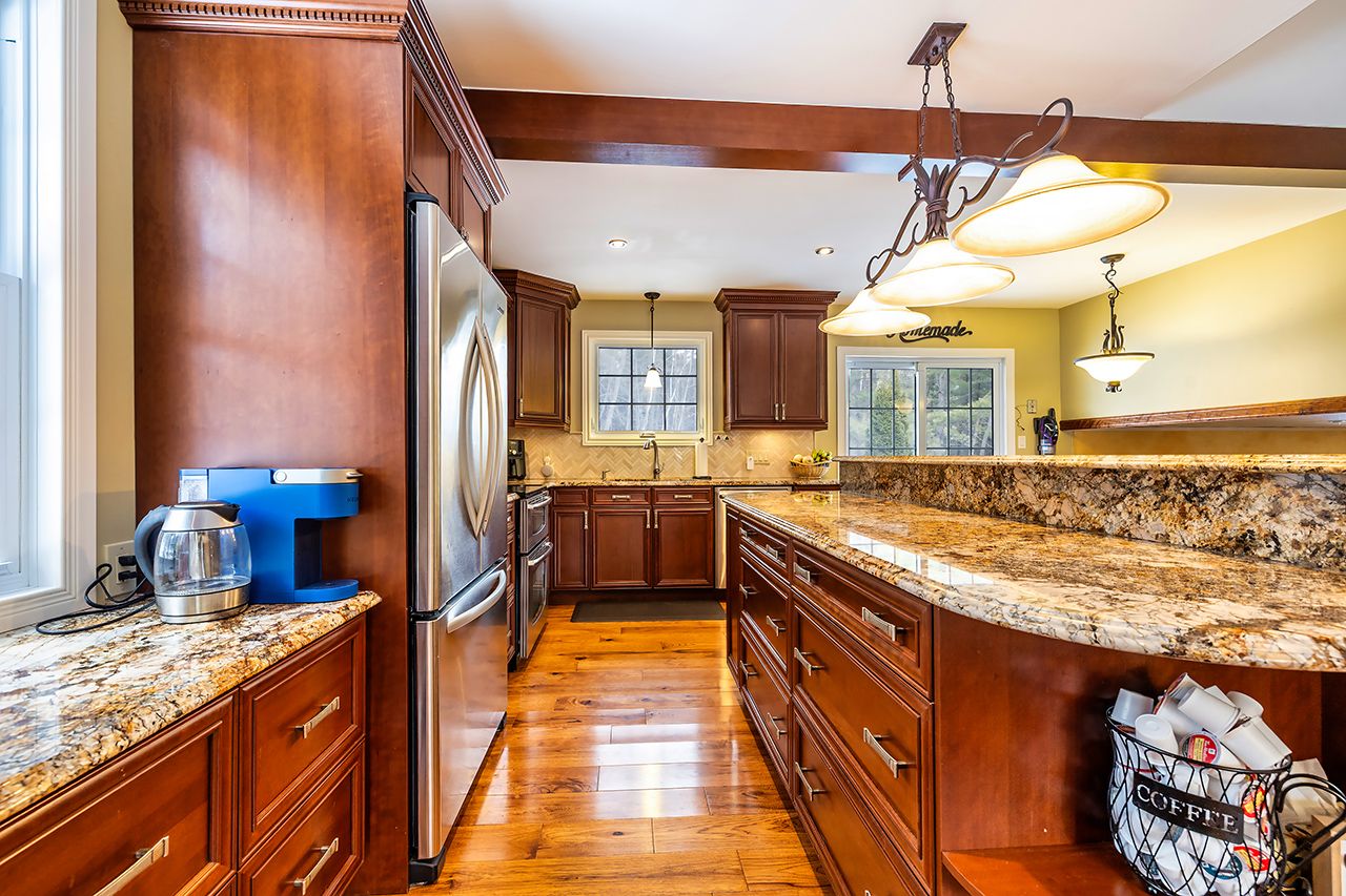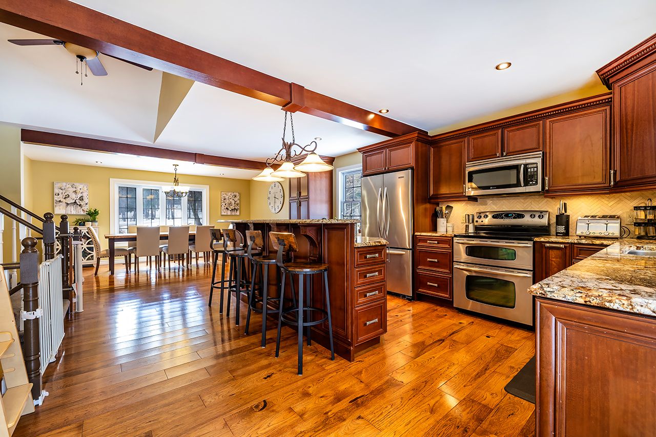 • Gourmet kitchen features granite countertops and a large island for cooking.