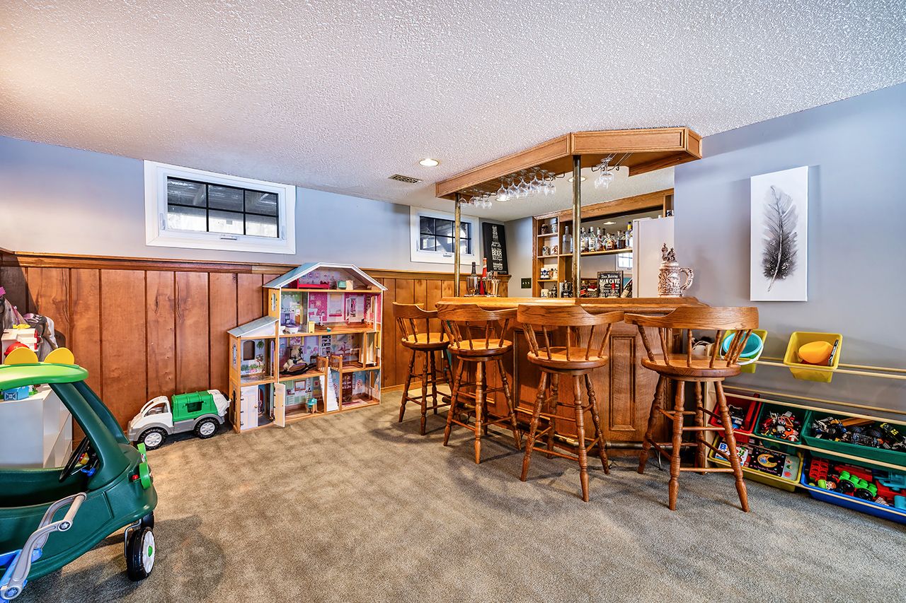 • Massive rec room with bright windows, oak bar, and flexible office space.