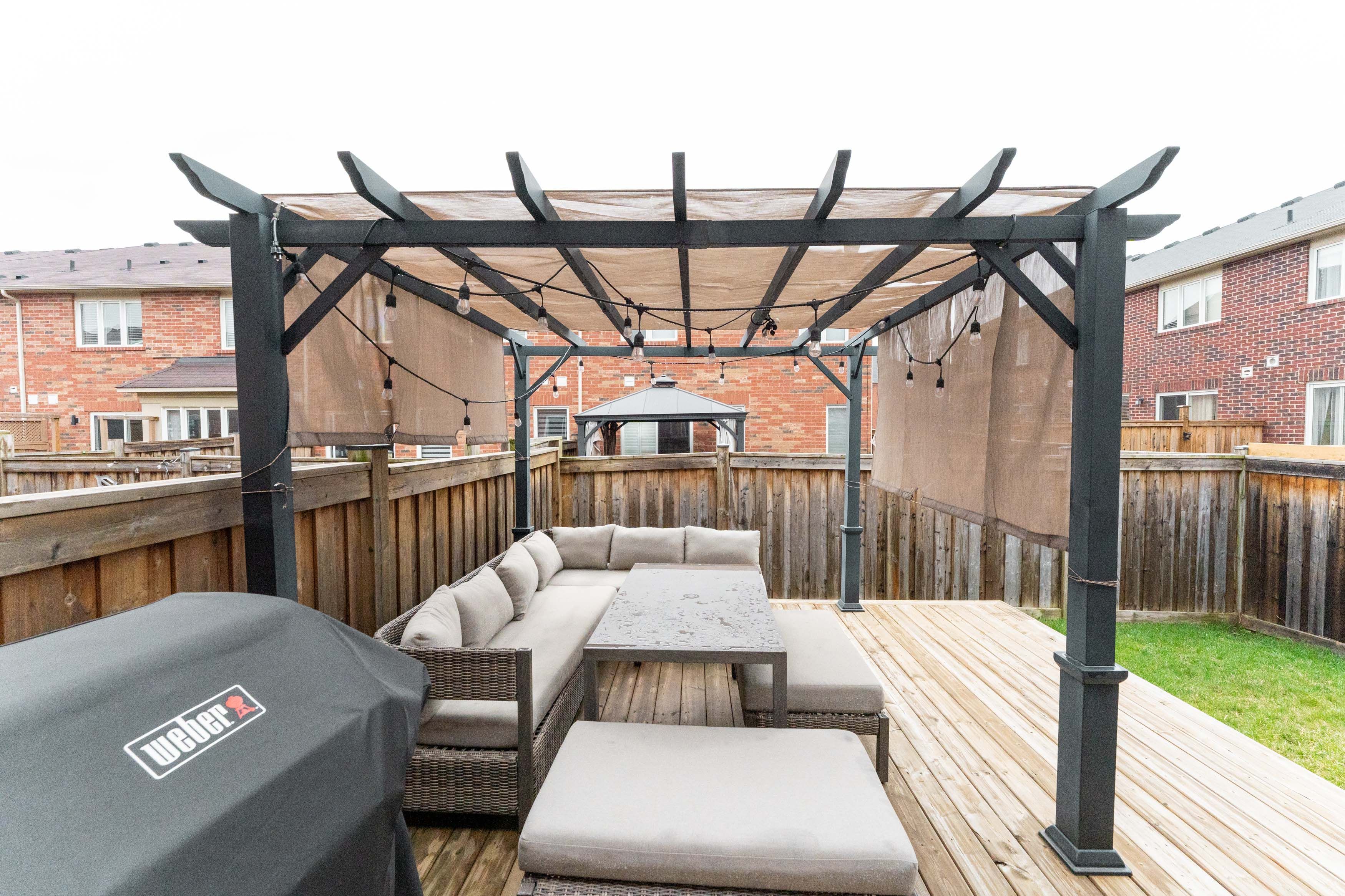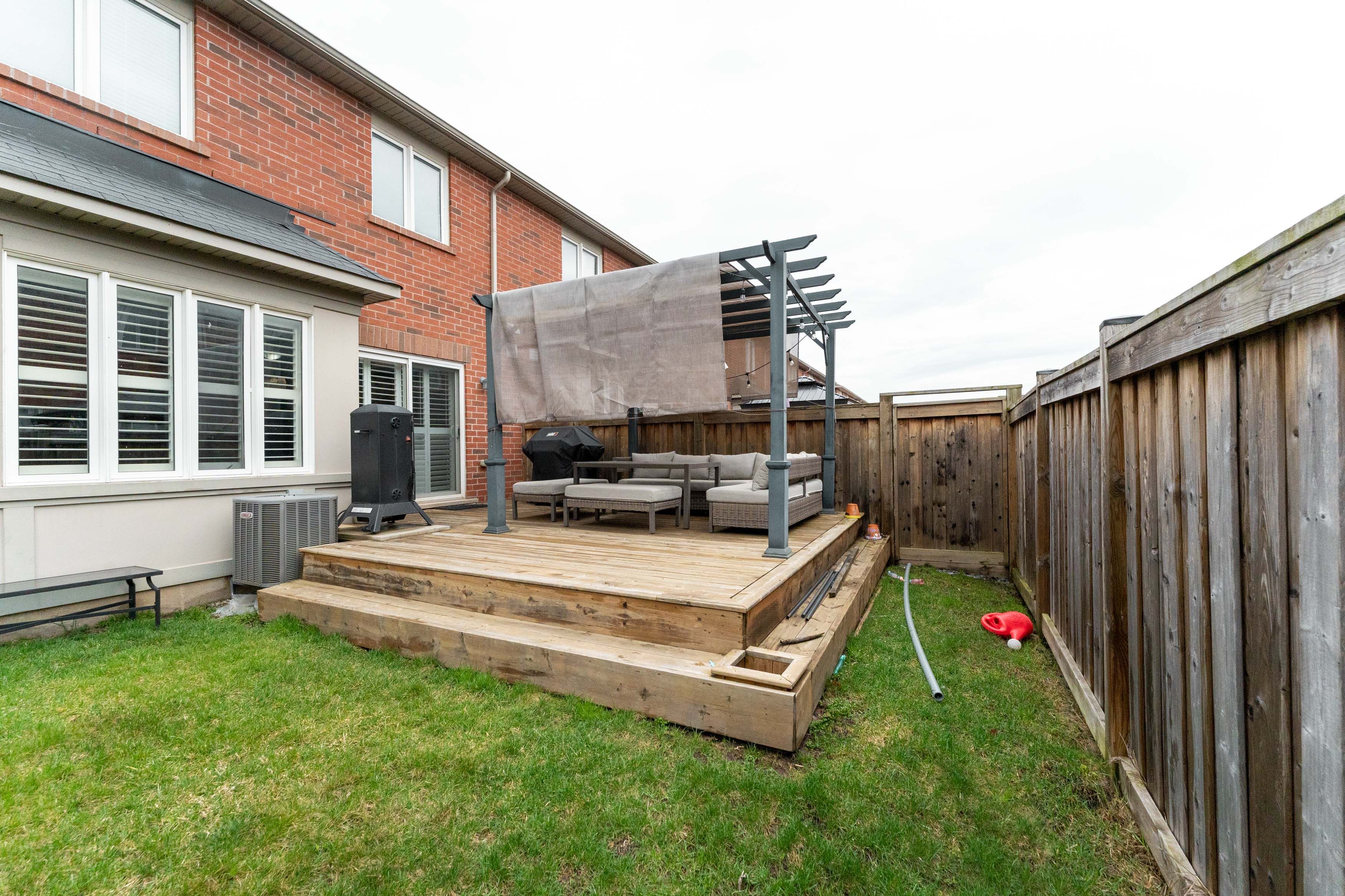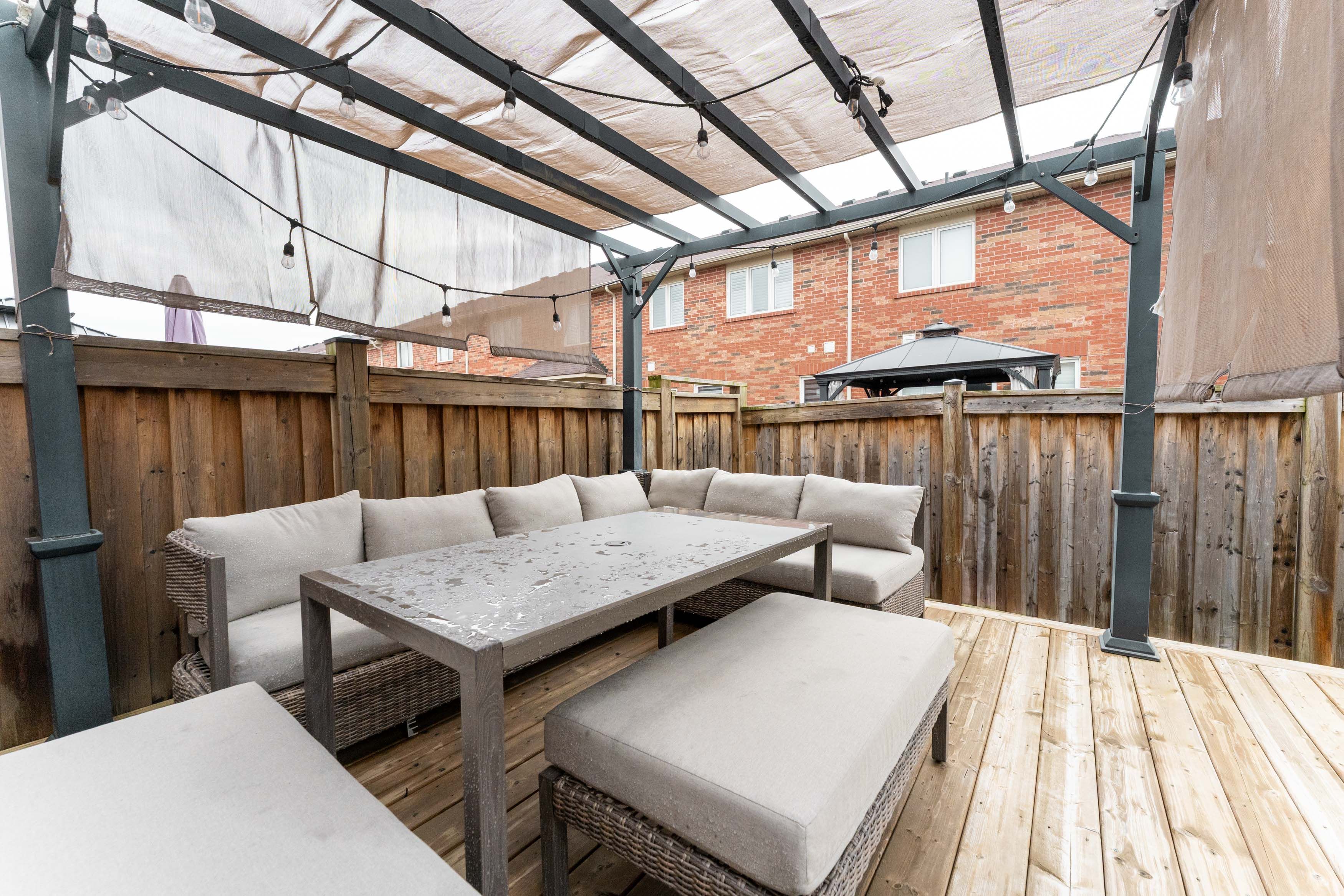 • Fully fenced backyard with a deck and gazebo for outdoor enjoyment.
