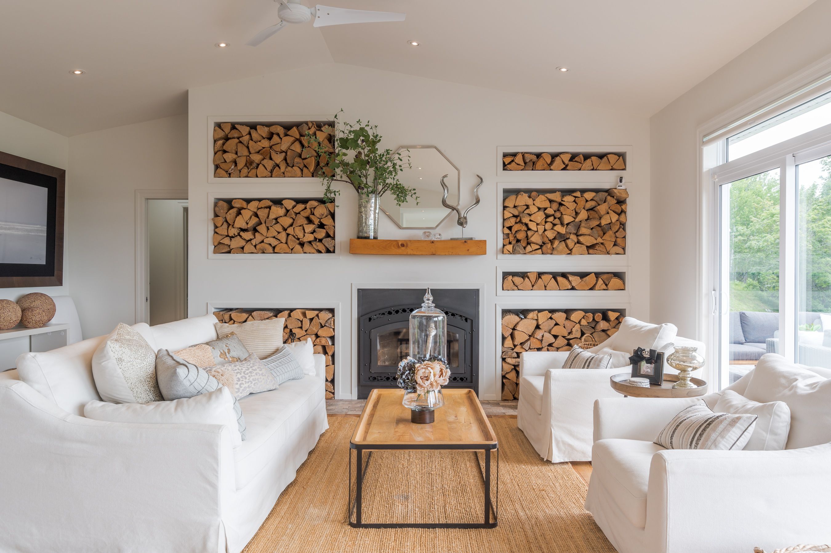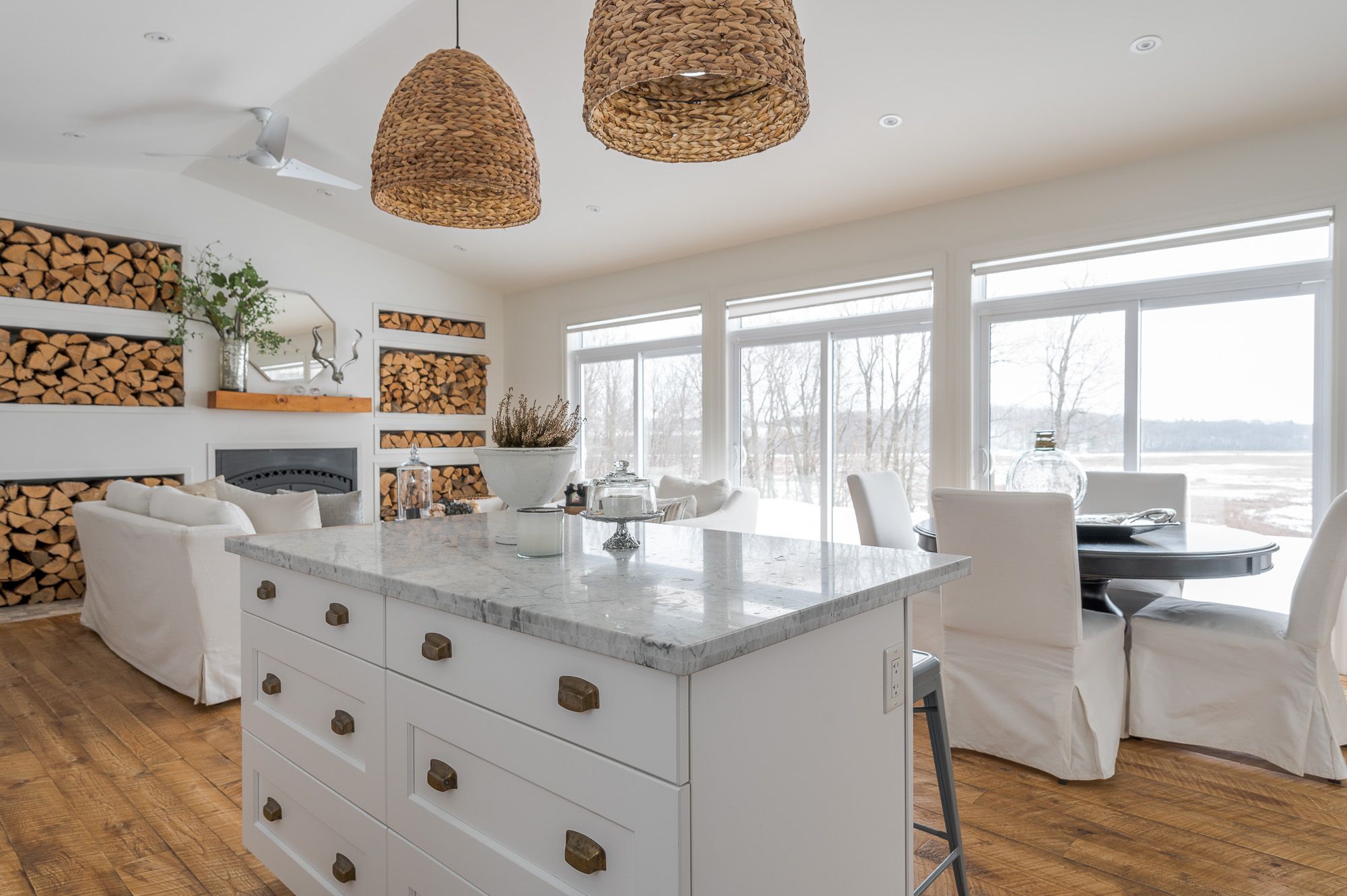 • Main living area features cathedral ceilings and a warm wood-burning fireplace.