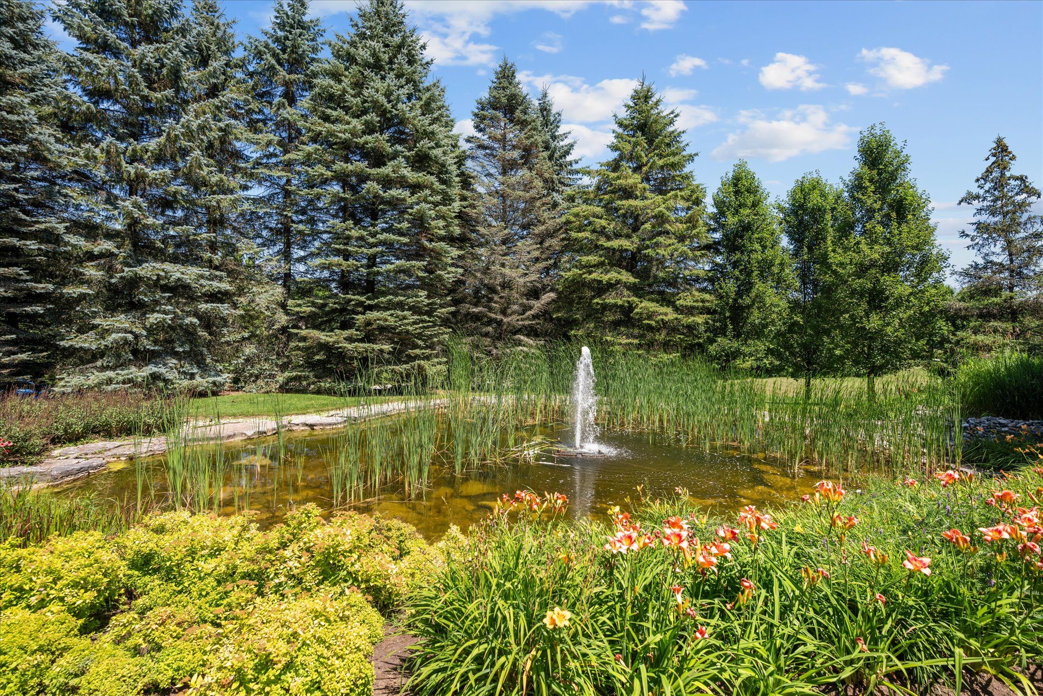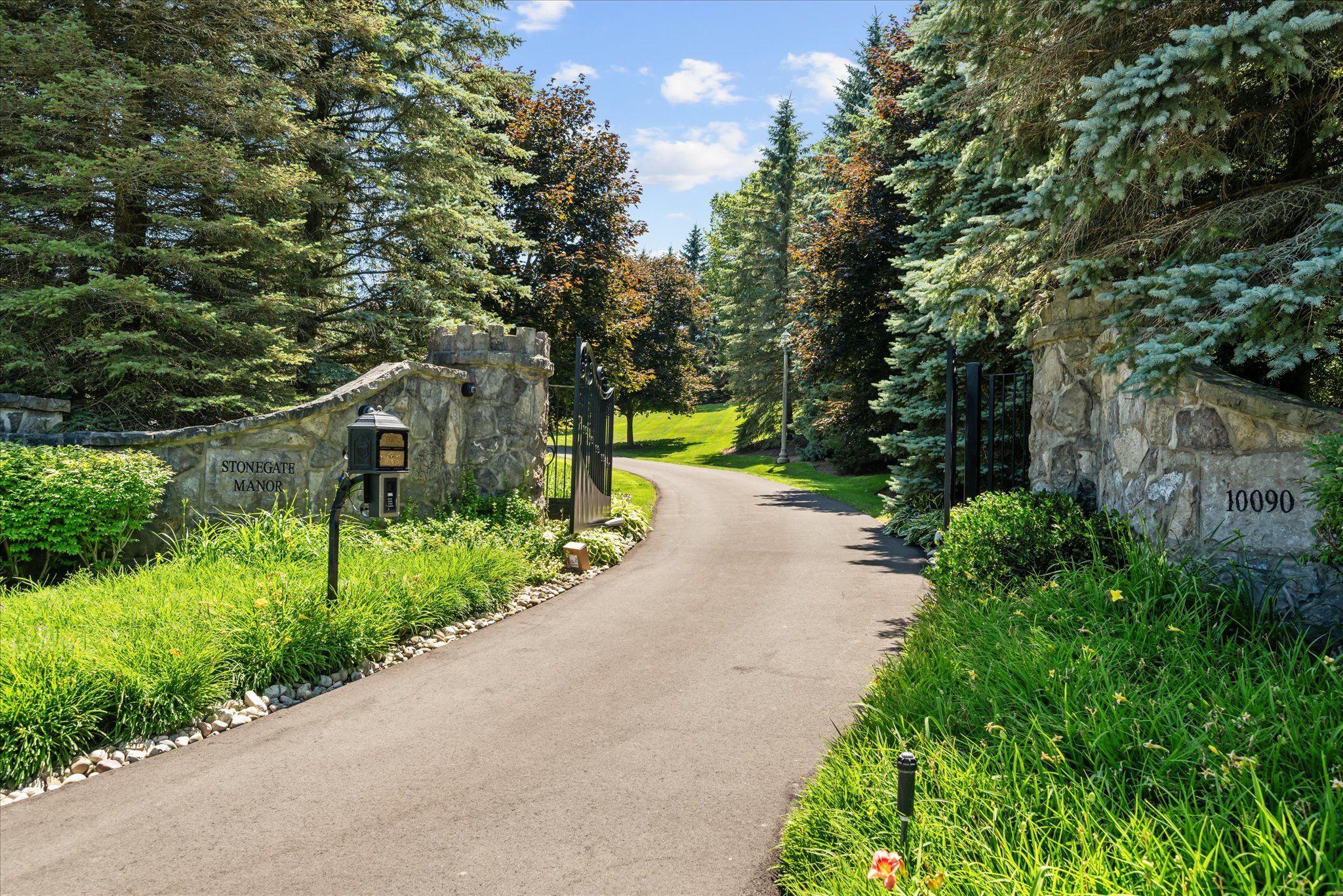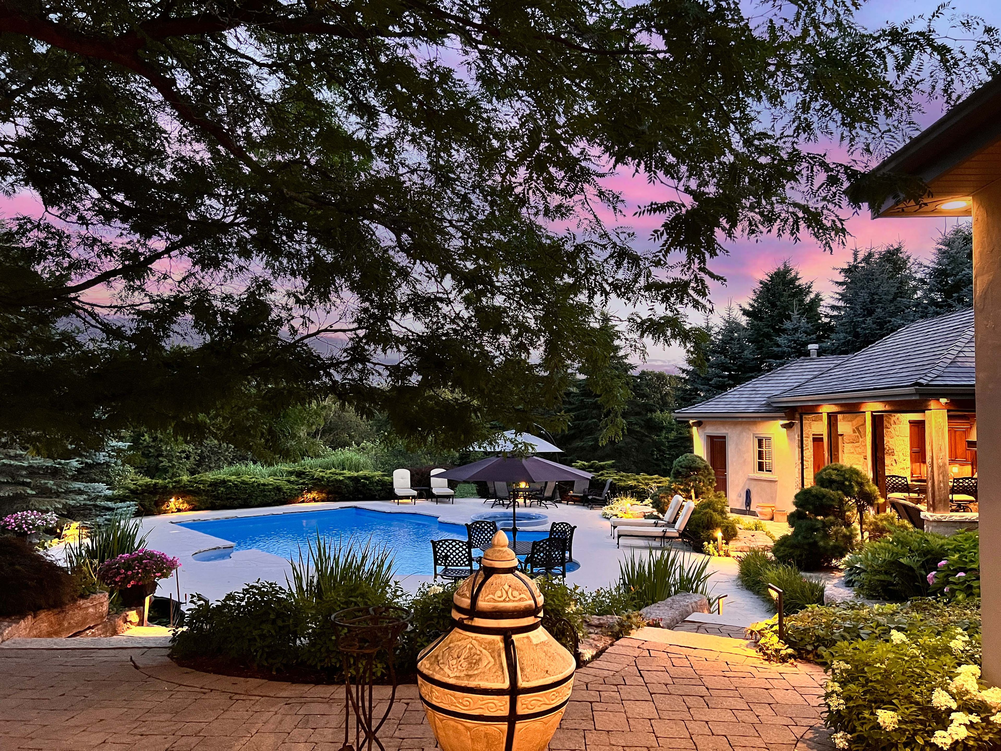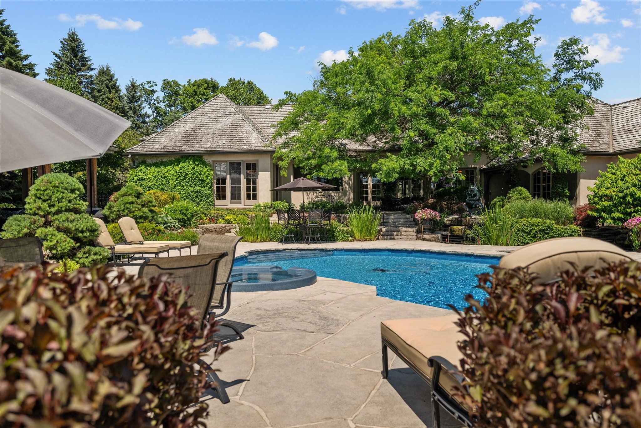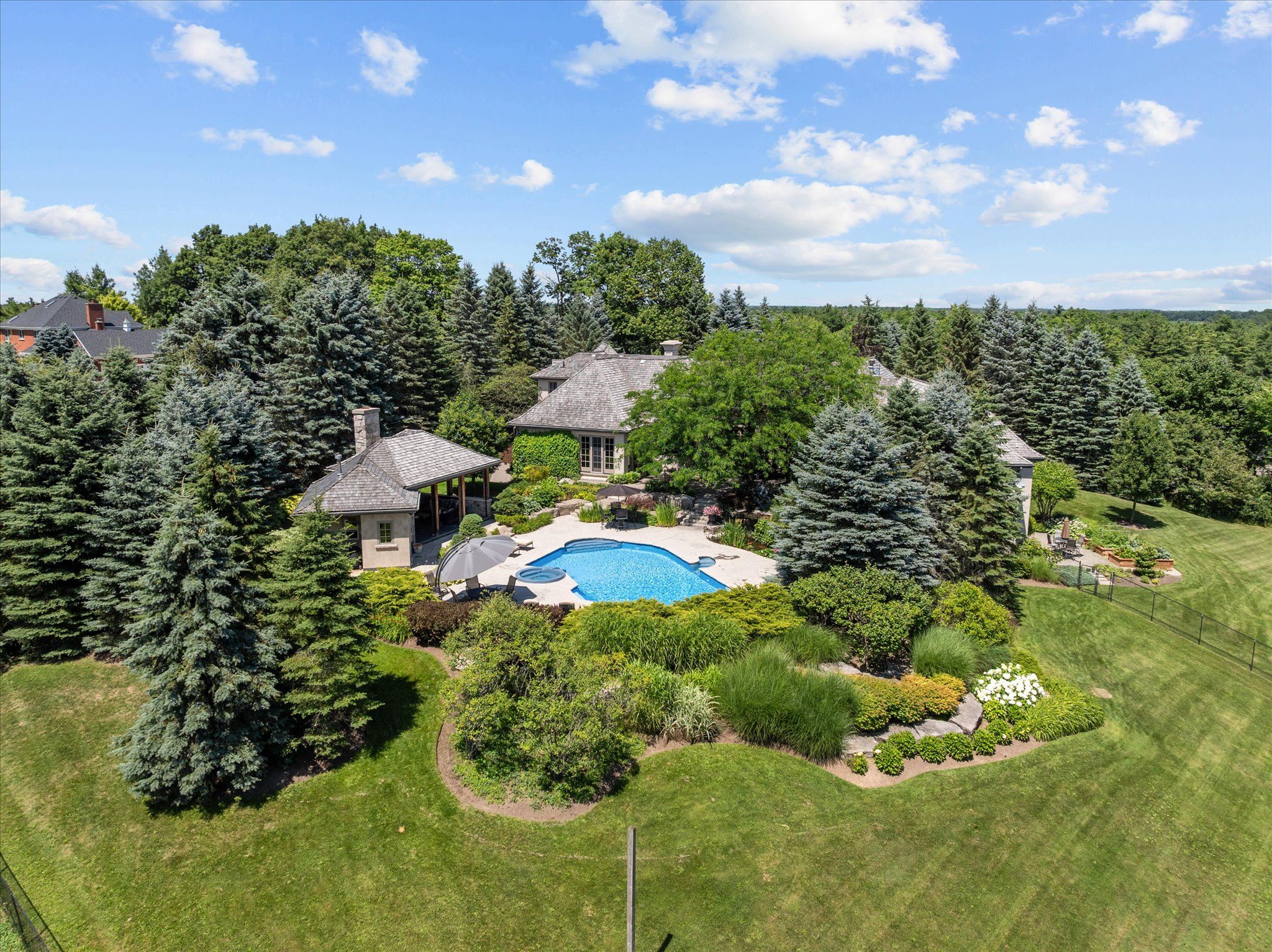 Stonegate manor - an architectural masterpiece! Nestled on 2. 5 acres of manicured grounds behind private gates in prestigious whispering pines estates, stonegate manor is a palatial estate crafted by an award-winning builder. A picturesque pond with fountain greets you at the foot of the driveway, setting the tone for timeless french manor-inspired elegance. A grand foyer with 17. 5-foot cathedral ceiling and hand-painted mural opens to a living room with 18-foot vaulted ceiling, two-storey cherrywood gas fireplace and expansive windows flooding the space with natural light. The chefs kitchen features a 48" wolf gas range, sub-zero fridge, miele dishwasher, servery, and three sets of french doors opening to a private courtyard. The formal dining room connects to a wine cellar with antique asian doors, while a private office with 15-foot vaulted ceiling, gas fireplace and built-ins offers a refined workspace. The luxurious primary suite boasts a 14-foot vaulted ceiling, courtyard walkout, gas fireplace, walk-in closet, gym, and spa-inspired 7-piece ensuite with clawfoot tub and steam shower with built-in chaise. A lofted entertainment area features a 14-foot vaulted ceiling, wet bar, pool table, theatre setup, and powder room. The finished lower level includes heated floors, full kitchen, 3 bedrooms, 2 baths, and walkout to a private patio - ideal for multi-generational living. Resort-style amenities include an inground saltwater pool with integrated hot tub, standalone hot tub, koi pond, and an additional pond with fountain. The cabana features a wood-burning fireplace, kitchen, seating, automatic mosquito screens, 2-piece powder room, and change room. Additional highlights: elevator to all levels, crestron home automation, oversized 3-car garage, and new concrete/asphalt driveway. A rare offering of elegance and lifestyle - just minutes north of campbellville!