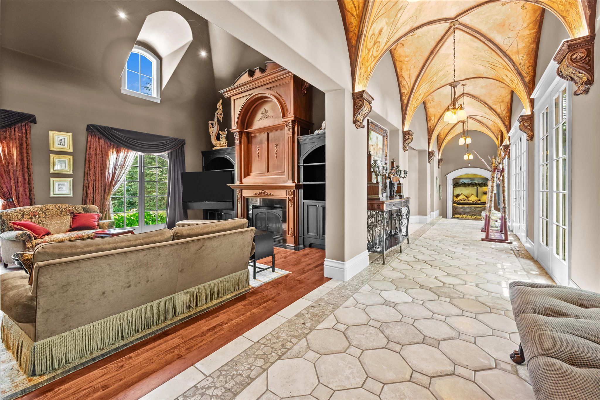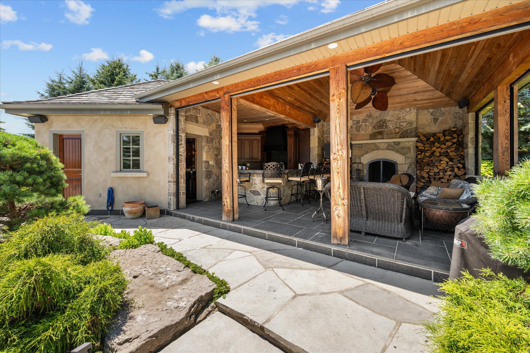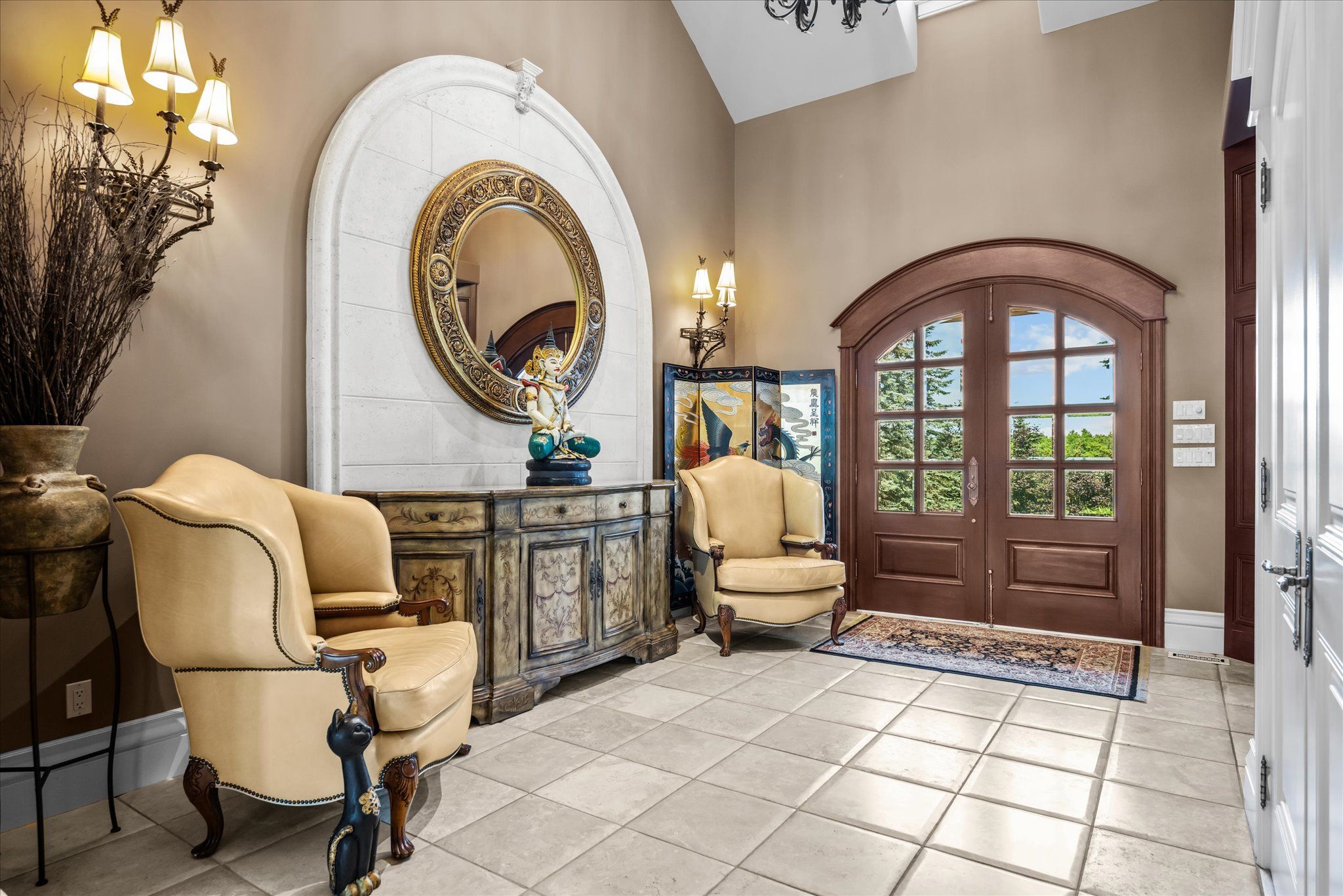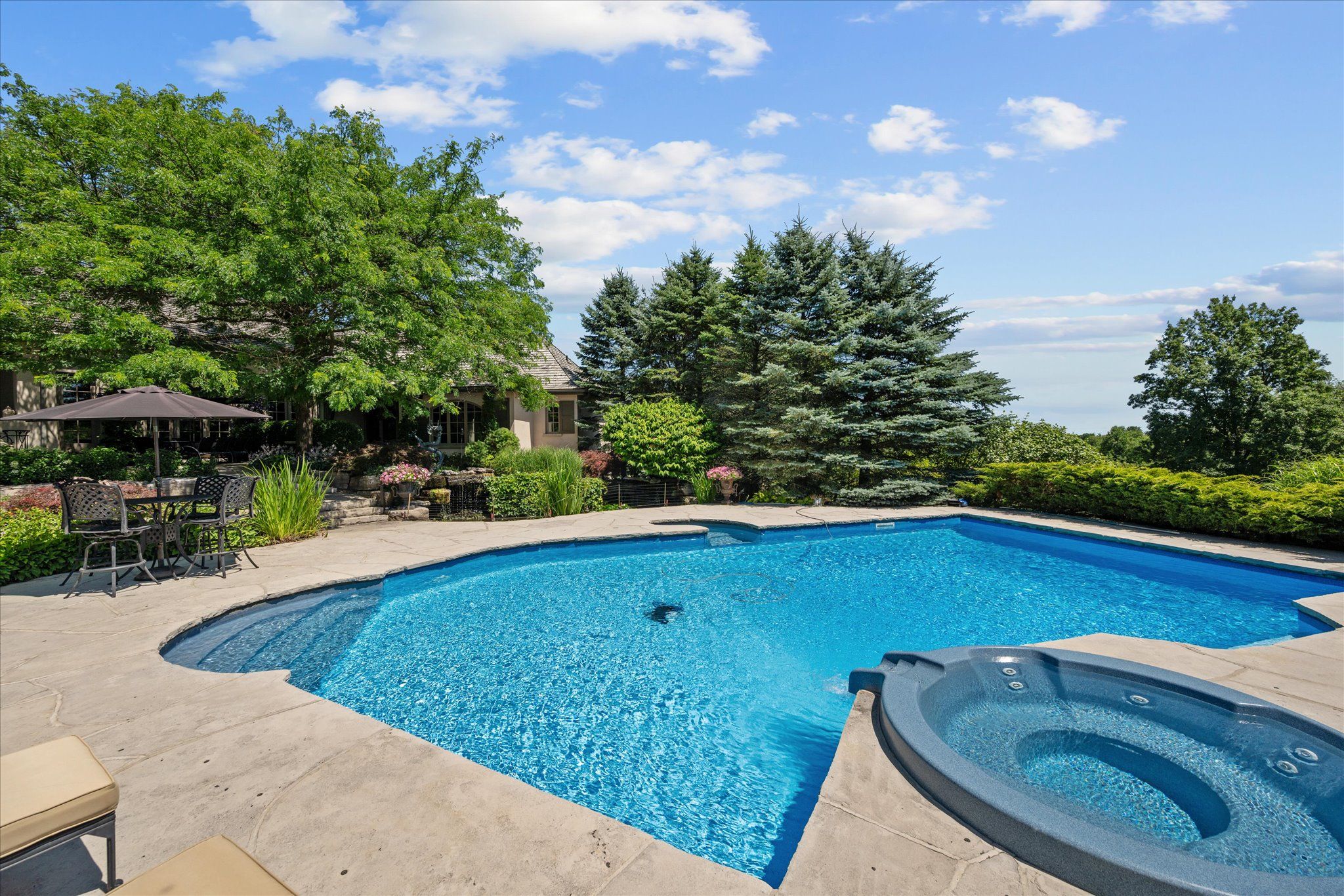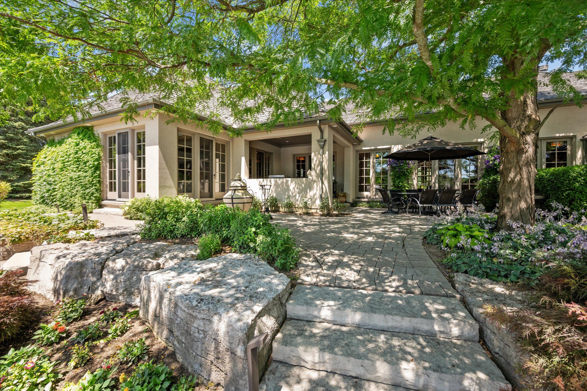 Stonegate manor - an architectural masterpiece! Nestled on 2. 5 acres of manicured grounds behind private gates in prestigious whispering pines estates, stonegate manor is a palatial estate crafted by an award-winning builder. A picturesque pond with fountain greets you at the foot of the driveway, setting the tone for timeless french manor-inspired elegance. A grand foyer with 17. 5-foot cathedral ceiling and hand-painted mural opens to a living room with 18-foot vaulted ceiling, two-storey cherrywood gas fireplace and expansive windows flooding the space with natural light. The chefs kitchen features a 48" wolf gas range, sub-zero fridge, miele dishwasher, servery, and three sets of french doors opening to a private courtyard. The formal dining room connects to a wine cellar with antique asian doors, while a private office with 15-foot vaulted ceiling, gas fireplace and built-ins offers a refined workspace. The luxurious primary suite boasts a 14-foot vaulted ceiling, courtyard walkout, gas fireplace, walk-in closet, gym, and spa-inspired 7-piece ensuite with clawfoot tub and steam shower with built-in chaise. A lofted entertainment area features a 14-foot vaulted ceiling, wet bar, pool table, theatre setup, and powder room. The finished lower level includes heated floors, full kitchen, 3 bedrooms, 2 baths, and walkout to a private patio - ideal for multi-generational living. Resort-style amenities include an inground saltwater pool with integrated hot tub, standalone hot tub, koi pond, and an additional pond with fountain. The cabana features a wood-burning fireplace, kitchen, seating, automatic mosquito screens, 2-piece powder room, and change room. Additional highlights: elevator to all levels, crestron home automation, oversized 3-car garage, and new concrete/asphalt driveway. A rare offering of elegance and lifestyle - just minutes north of campbellville!