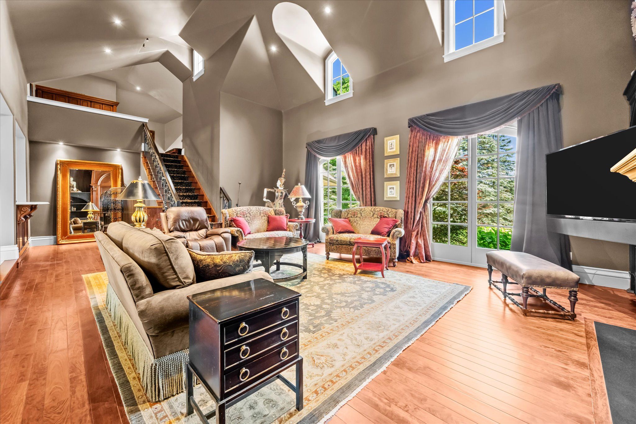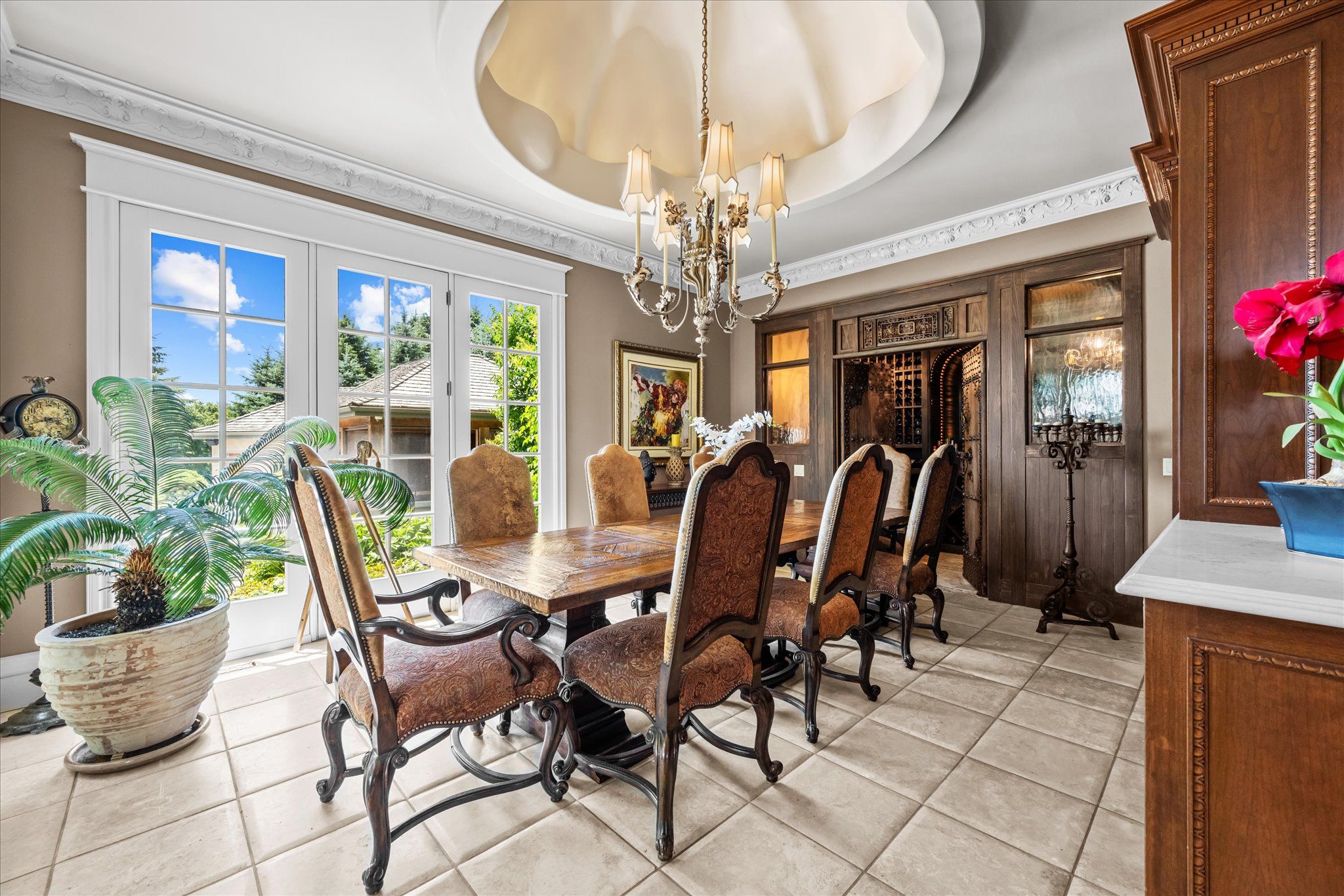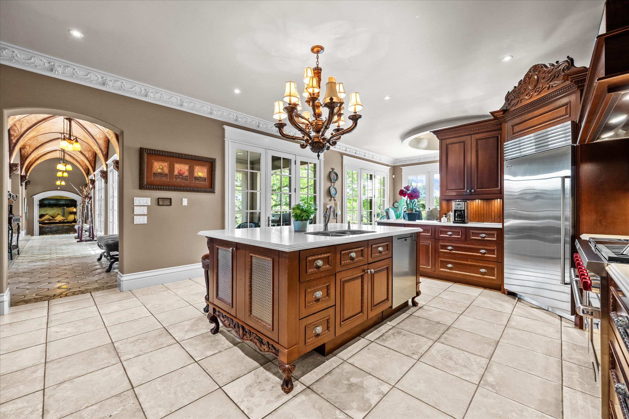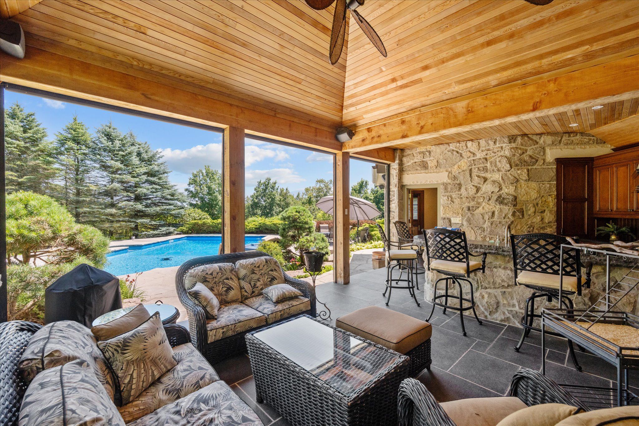 Stonegate manor - an architectural masterpiece! Nestled on 2. 5 acres of manicured grounds behind private gates in prestigious whispering pines estates, stonegate manor is a palatial estate crafted by an award-winning builder. A picturesque pond with fountain greets you at the foot of the driveway, setting the tone for timeless french manor-inspired elegance. A grand foyer with 17. 5-foot cathedral ceiling and hand-painted mural opens to a living room with 18-foot vaulted ceiling, two-storey cherrywood gas fireplace and expansive windows flooding the space with natural light. The chefs kitchen features a 48" wolf gas range, sub-zero fridge, miele dishwasher, servery, and three sets of french doors opening to a private courtyard. The formal dining room connects to a wine cellar with antique asian doors, while a private office with 15-foot vaulted ceiling, gas fireplace and built-ins offers a refined workspace. The luxurious primary suite boasts a 14-foot vaulted ceiling, courtyard walkout, gas fireplace, walk-in closet, gym, and spa-inspired 7-piece ensuite with clawfoot tub and steam shower with built-in chaise. A lofted entertainment area features a 14-foot vaulted ceiling, wet bar, pool table, theatre setup, and powder room. The finished lower level includes heated floors, full kitchen, 3 bedrooms, 2 baths, and walkout to a private patio - ideal for multi-generational living. Resort-style amenities include an inground saltwater pool with integrated hot tub, standalone hot tub, koi pond, and an additional pond with fountain. The cabana features a wood-burning fireplace, kitchen, seating, automatic mosquito screens, 2-piece powder room, and change room. Additional highlights: elevator to all levels, crestron home automation, oversized 3-car garage, and new concrete/asphalt driveway. A rare offering of elegance and lifestyle - just minutes north of campbellville!