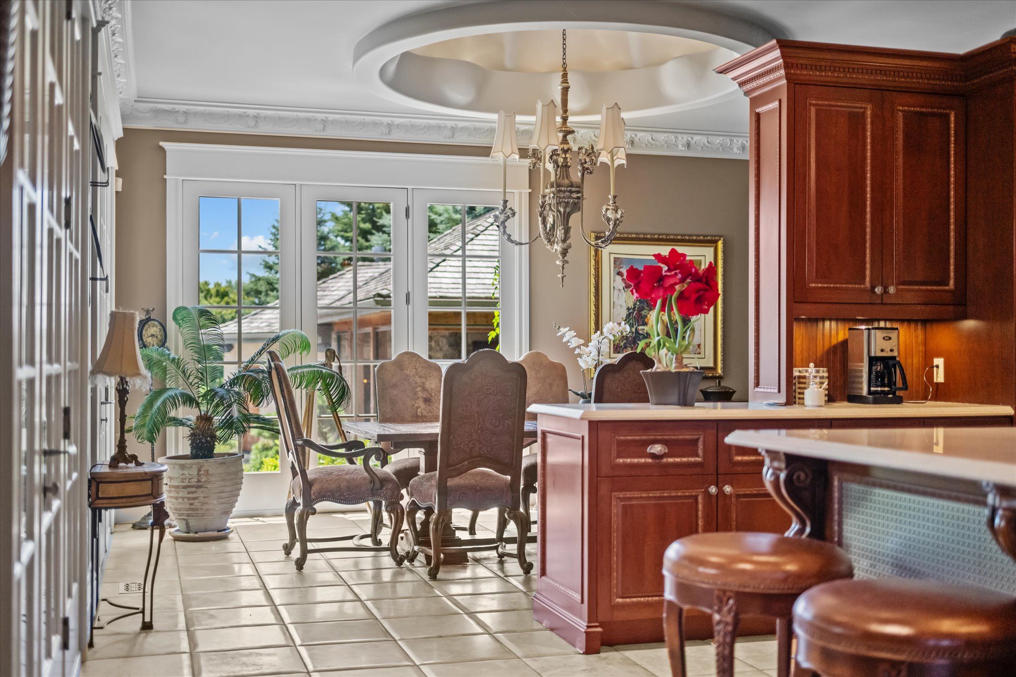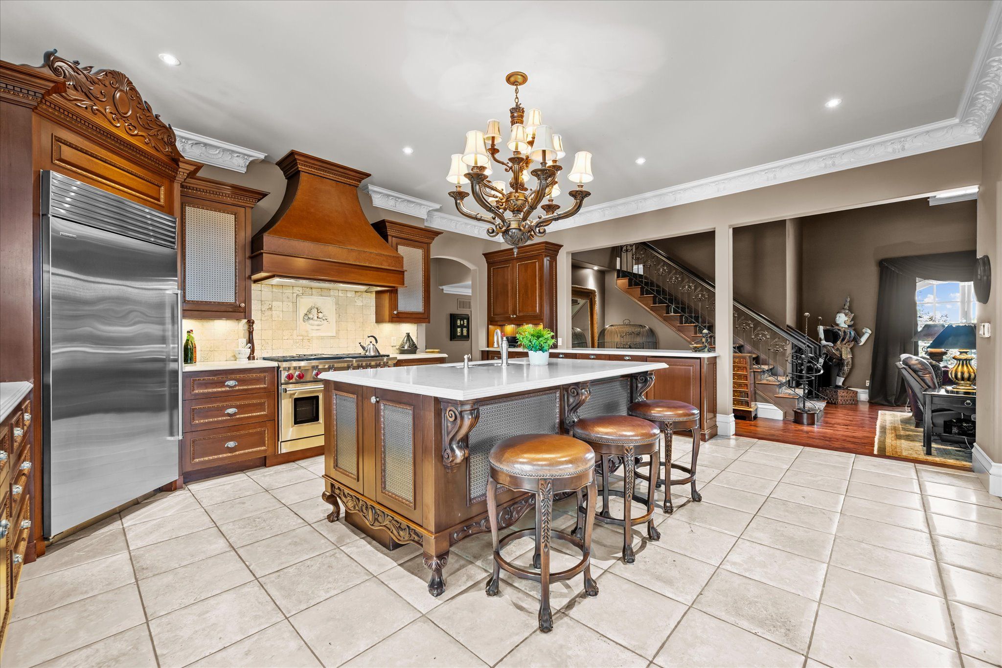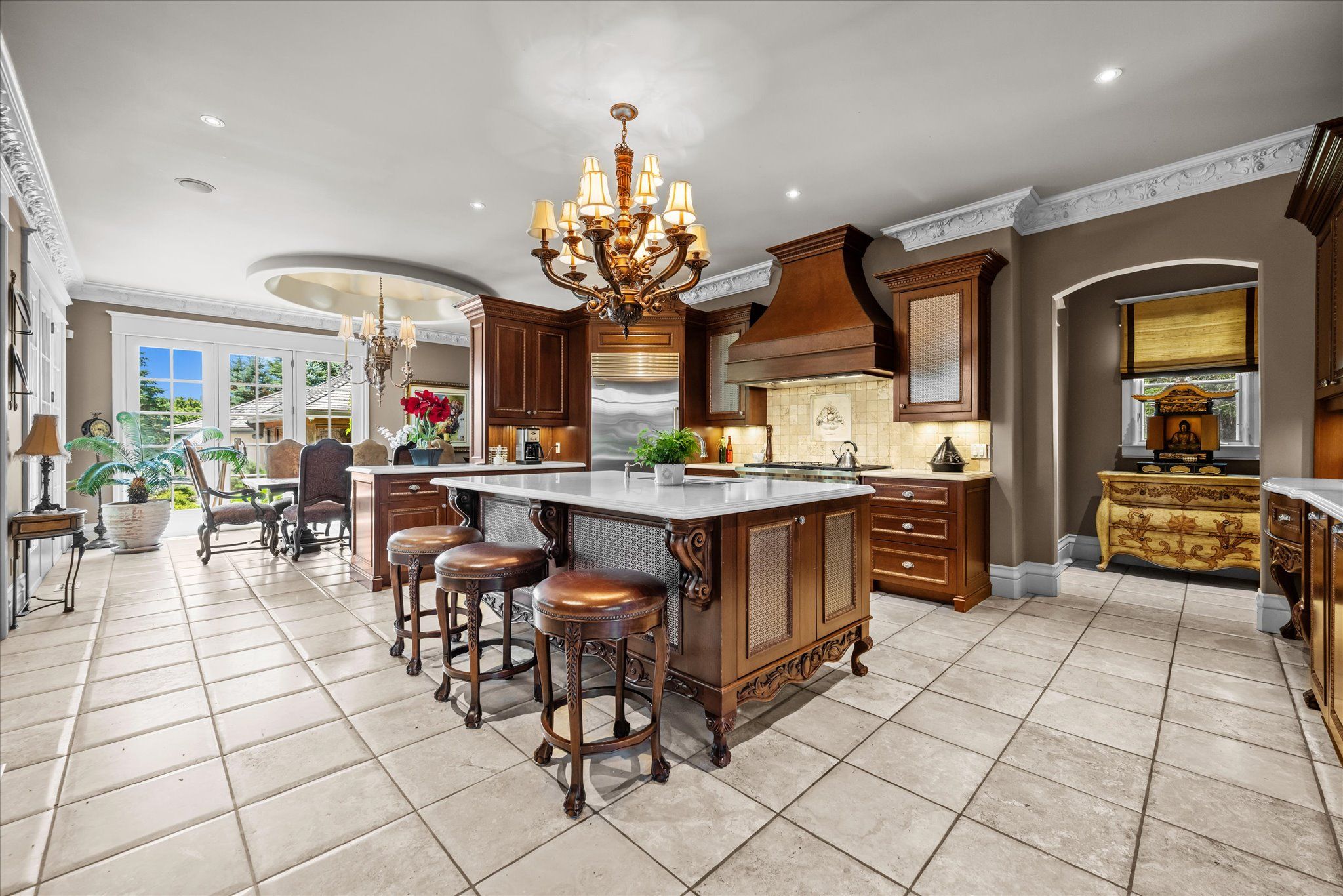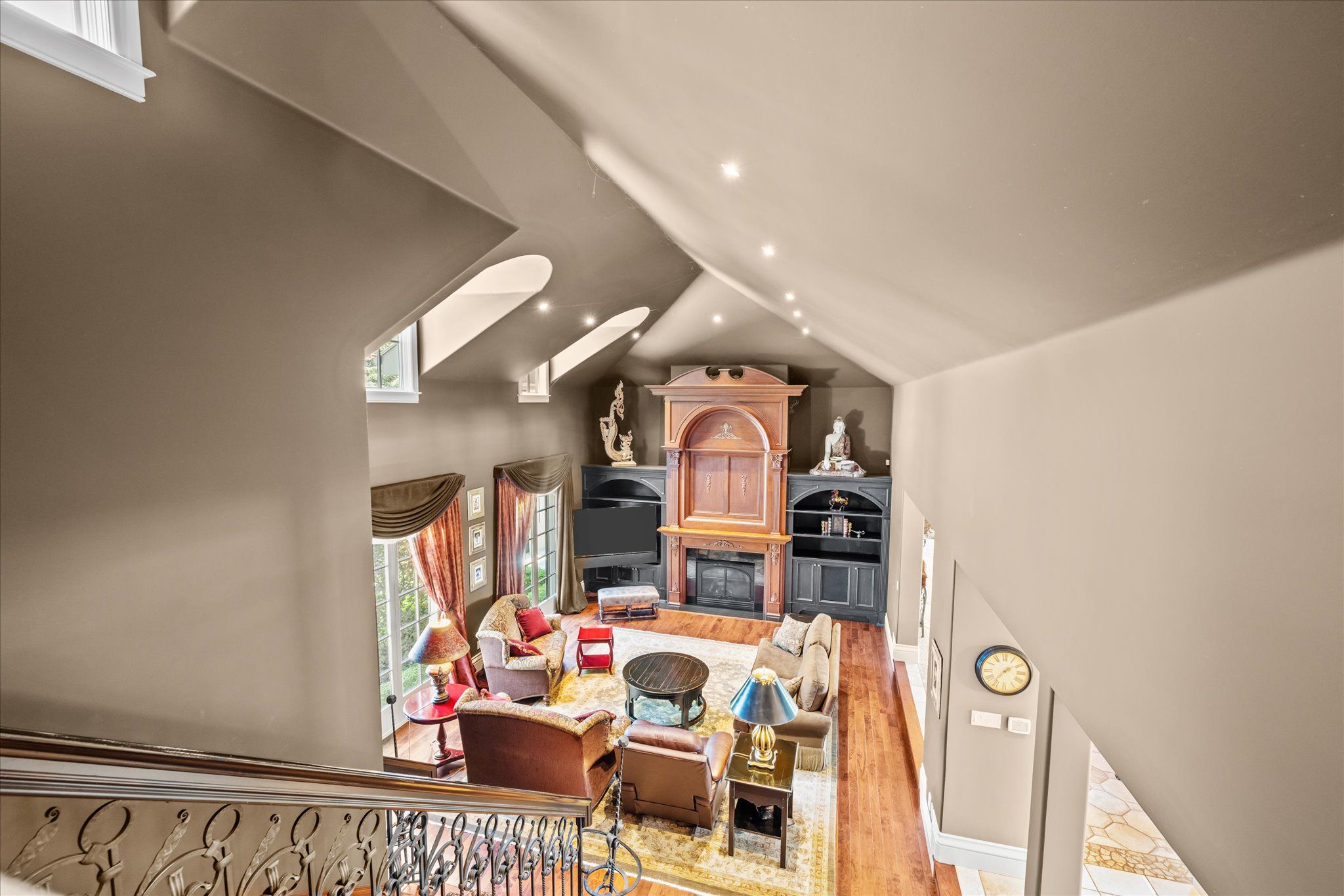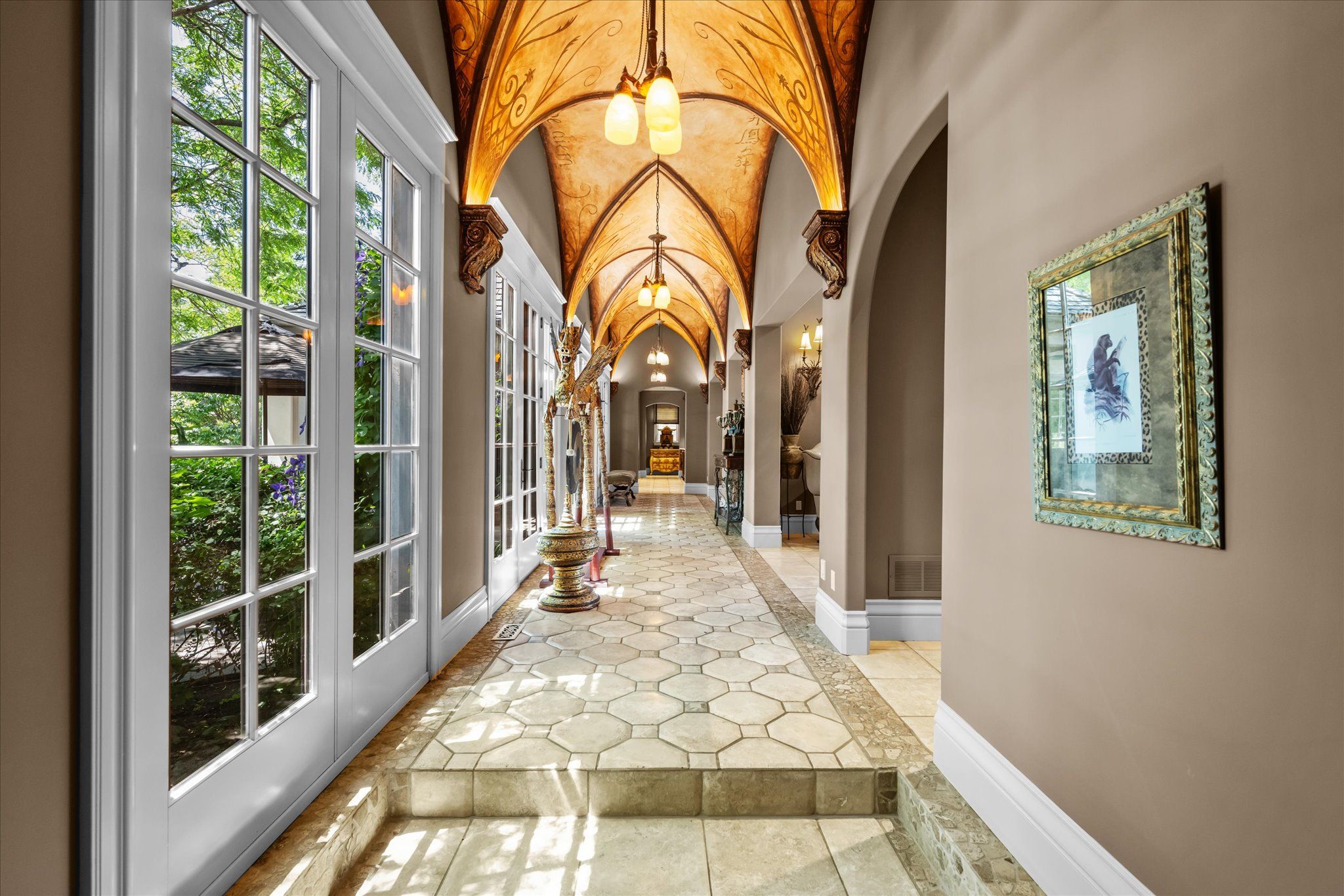 Stonegate manor - an architectural masterpiece! Nestled on 2. 5 acres of manicured grounds behind private gates in prestigious whispering pines estates, stonegate manor is a palatial estate crafted by an award-winning builder. A picturesque pond with fountain greets you at the foot of the driveway, setting the tone for timeless french manor-inspired elegance. A grand foyer with 17. 5-foot cathedral ceiling and hand-painted mural opens to a living room with 18-foot vaulted ceiling, two-storey cherrywood gas fireplace and expansive windows flooding the space with natural light. The chefs kitchen features a 48" wolf gas range, sub-zero fridge, miele dishwasher, servery, and three sets of french doors opening to a private courtyard. The formal dining room connects to a wine cellar with antique asian doors, while a private office with 15-foot vaulted ceiling, gas fireplace and built-ins offers a refined workspace. The luxurious primary suite boasts a 14-foot vaulted ceiling, courtyard walkout, gas fireplace, walk-in closet, gym, and spa-inspired 7-piece ensuite with clawfoot tub and steam shower with built-in chaise. A lofted entertainment area features a 14-foot vaulted ceiling, wet bar, pool table, theatre setup, and powder room. The finished lower level includes heated floors, full kitchen, 3 bedrooms, 2 baths, and walkout to a private patio - ideal for multi-generational living. Resort-style amenities include an inground saltwater pool with integrated hot tub, standalone hot tub, koi pond, and an additional pond with fountain. The cabana features a wood-burning fireplace, kitchen, seating, automatic mosquito screens, 2-piece powder room, and change room. Additional highlights: elevator to all levels, crestron home automation, oversized 3-car garage, and new concrete/asphalt driveway. A rare offering of elegance and lifestyle - just minutes north of campbellville!