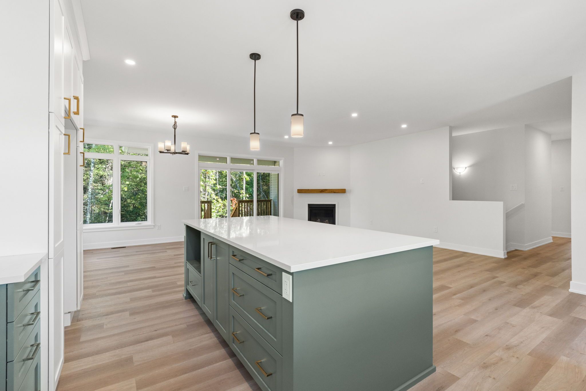 • Kitchen features ample storage, stone countertops, and a large centre island.