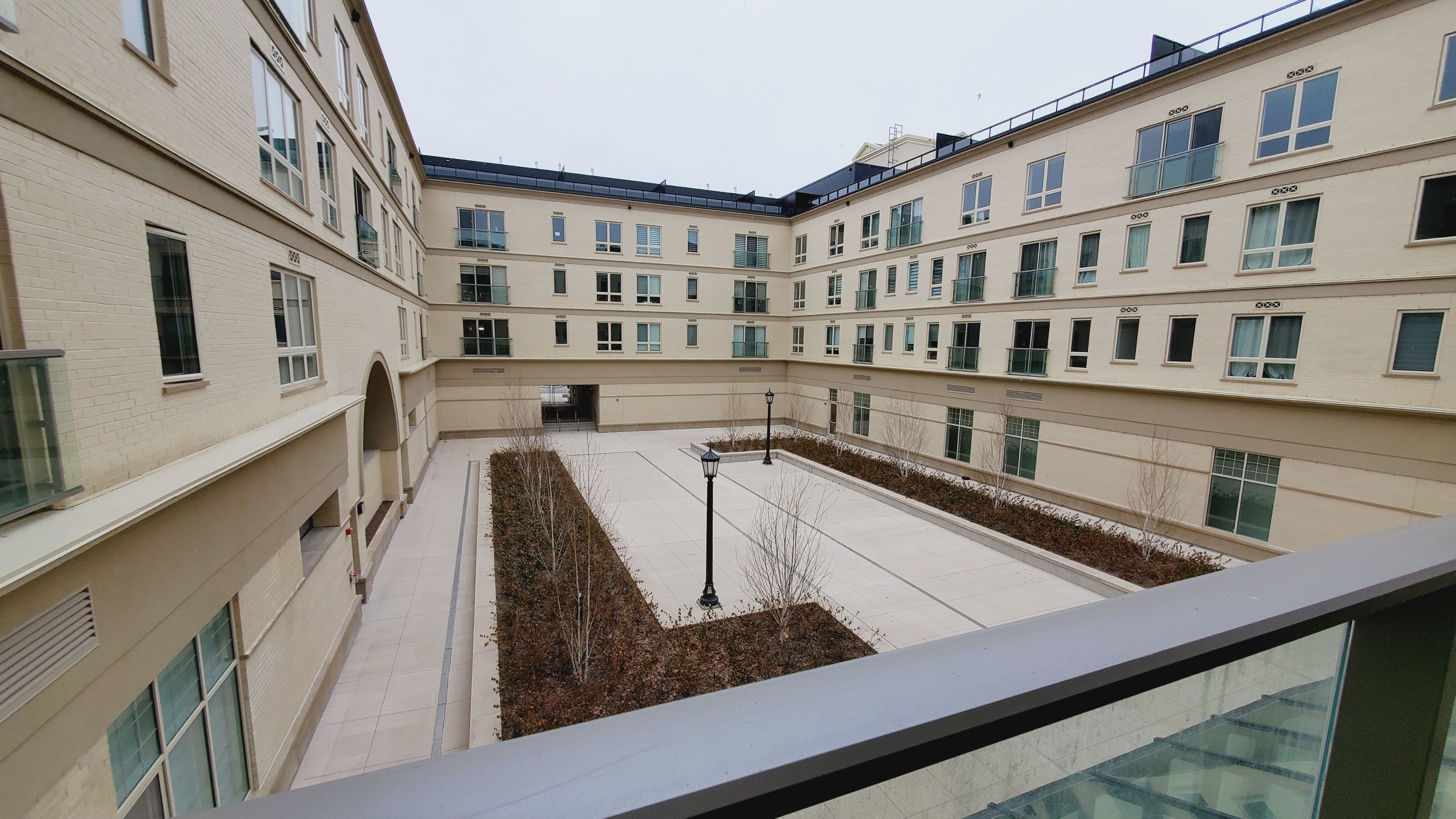 • Juliette balcony overlooking landscaped courtyard garden.