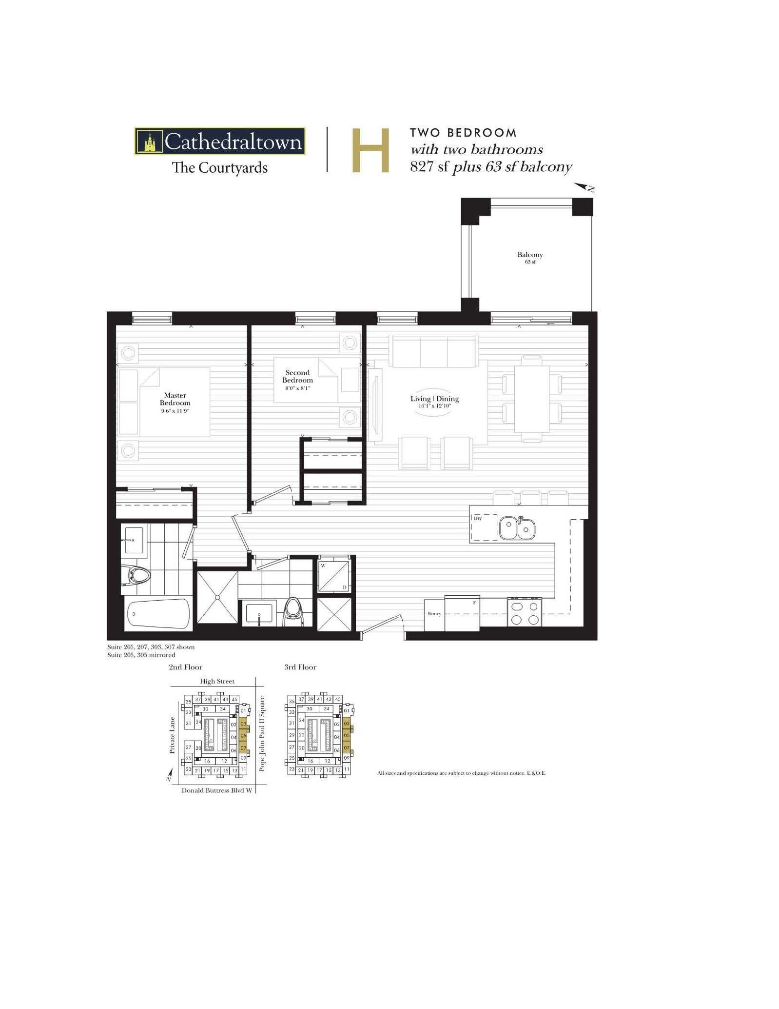 Building is registered! Move in ready! Live in 2-storey elegant architecture of the courtyards in cathedral town! European inspired boutique style condo 5-storey bldg. Unique distinctive designs surrounded by landscaped courtyard/piazza w/patio spaces. This condo features 9ft ceilings, 827 sf of gracious living w/2 bedrooms & 2 baths + w/o balcony with east views, laminate flooring throughout. Close to a cathedral, shopping, public transit & great schools in a very unique one-of-a-kind community. Amenities incl: concierge, visitor parking, exercise rm party/meeting rm, bbq allowed and much more!