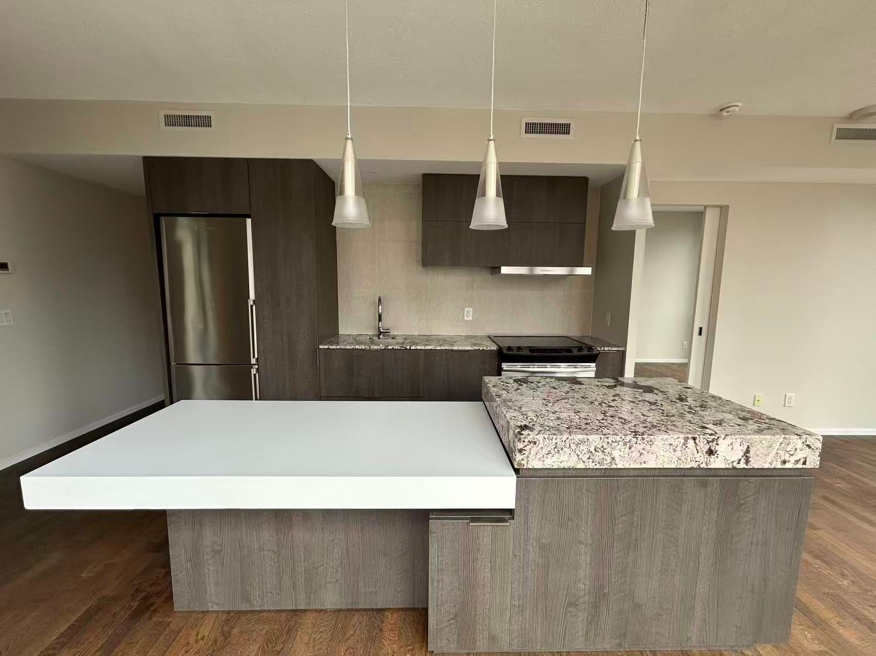 • Modern kitchen features stainless steel appliances and an island.
