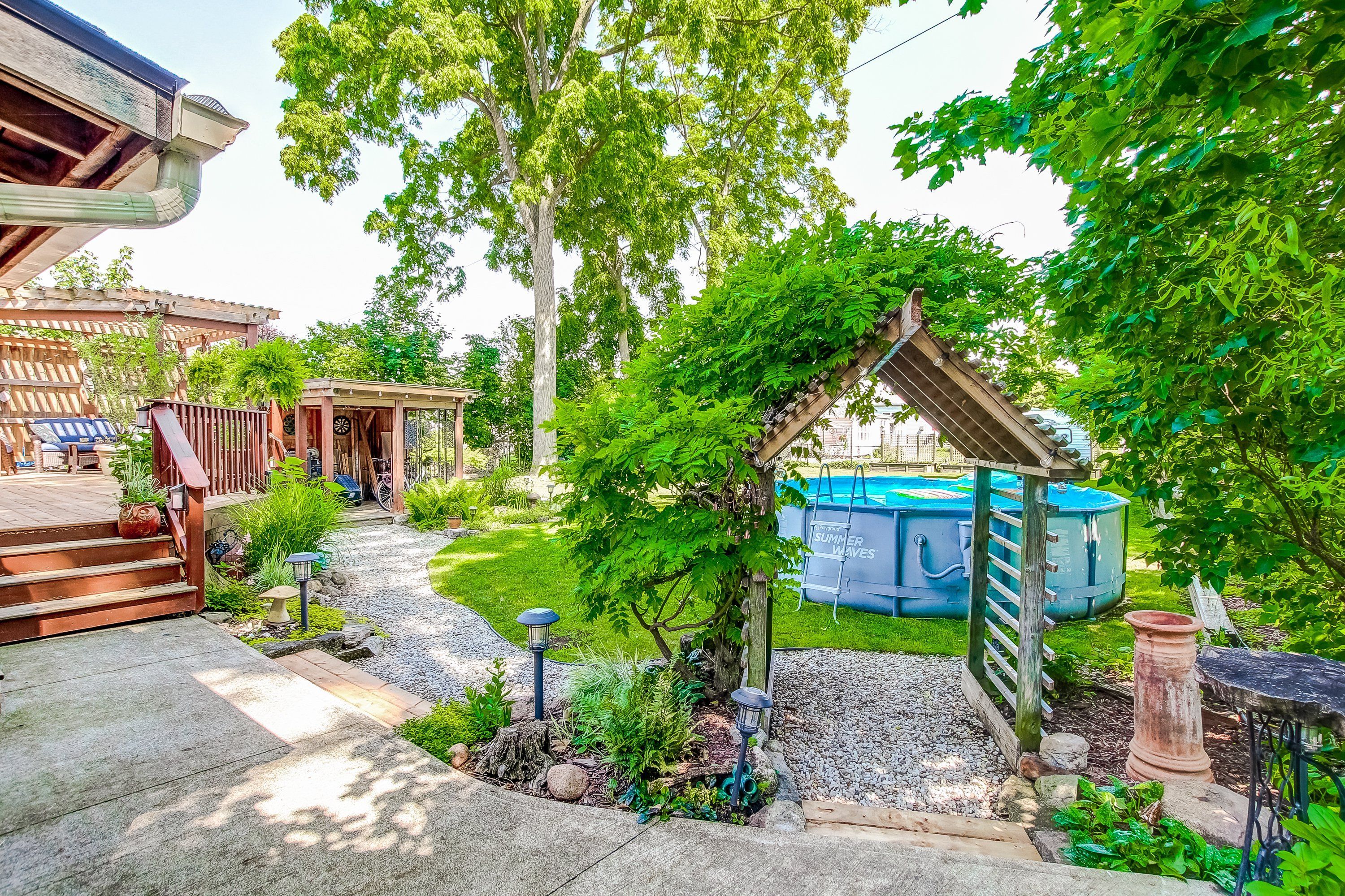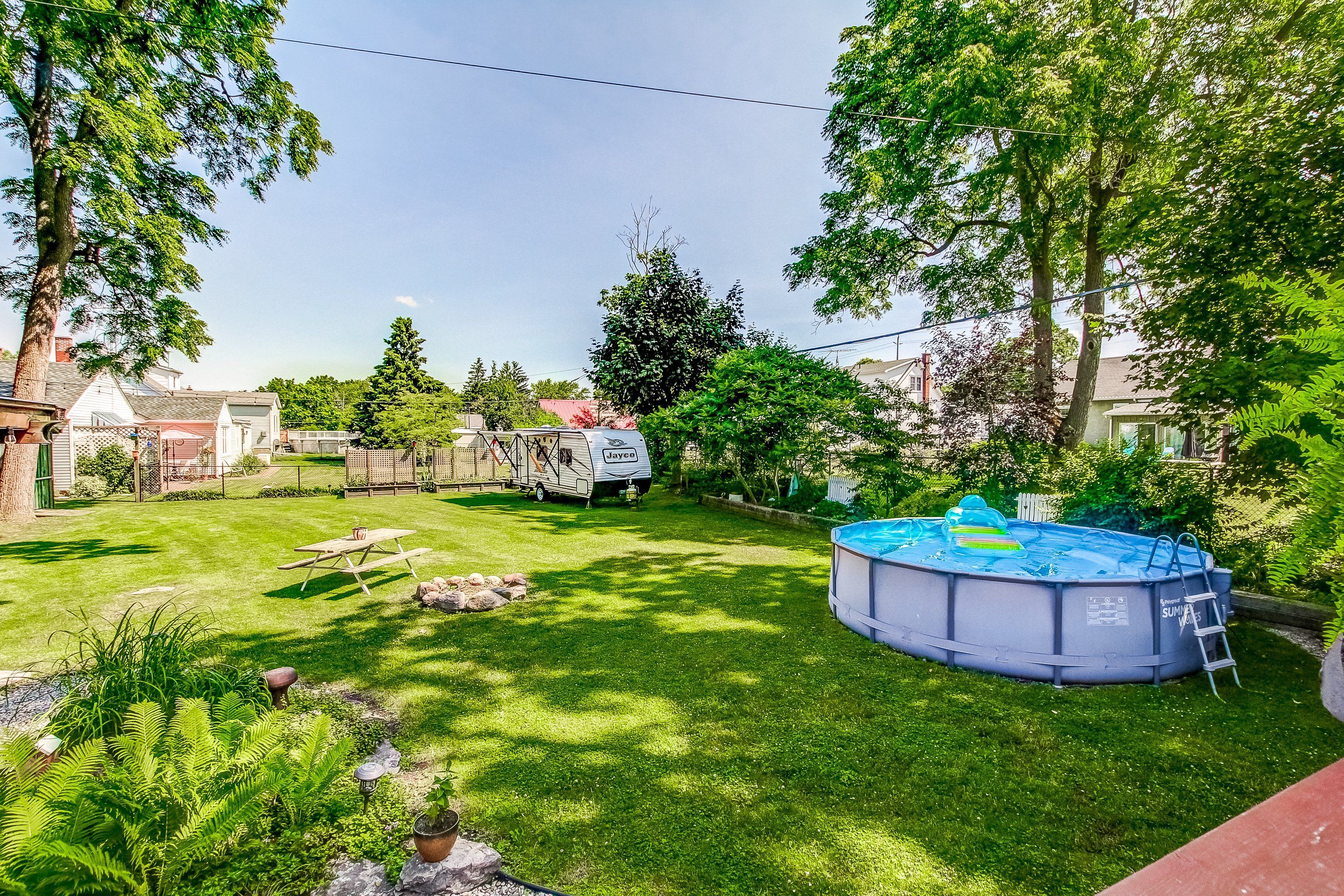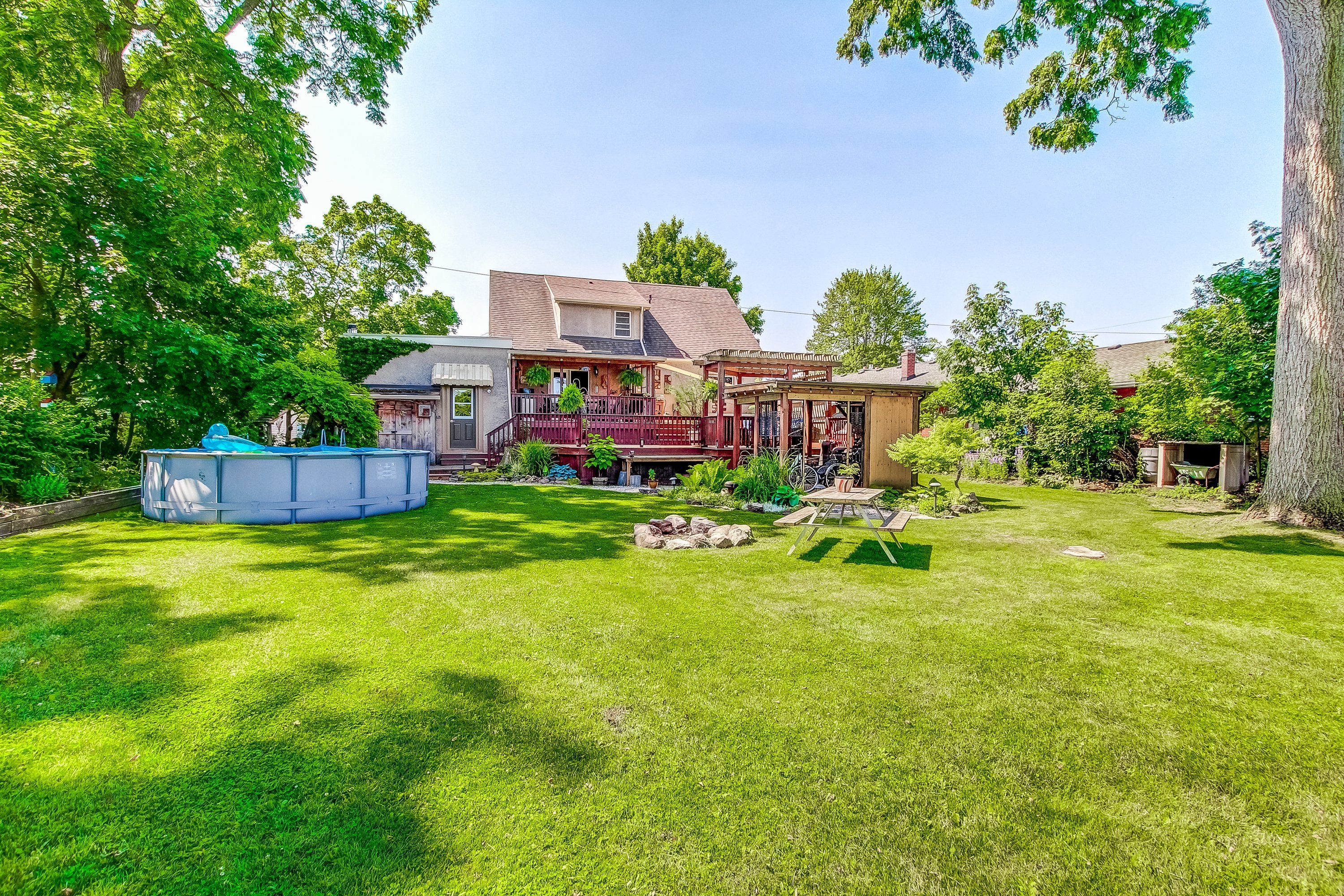 Discover the perfect blend of character, comfort, and outdoor space in this charming 3-bedroom, 2-bathroom home set on an impressive 80x187 foot lot. Ideal for those who need room to roam, this property offers excellent access to the rear yard perfect for trailers, storage, or a future shop. Step inside to a welcoming eat-in kitchen, complemented by formal dining and living rooms ideal for hosting family gatherings. The main floor also features a convenient primary bedroom, offering one-floor living flexibility. The high and dry basement includes a walk-up to the attached extra-tall garage, providing both functionality and potential for future development. Outside, multiple entertaining areas are perfect for summer get-togethers, including a private hot tub zone for year-round relaxation. Whether you're enjoying quiet evenings under the stars or entertaining a crowd, this backyard was made to be enjoyed. With a great layout, versatile spaces, and an unbeatable lot size, this property is a rare opportunity that combines classic charm with incredible potential. Recent updates include : central air (2024), upstairs bathroom update (2024), gas fireplace (2021), roof shingles (2013 with transferrable warranty), furnace (2014).