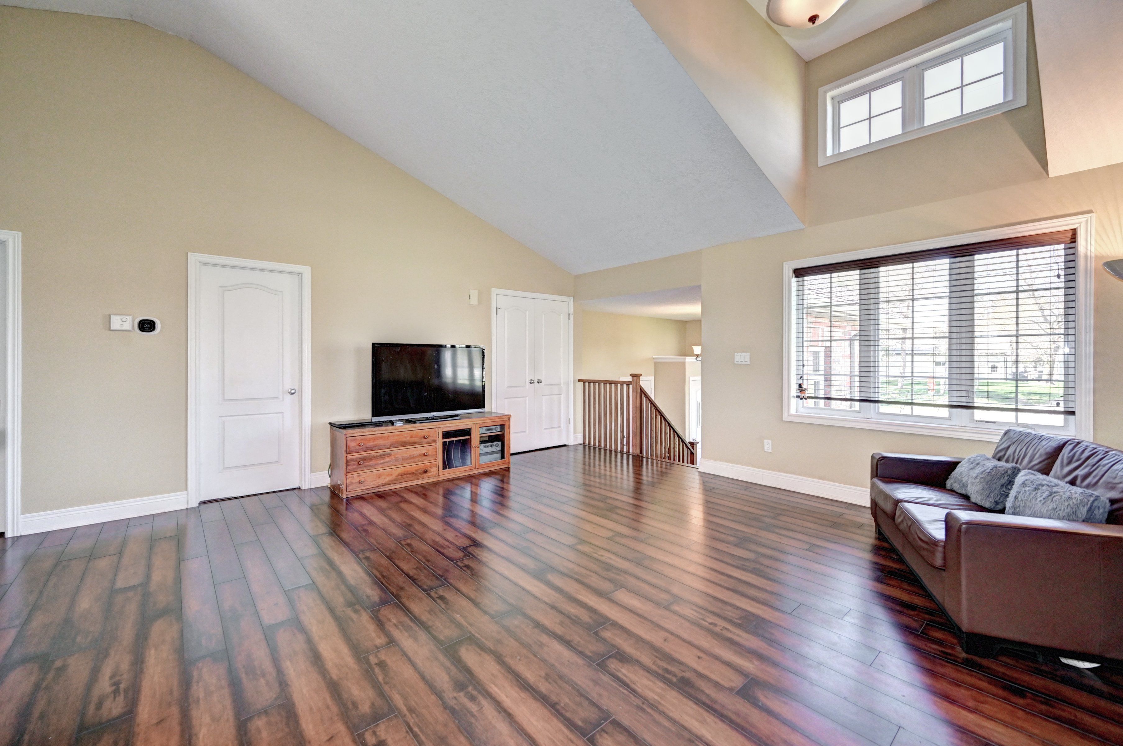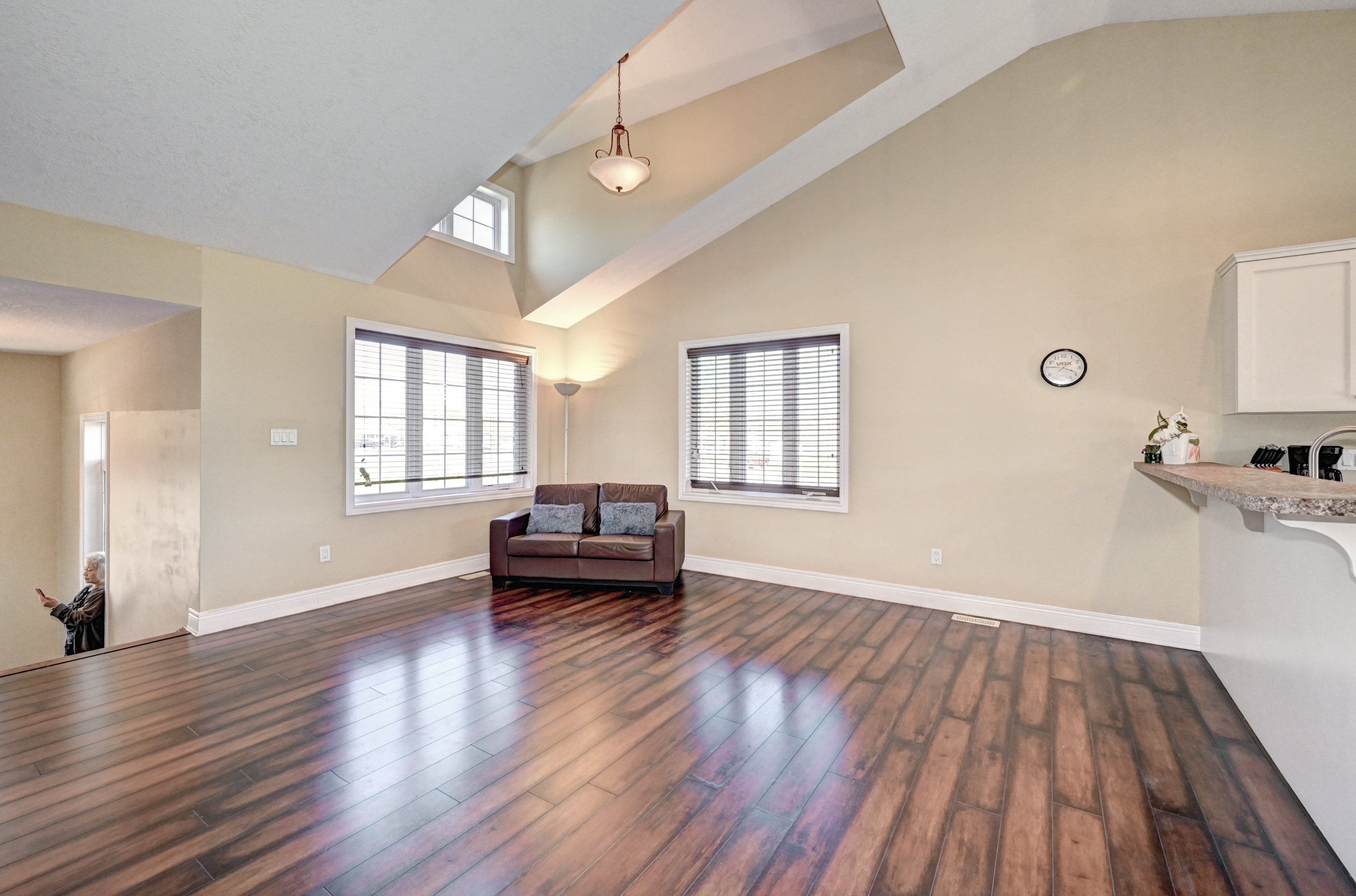 • Bright, open-concept living area with natural wood-inspired flooring.