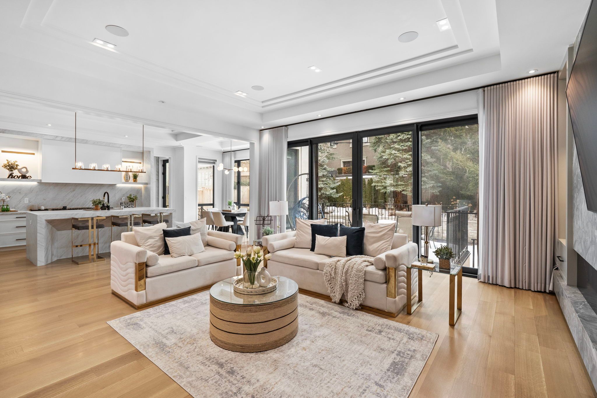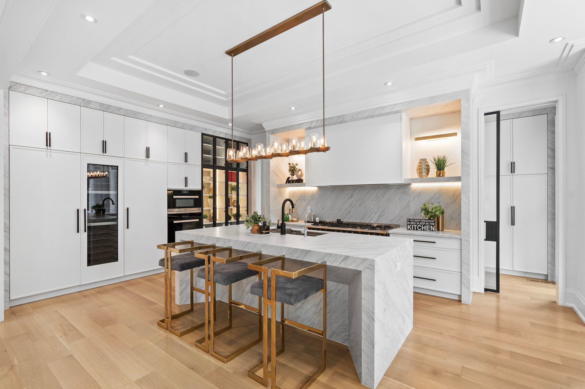 An extraordinary custom luxury residence showcasing impeccable design, grand proportions, and refined finishes throughout. This stunning home offers private elevator access to all three levels, delivering convenience wrapped in sophistication. The main floor presents an exceptional layout designed for upscale living and elegant entertaining. A spectacular chef-inspired kitchen is complemented by a fully appointed spice kitchen, ideal for seamless hosting. Expansive principal rooms include a formal living room and a richly appointed family room - each featuring its own fireplace, creating warm and inviting yet distinguished spaces. The formal dining room is perfectly positioned for elevated gatherings, while the sunlit breakfast area overlooks the heart of the home. A private executive office offers a quiet and refined workspace. Upstairs, the second level hosts four generously sized bedrooms. The opulent primary retreat is a true sanctuary, complete with its own fireplace and a lavish 6-piece spa-inspired ensuite designed for ultimate relaxation. Each of the three additional bedrooms features its own private 4-piece ensuite bath, offering comfort and privacy for family and guests. A beautifully designed hallway alcove adds architectural charm and a versatile lounge or reading space. The fully finished lower level is designed for premium entertaining and leisure. A grand recreation room with a striking fireplace and built-in bar creates the perfect setting for upscale gatherings. Enjoy an immersive experience in the dedicated media room, showcase your collection in the elegant wine cellar, and accommodate guests with an additional bedroom on this level. Every detail of this residence reflects timeless elegance, thoughtful design, and elevated luxury living. A rare offering crafted for the most discerning buyer seeking sophistication, comfort, and architectural excellence.