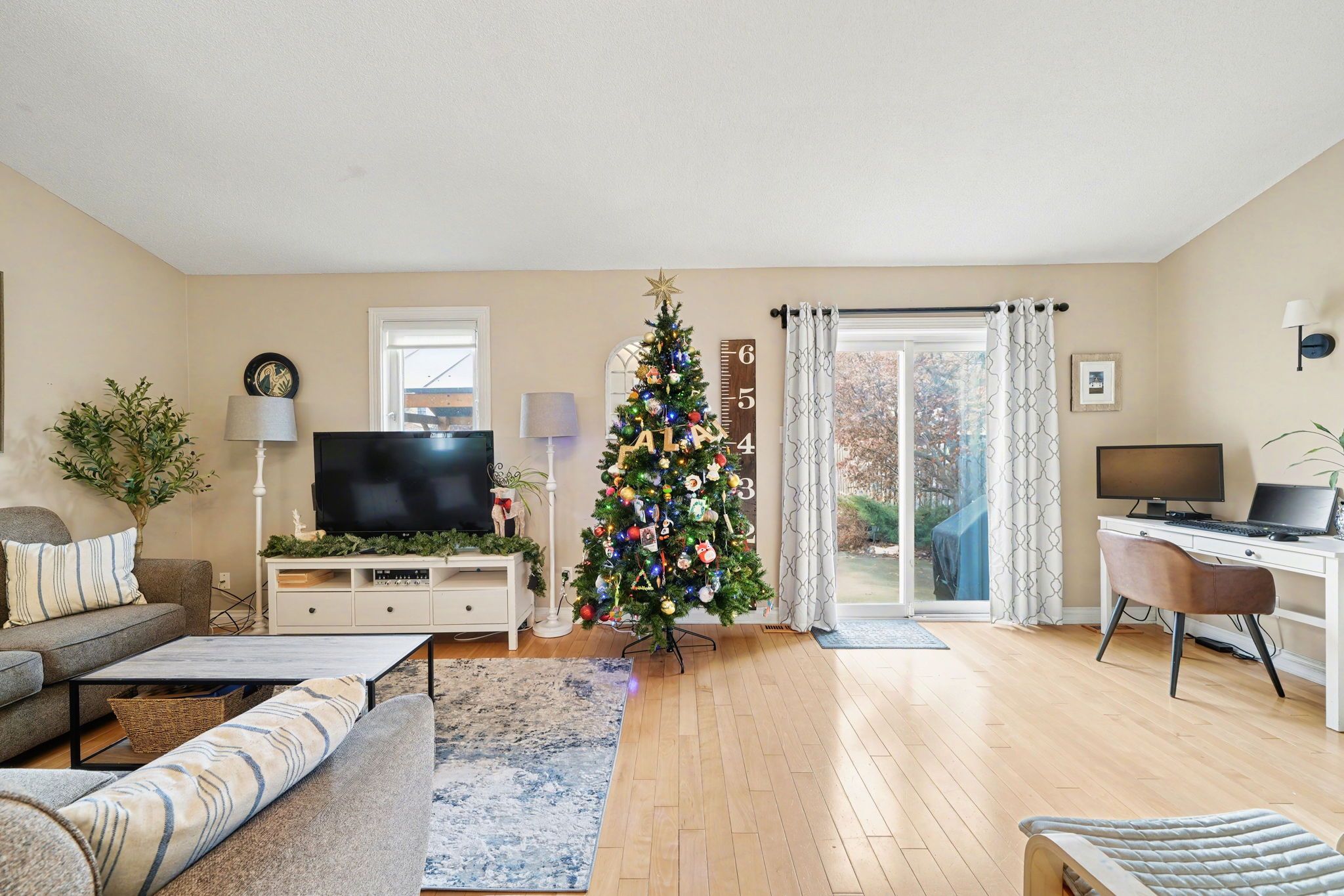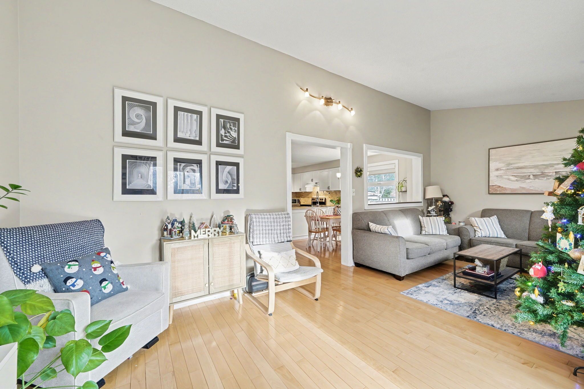 • Living room features natural light, a cathedral ceiling, and a private deck.