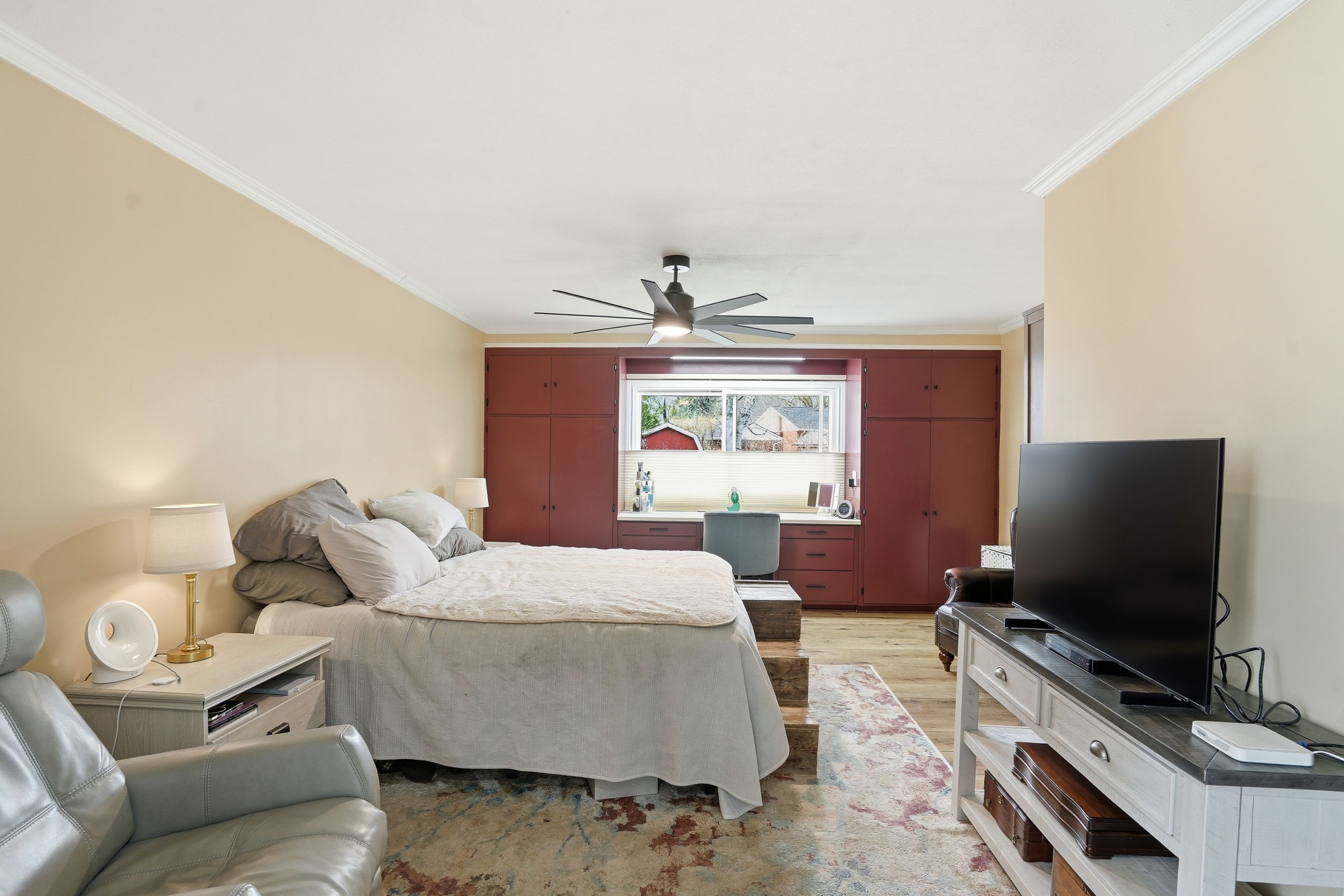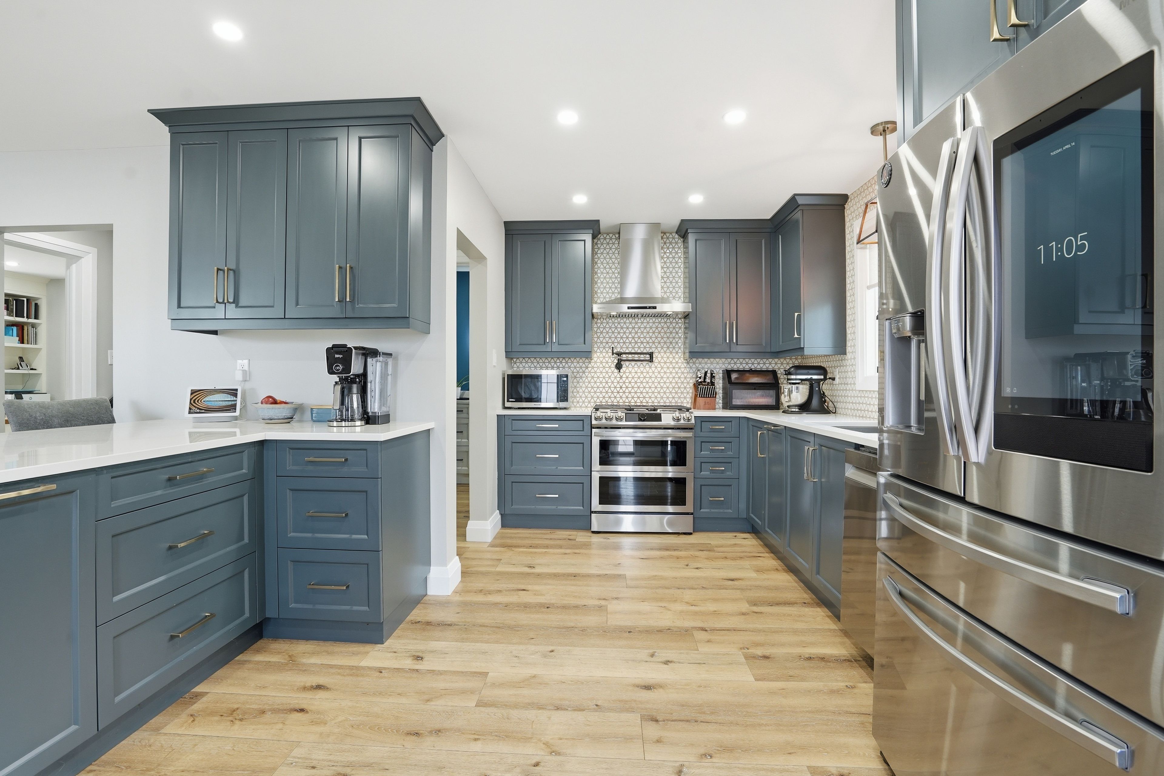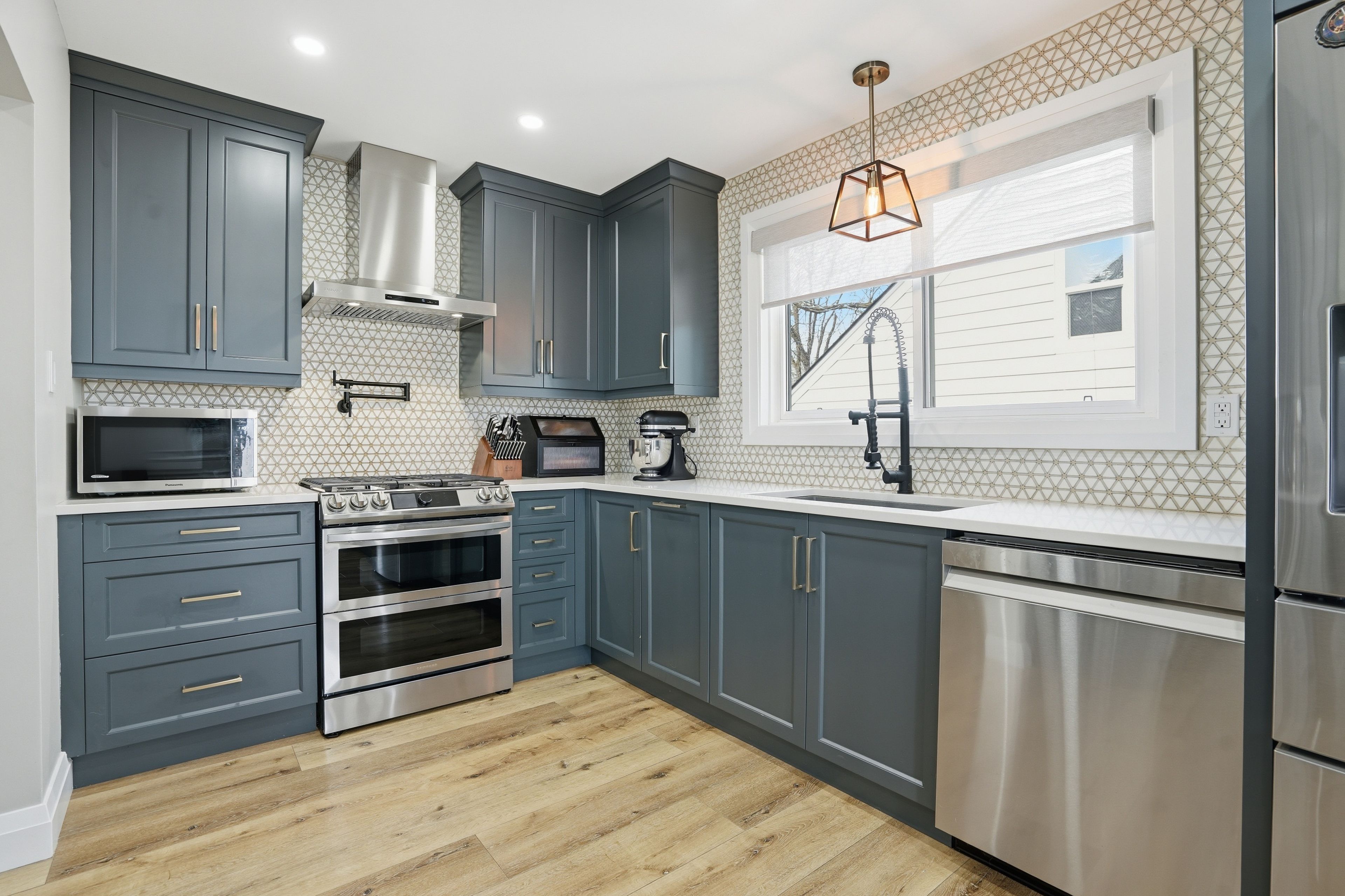 • Chef's kitchen features quartz counters, large island, and stainless steel appliances.